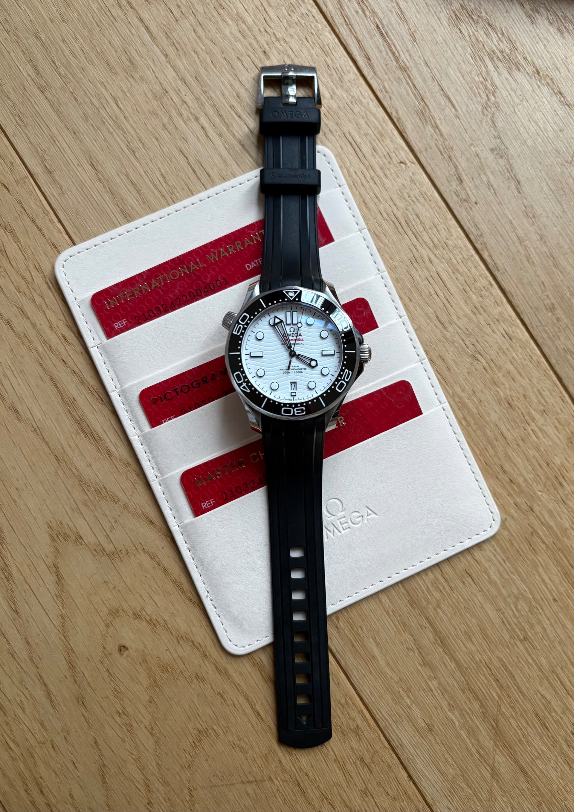 Hele mooie Seamaster 300m met witte plaat. Het horloge is in oktober 2021 gekocht. Ik heb 'm een maand geleden overgenomen, maar heb jammer genoeg geen klik met die witte plaat. Dus als er op het forum een liefhebber is, mag deze Seamaster weer weg. Het horloge heeft nog een klein jaar garantie. Liever geen inruilvoorstellen, tenzij het een Rolex GMT is (uiteraard cash-up van mijn kant).