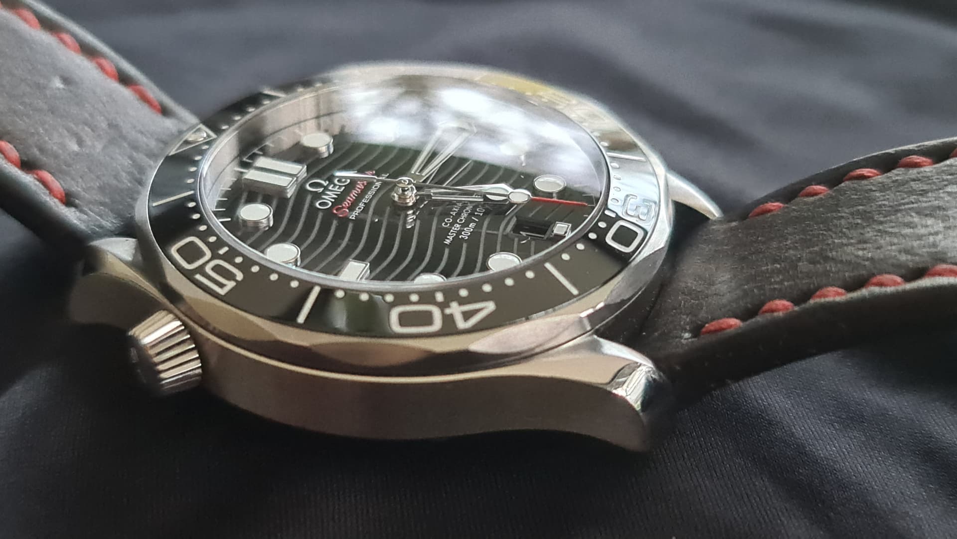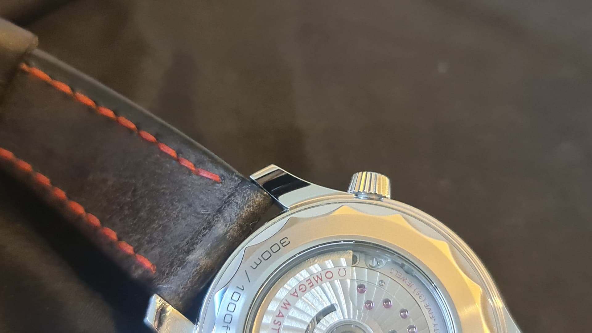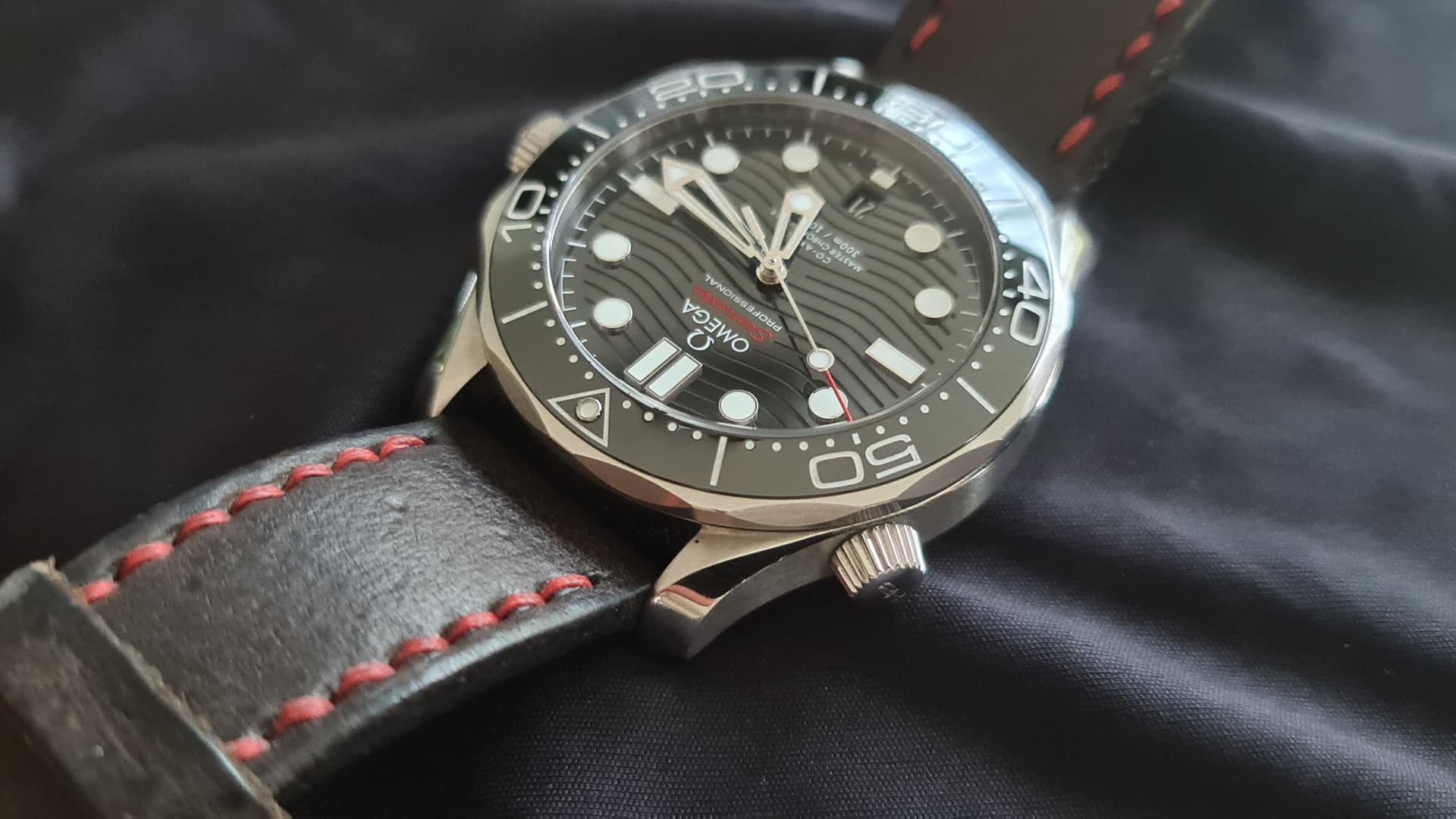 Deze Seamaster wordt geleverd op de originele rubberen band. Zelf droeg ik het op leer of sailcloth.