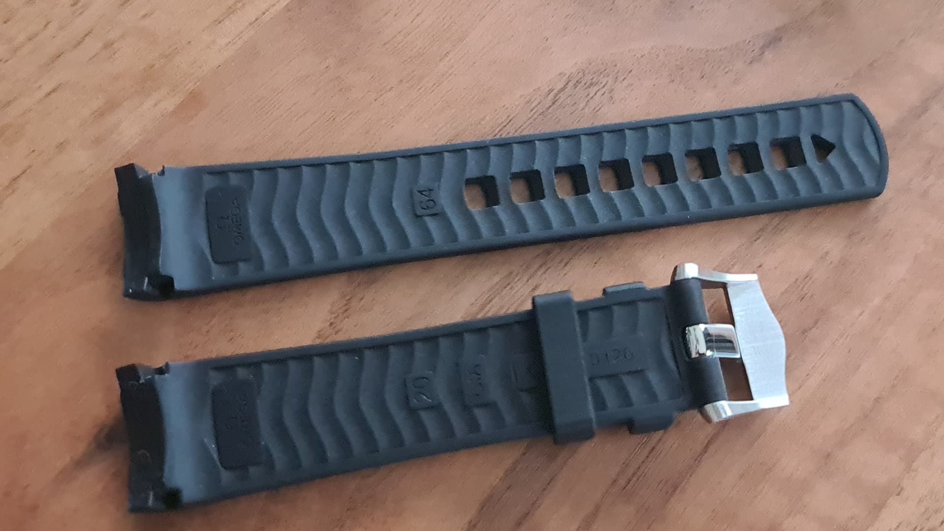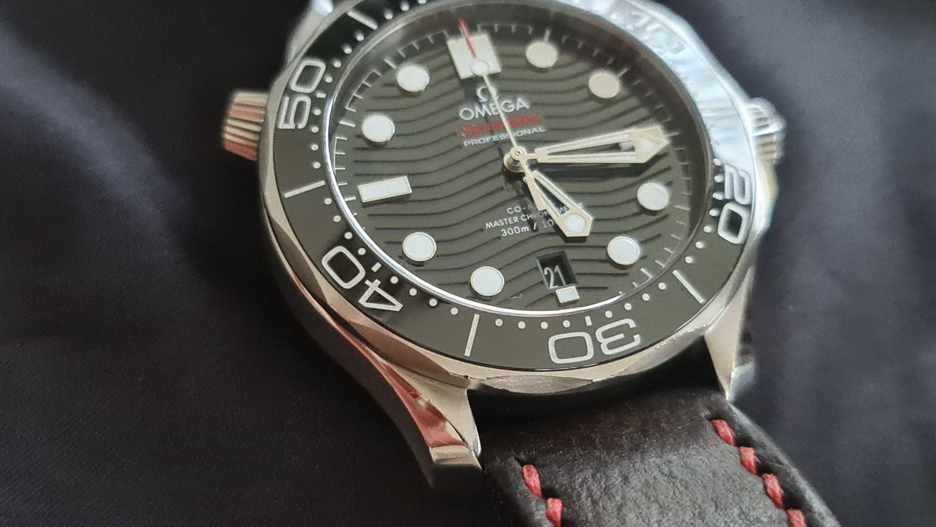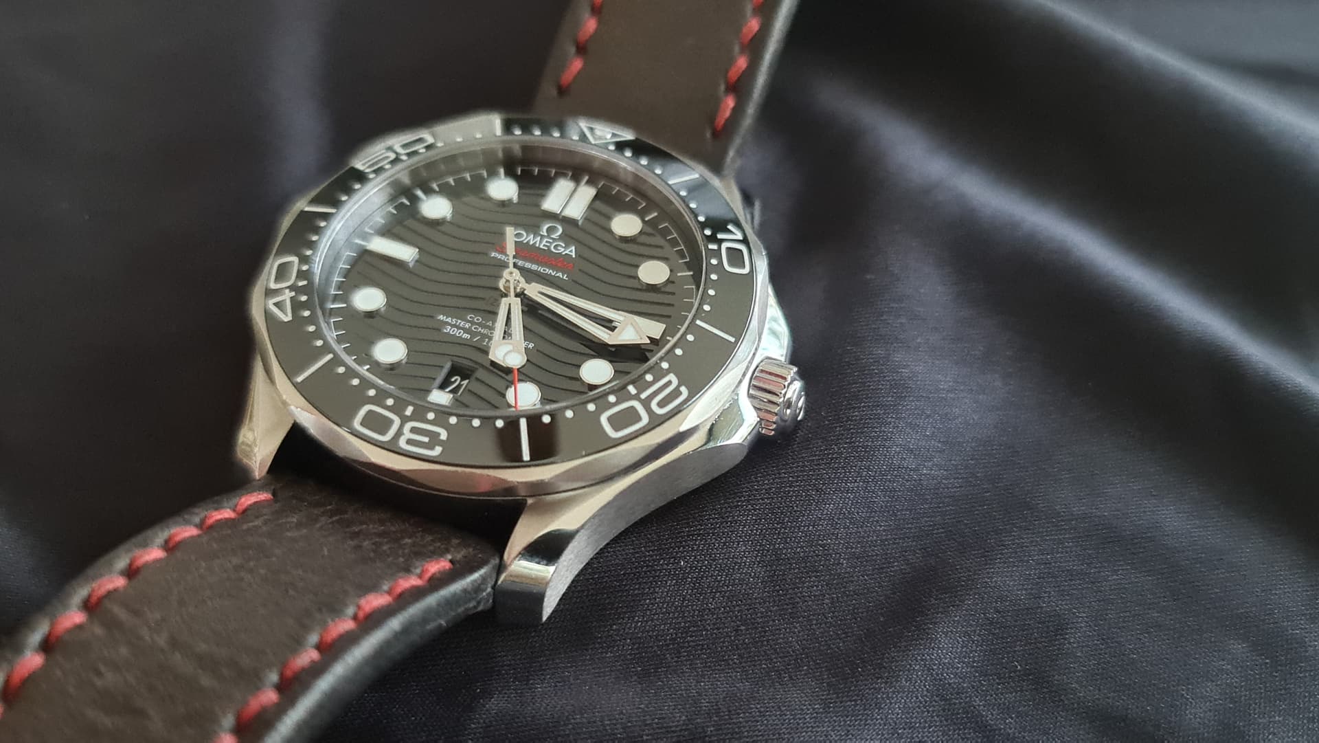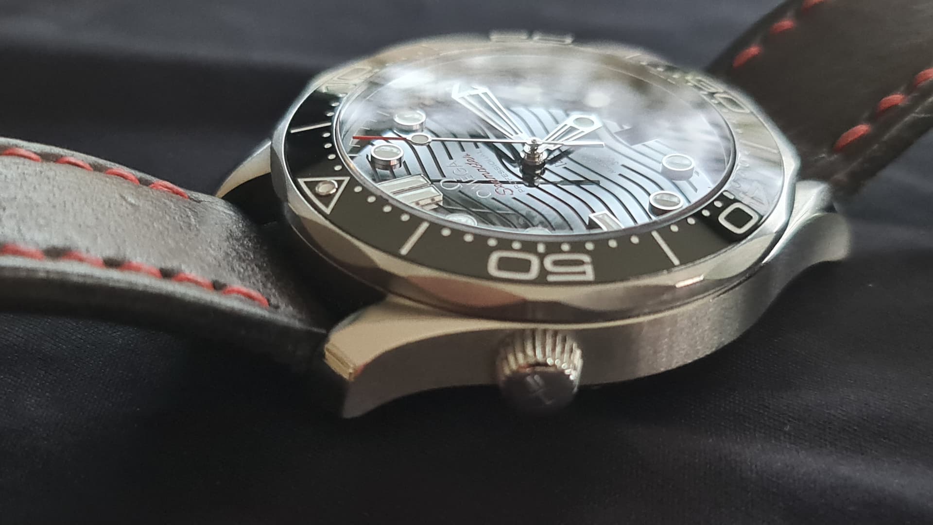 Deze Seamaster wordt geleverd op de originele rubberen band. Zelf droeg ik het op leer of sailcloth.