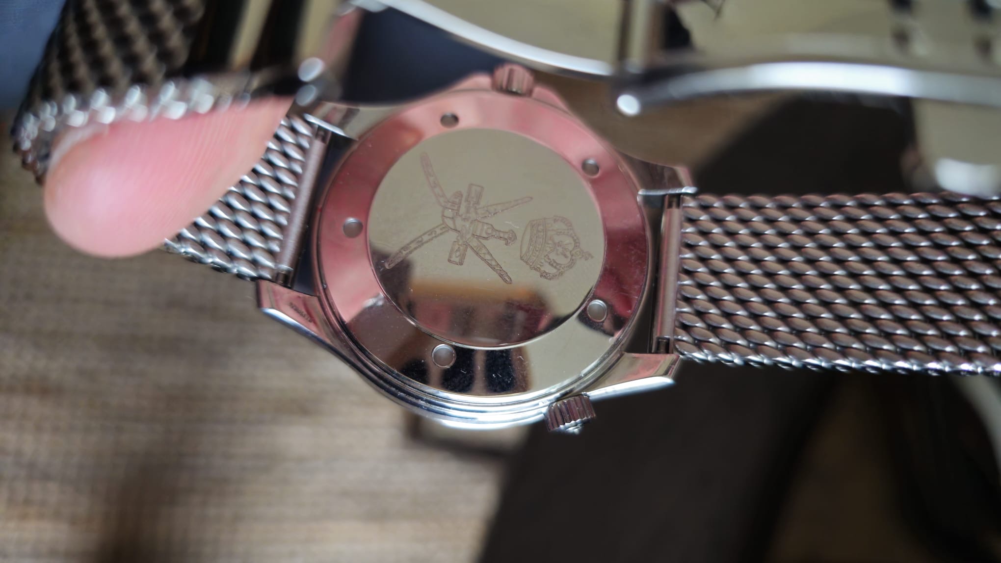 Het horloge zelf is echt. Lumepip, waves, datum uitlijning, helium valve zit iets rechts van de 10 positie, tekst ziet er goed uit, goed uitgelijnd ook, de bezel is ook heel netjes. Dat klopt allemaal wel. Van die inscripties heb ik geen kaas gegeten. Geen papieren erbij? Ik denk: een inscriptie zou iemand nog wel kunnen maken, maar om dan helemaal zo’n doos erbij te laten maken… Ik zou het wel aandurven. Maarja mensen verschillen in de mate waarin ze dergelijk risico willen (en kunnen) lopen.