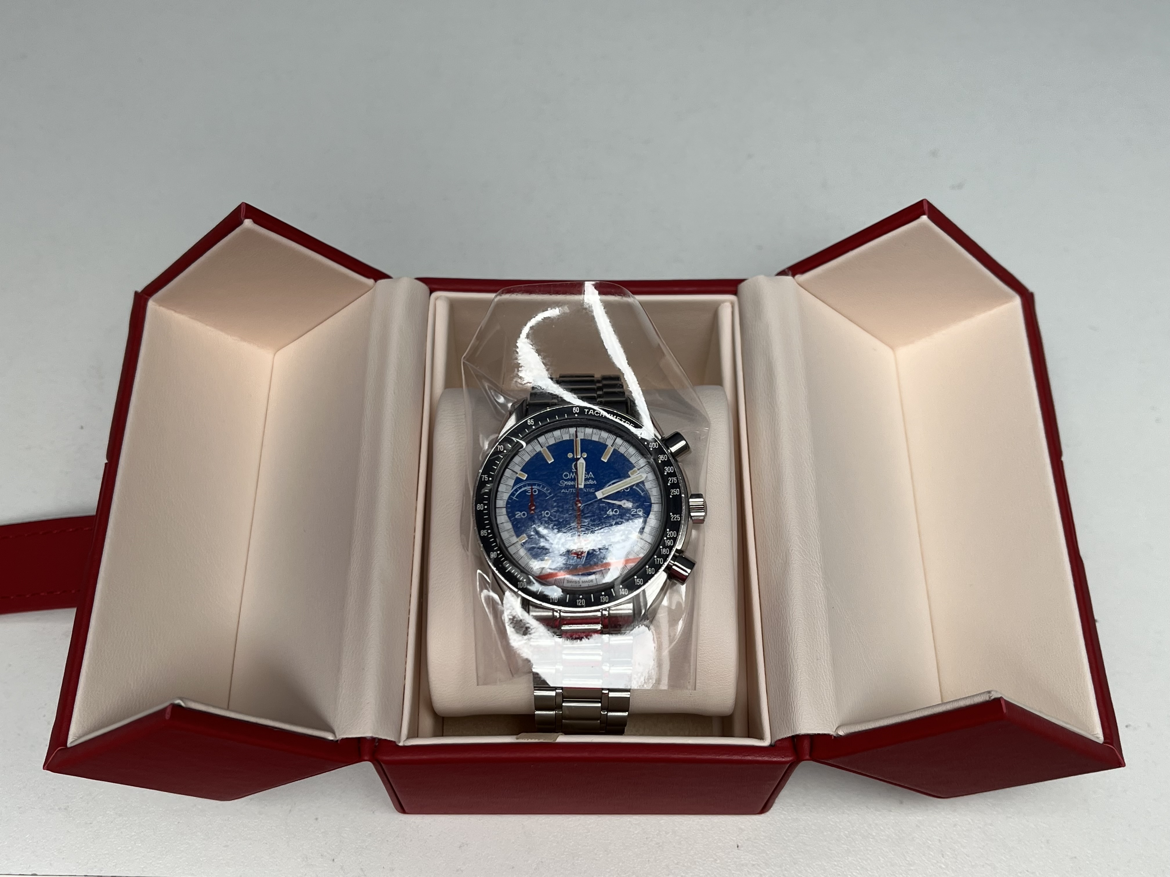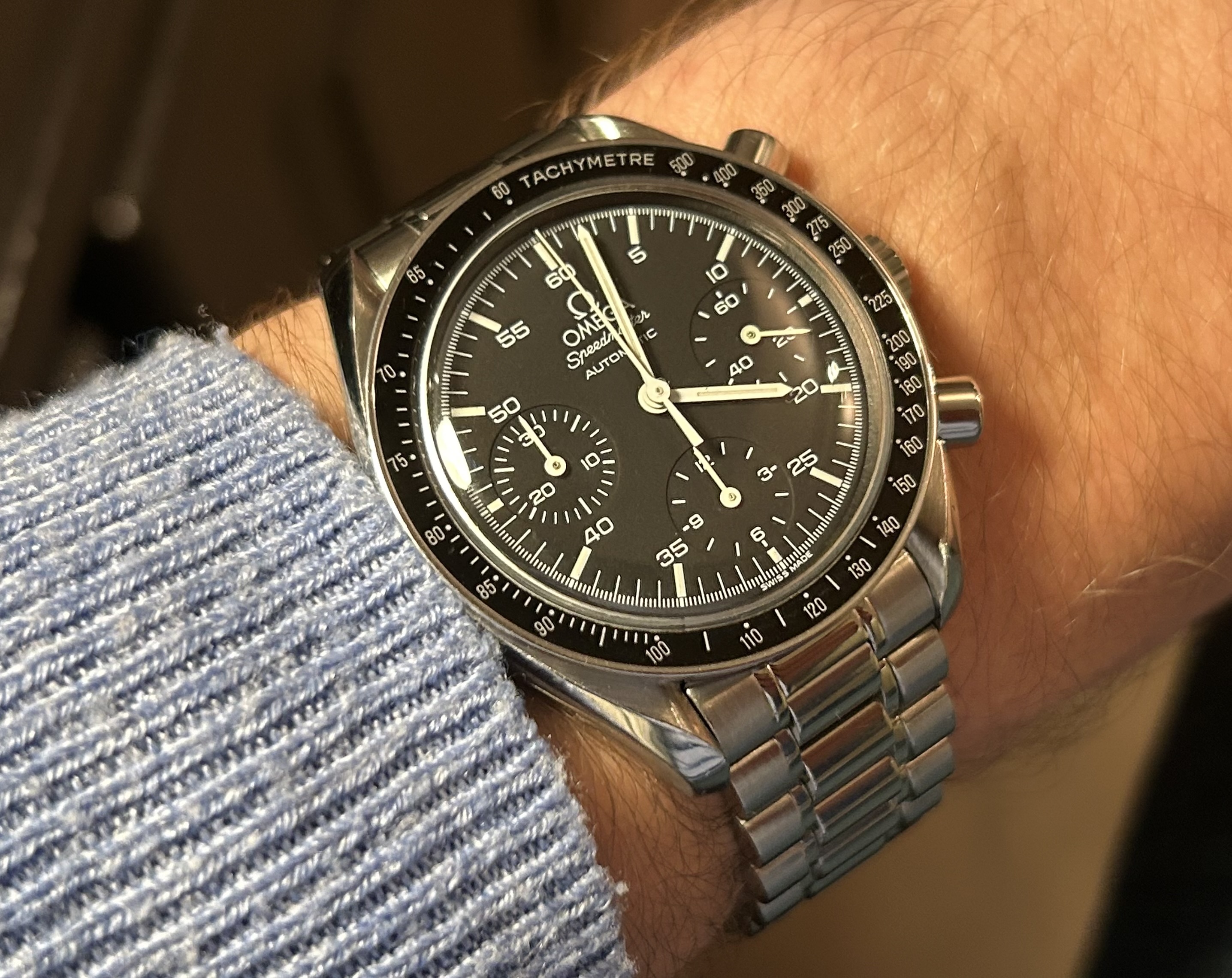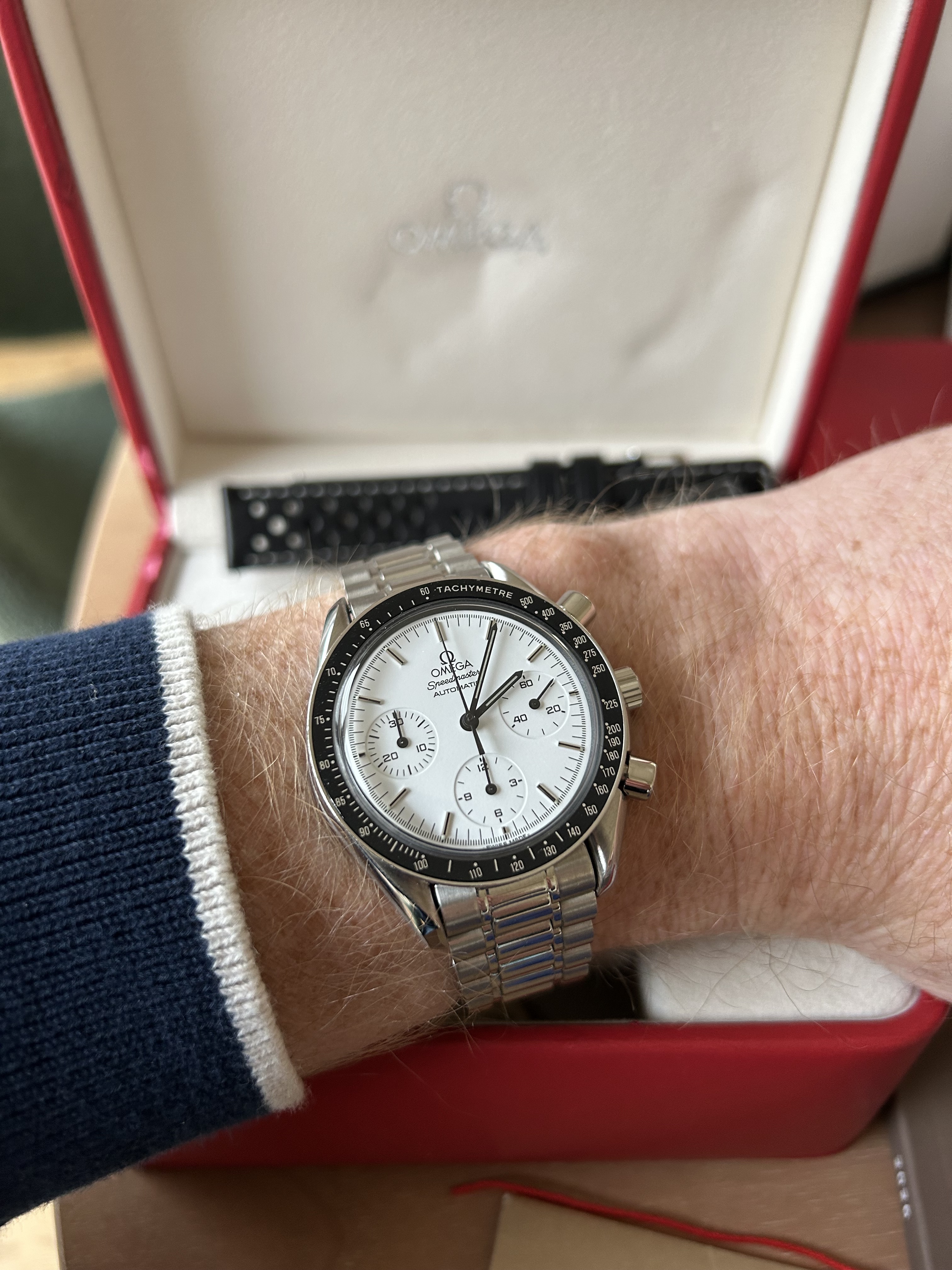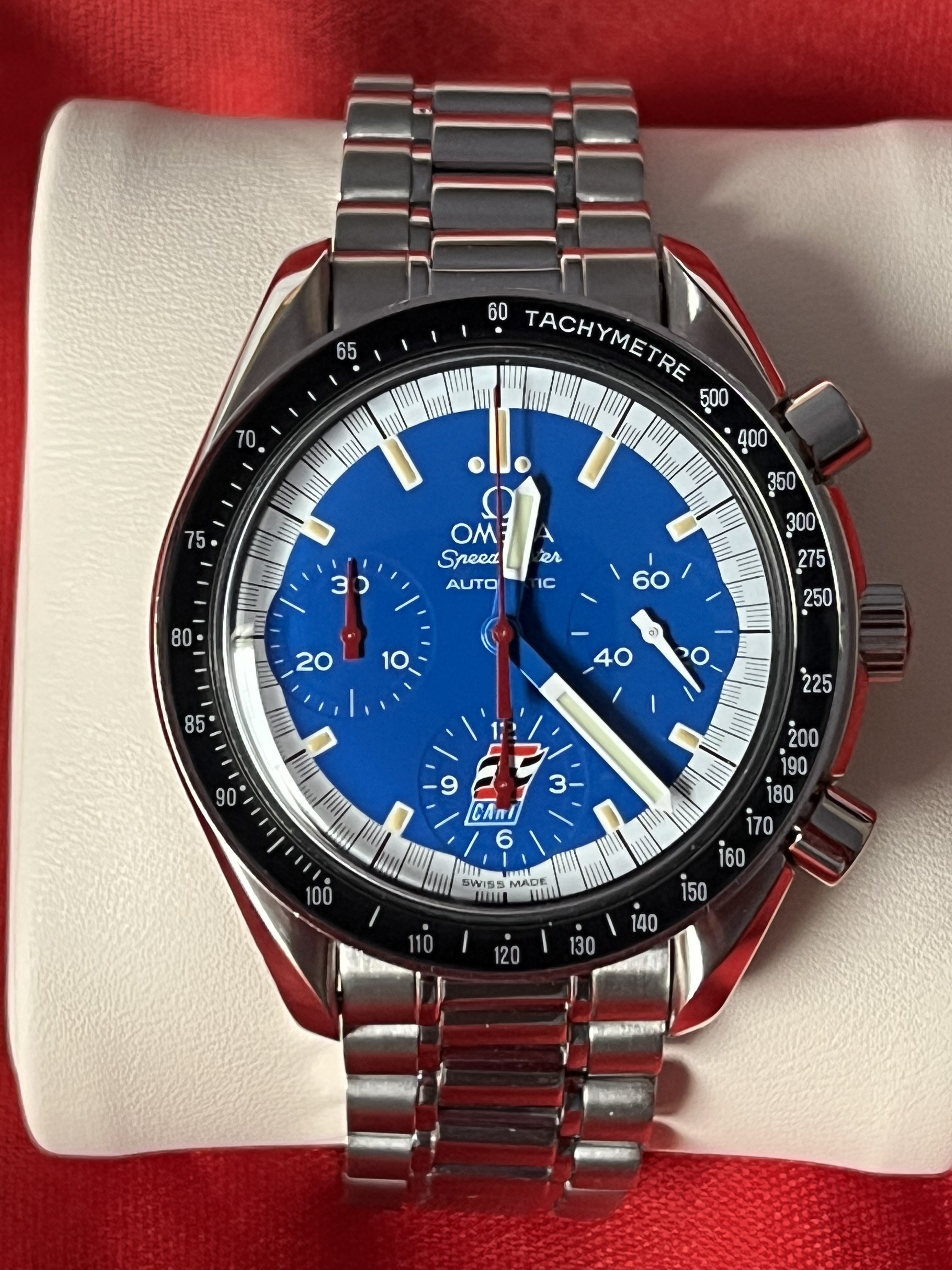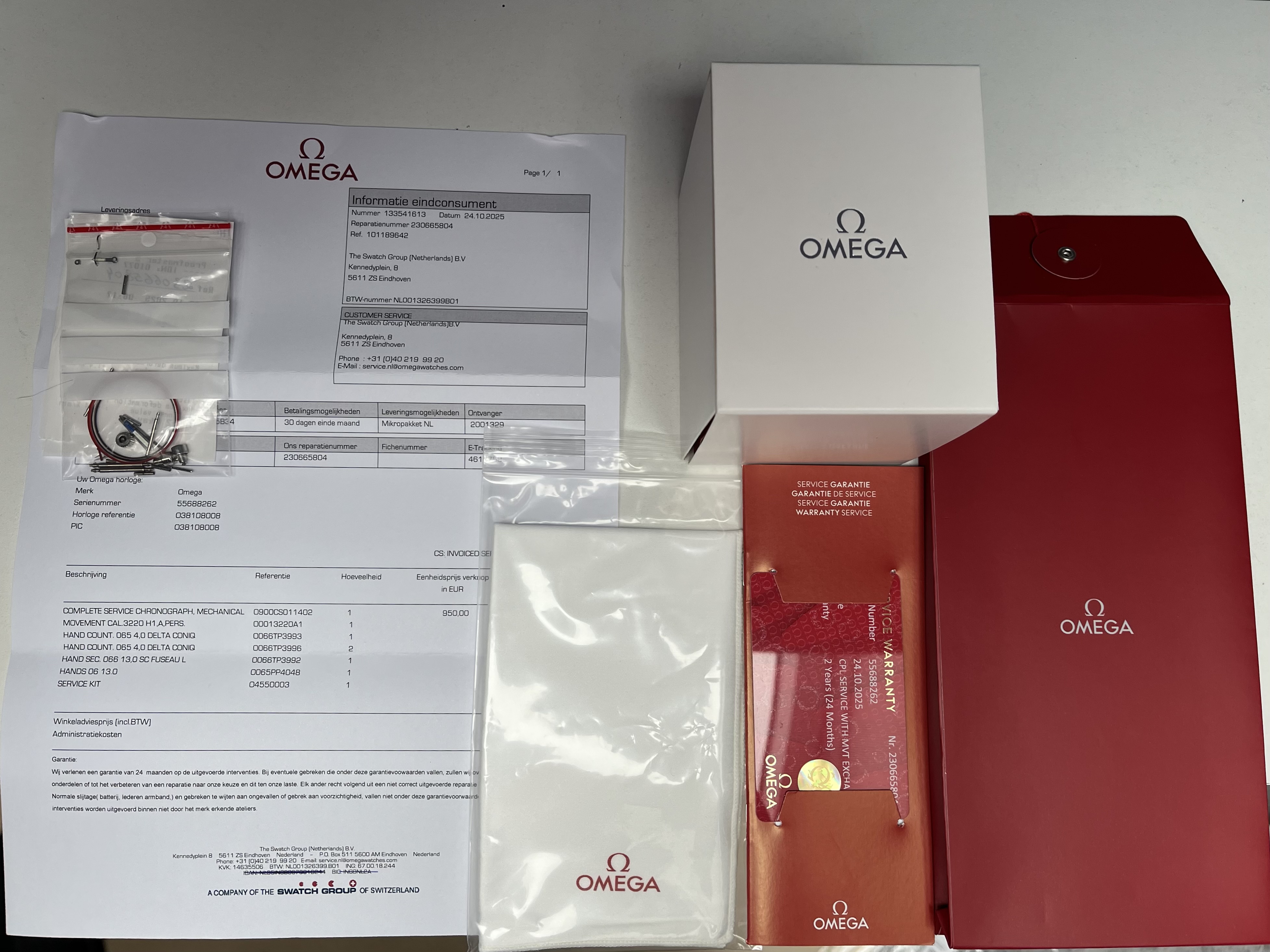 Twee van mijn Speedmasters Schumacher zijn bij @Horloge24 logeren geweest. Eentje mocht zelfs doorreizen naar een 5 sterren hotel in Brussel voor een dure behandeling. Deze kreeg het nieuwe caliber 3220 en, op advies van André, ook nieuwe wijzers. Na deze bij hem onder de microscoop bekeken te hebben, begreep ik dat na eerst geaarzeld te hebben. Jammer voor de puristen….