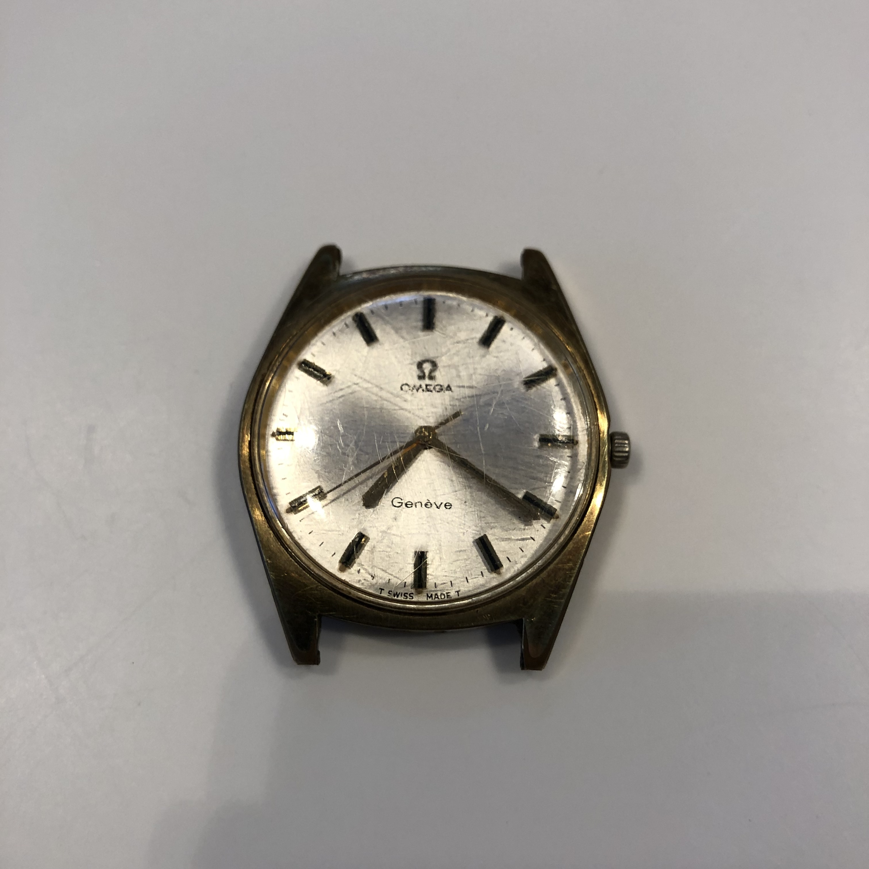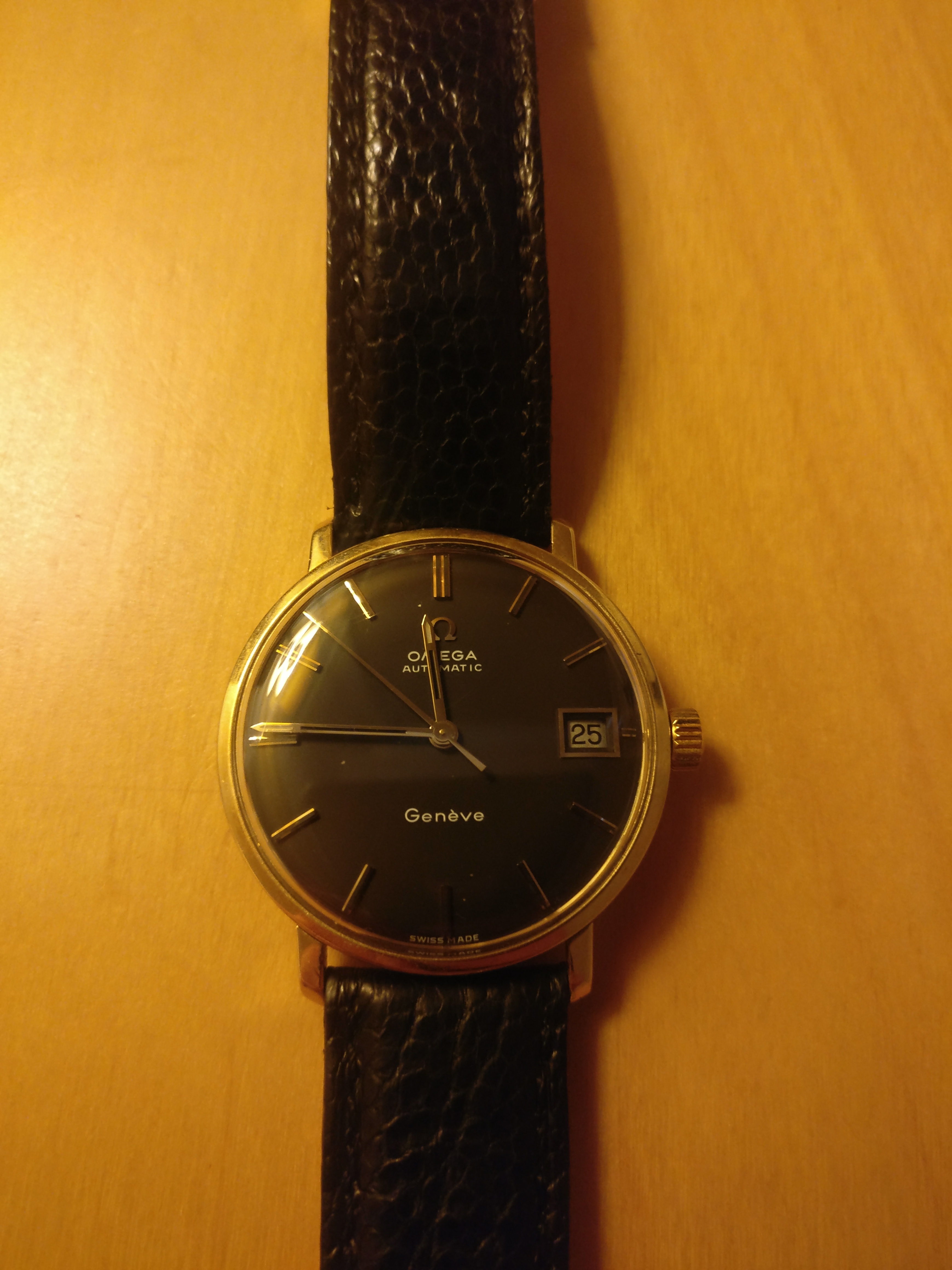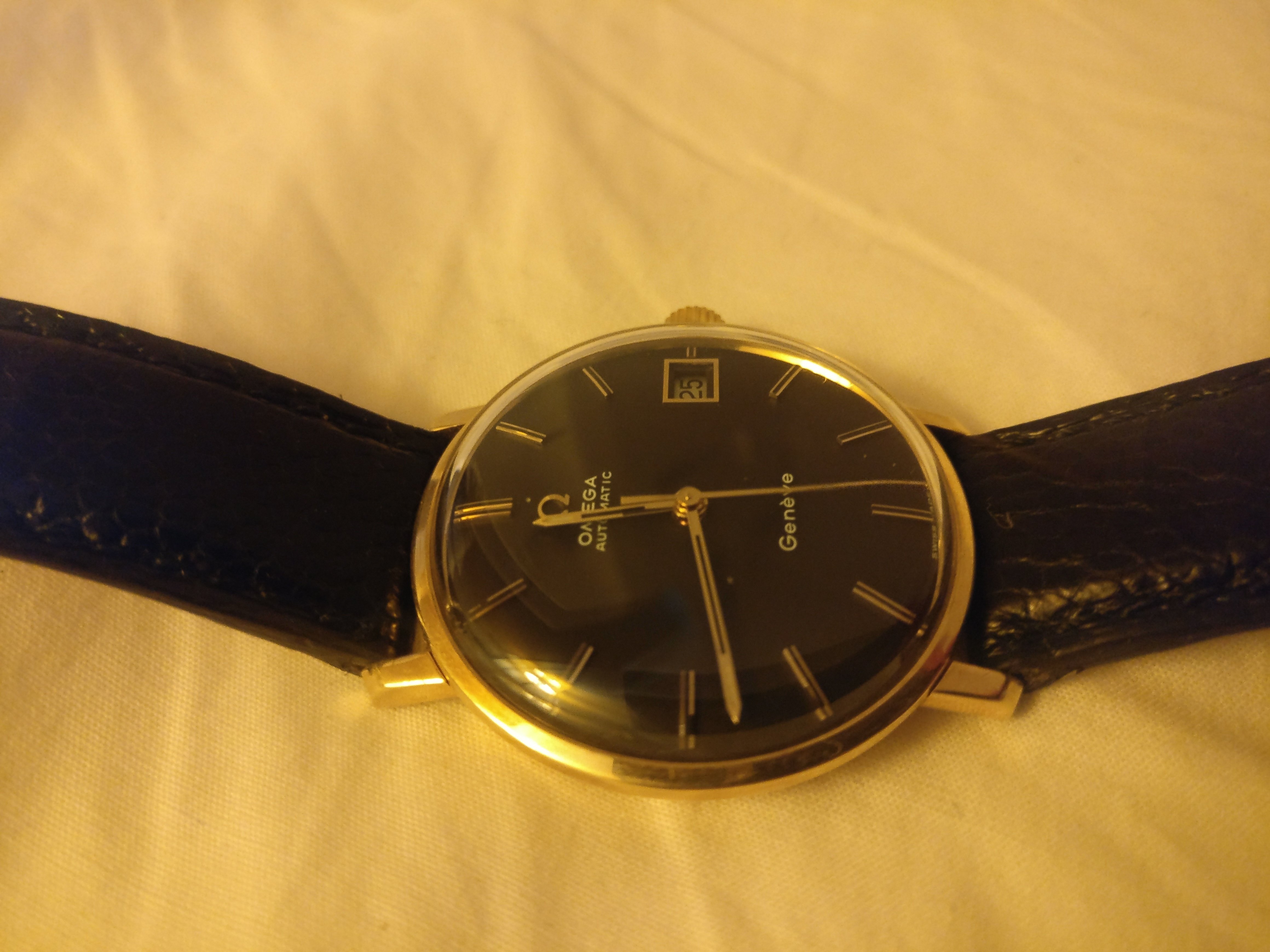 Ik heb ook een Omega Genève uit de familie. 14k met 14k gewoven band. Oubollig/niet meer draagbaar, die band was gewoon niet mooi vond ik. Beige/zilver dial die erg geleden had. Ging wat verder dan gewoon ‘patina’. Wijzers idem. Ik heb een volledige upgrade gedaan. Ergens bij omega nog een zwarte leeftijdsgetrouwe dial kunnen vinden (mooi met goud). Nieuwe wijzers, nieuw plexiglas. En aan kroko band gezet.