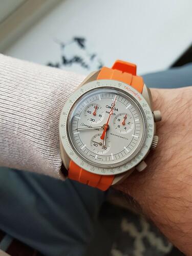 Leuke banden wissel. Groen staat m ook goed! Nooit eerder gezien…(deze kleur op een Moonswatch)