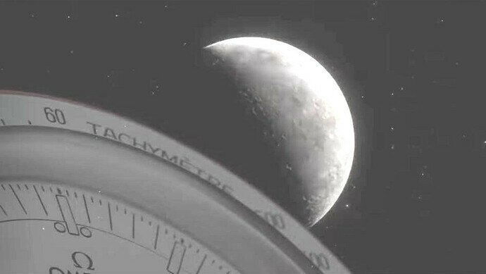 Dit is een photoshop op basis van een echte speedmaster; kijk maar naar de markers op 3 en 9 uur. Die zijn korter om ruimte te maken voor de subdials, maar bij de swatch zitten die op een andere plek dus de markers hoeven niet korter