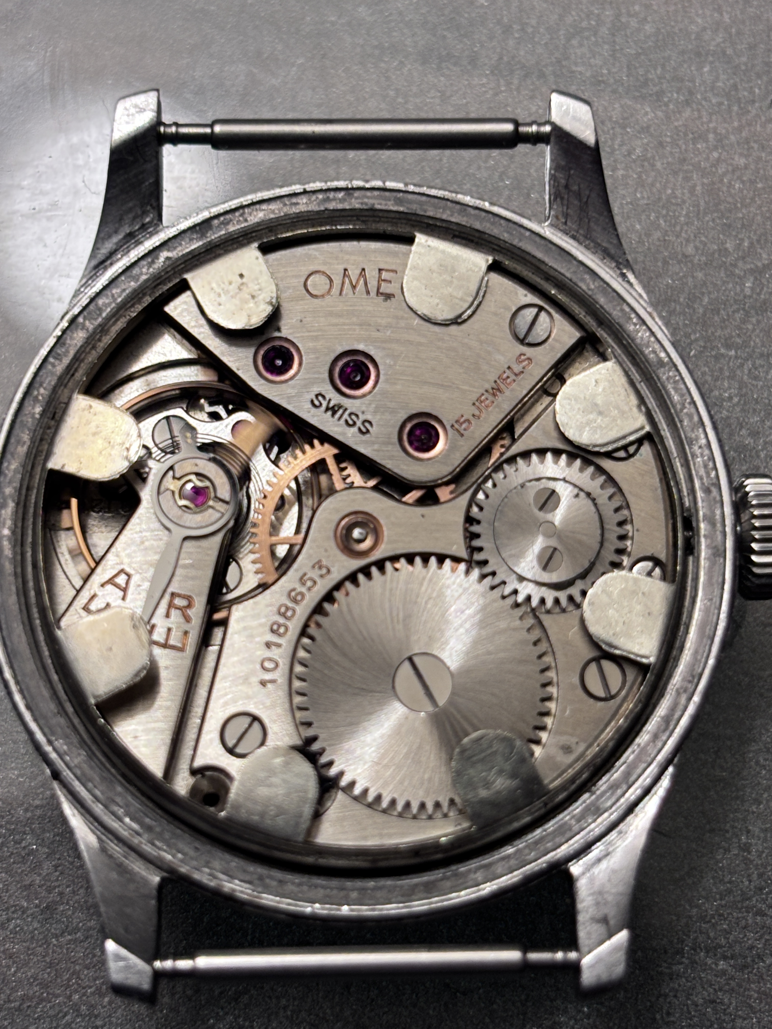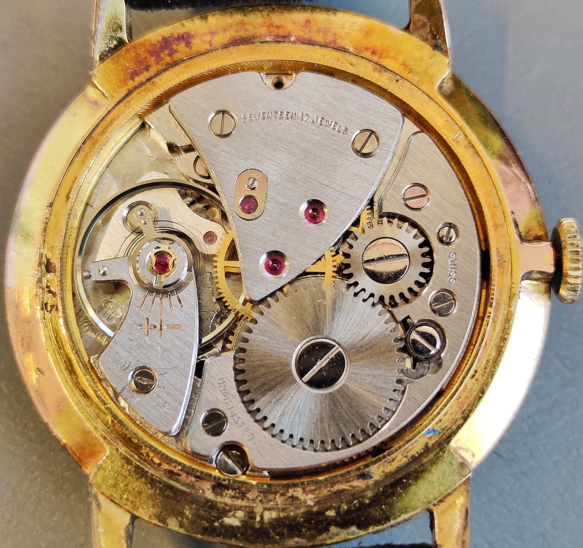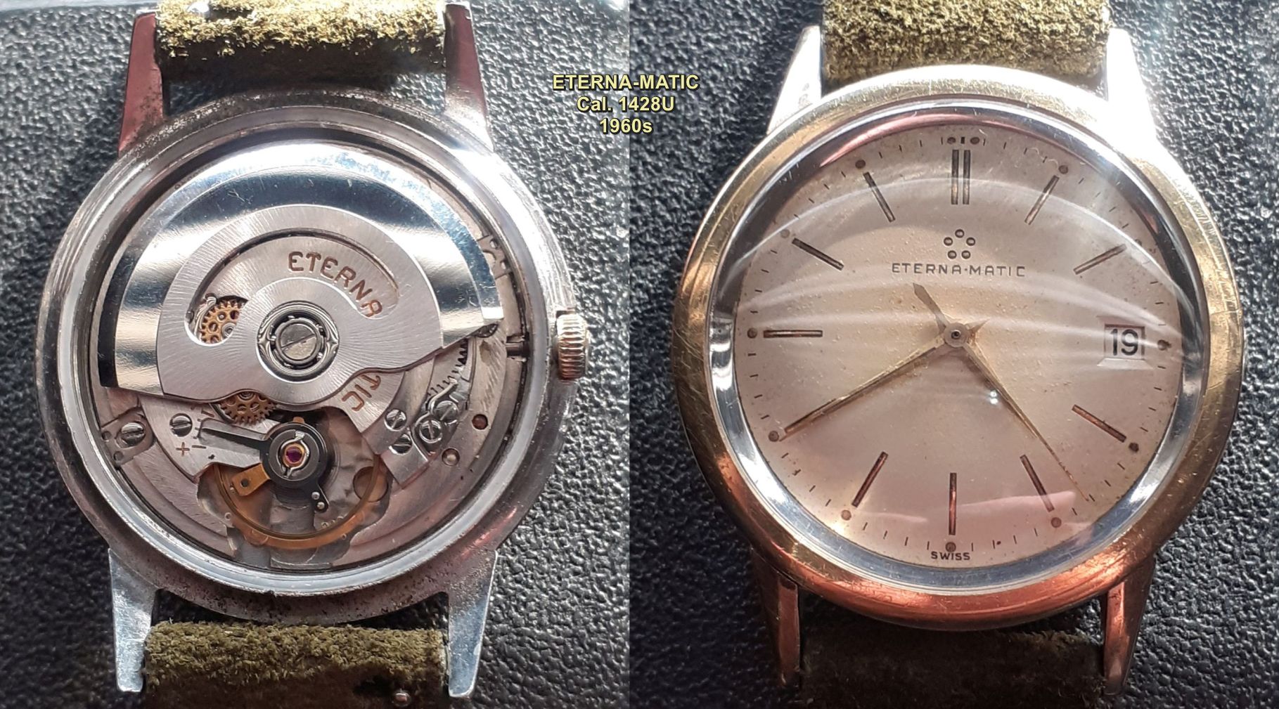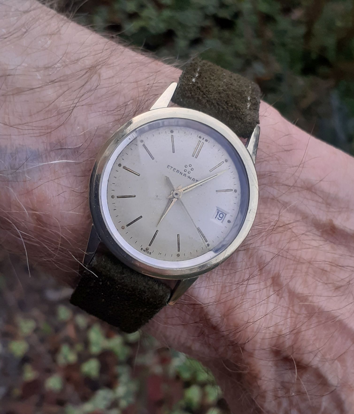 Het uurwerk — een Eterna cal. 1428U — is nog in uitstekende staat. Na montage en het plaatsen van een olijfgroen suède bandje tikt alles weer netjes zoals het hoort.