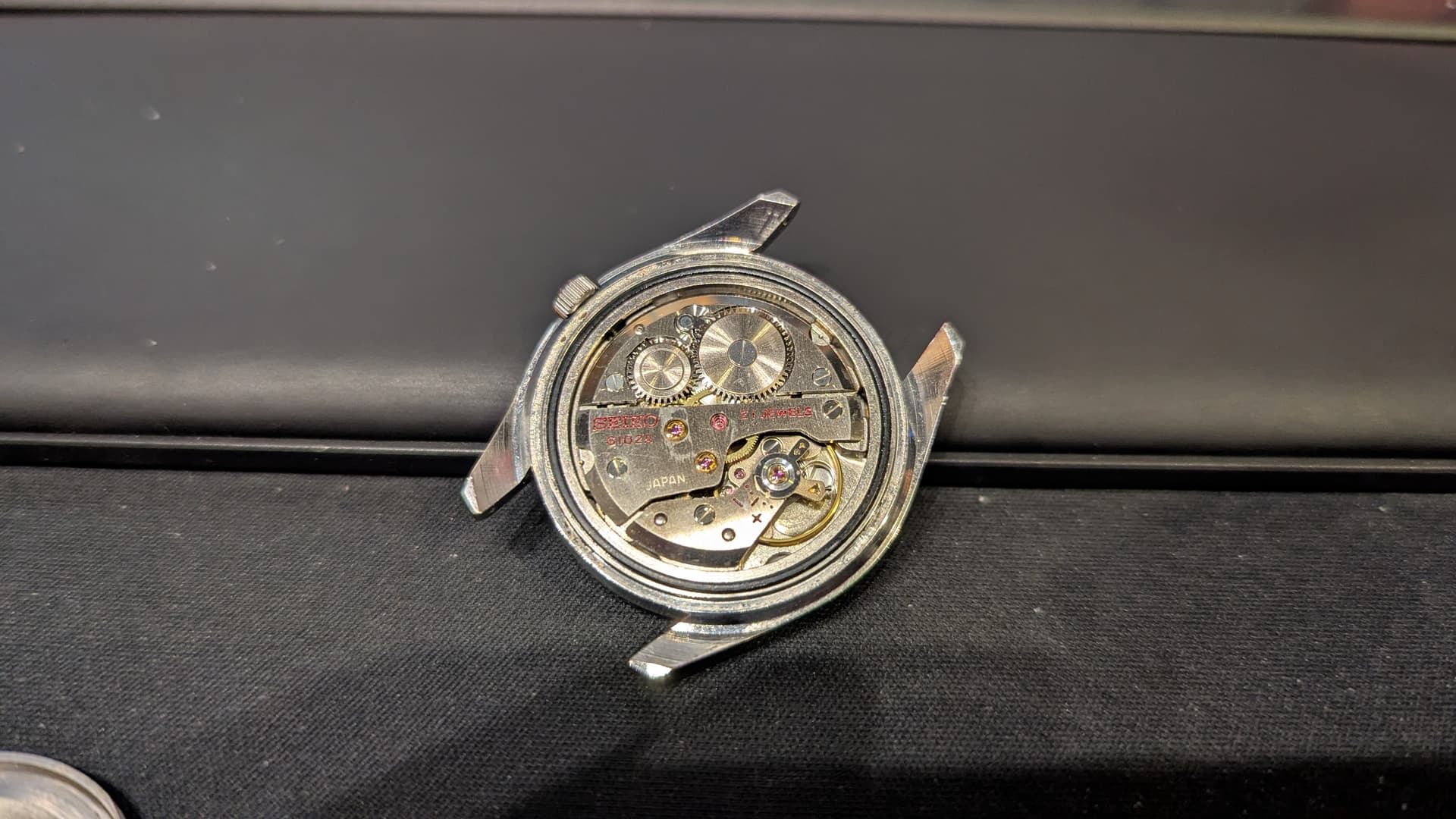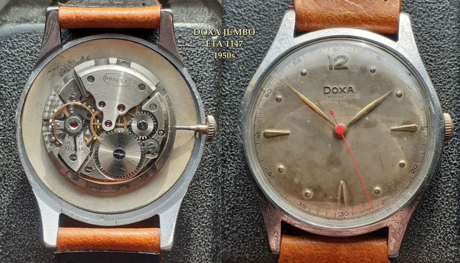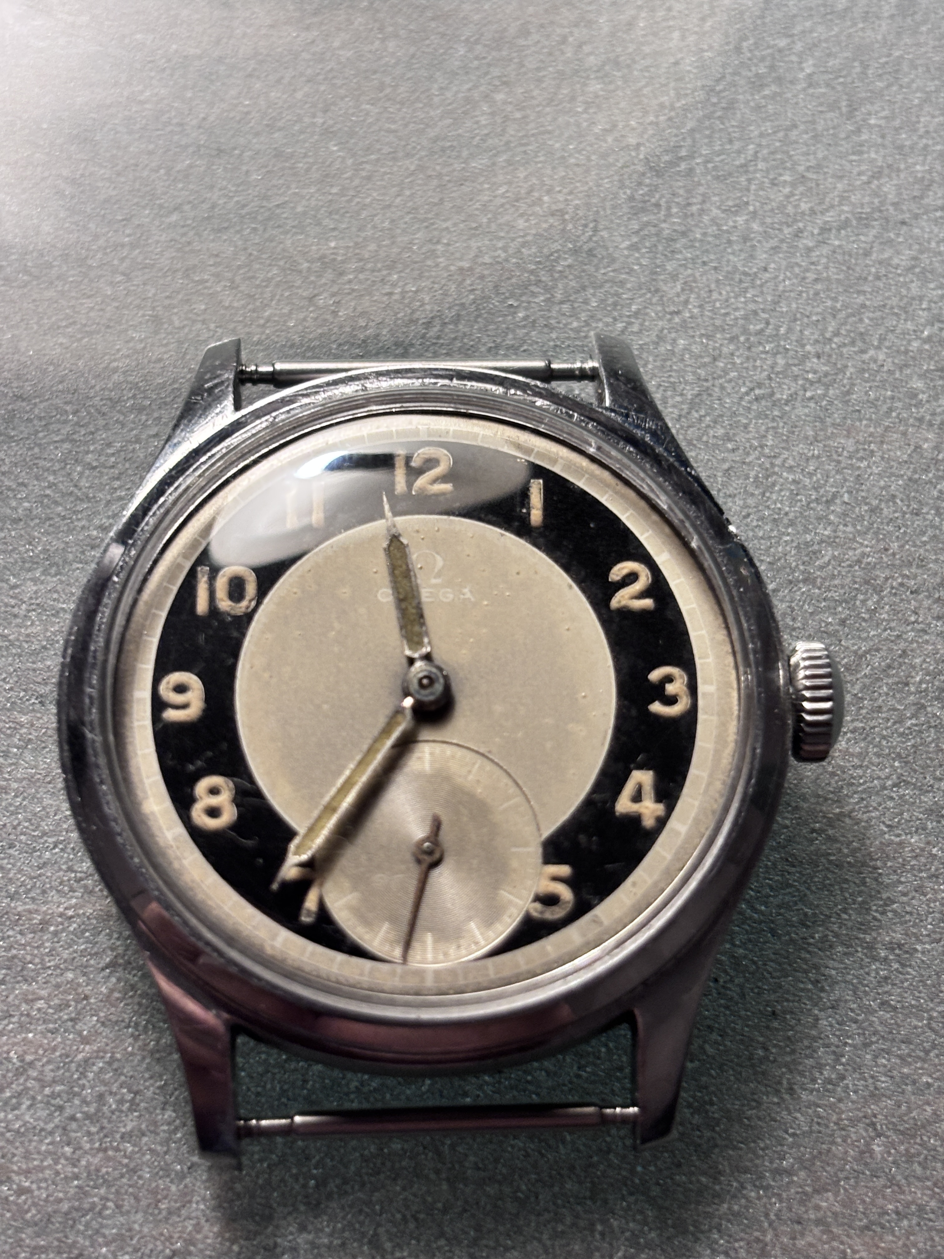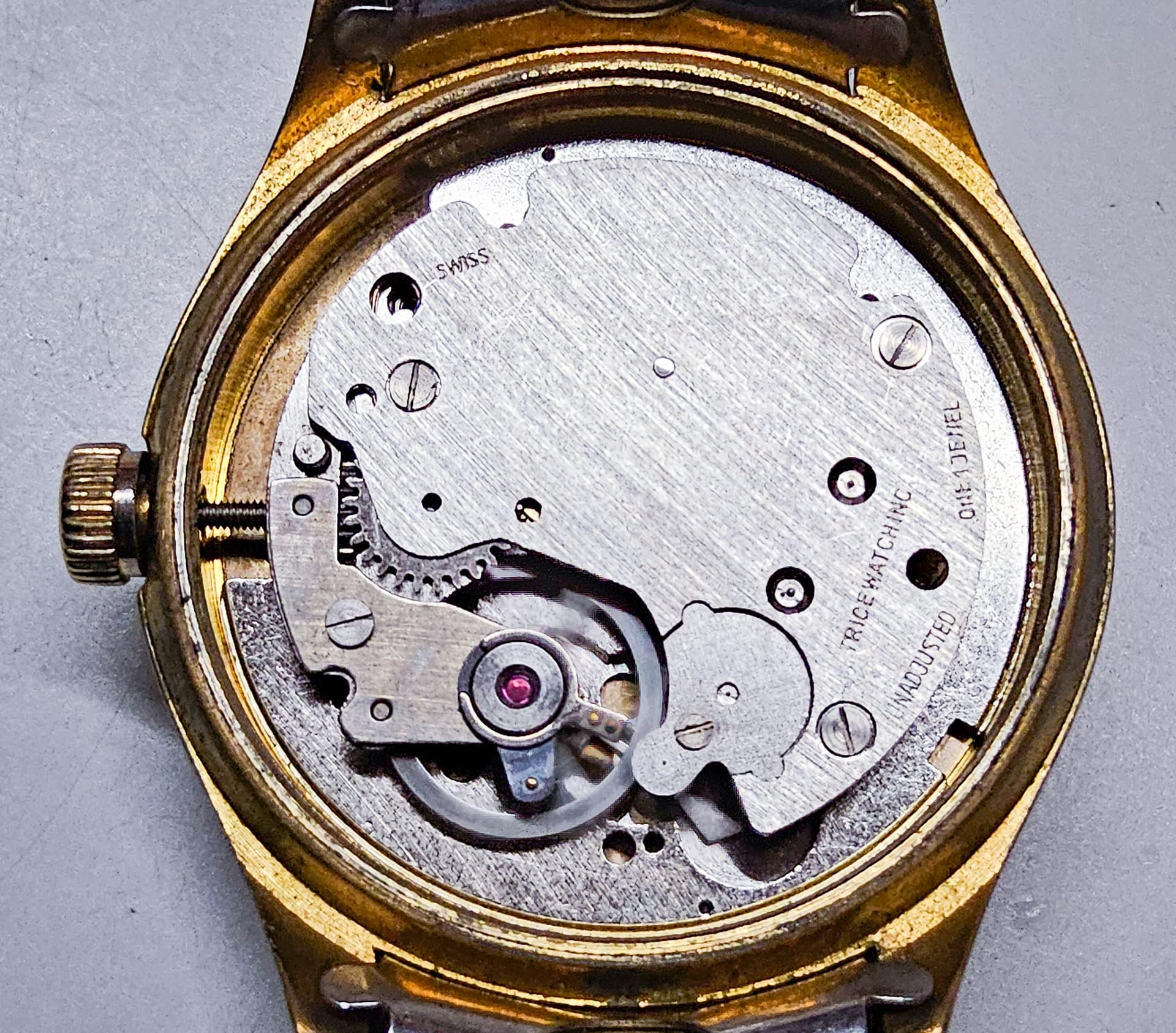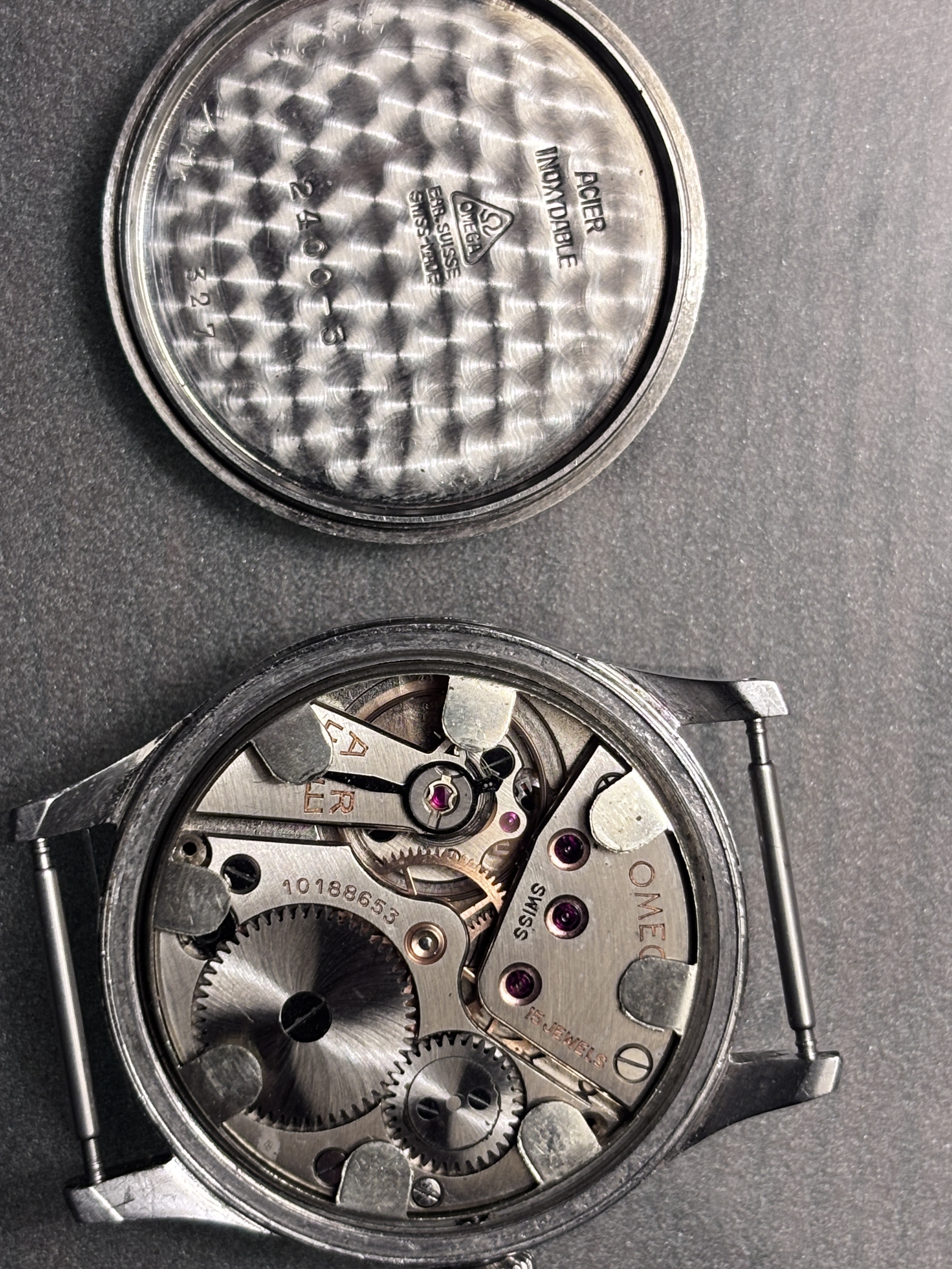 Het uurwerk — een Eterna cal. 1428U — is nog in uitstekende staat. Na montage en het plaatsen van een olijfgroen suède bandje tikt alles weer netjes zoals het hoort.