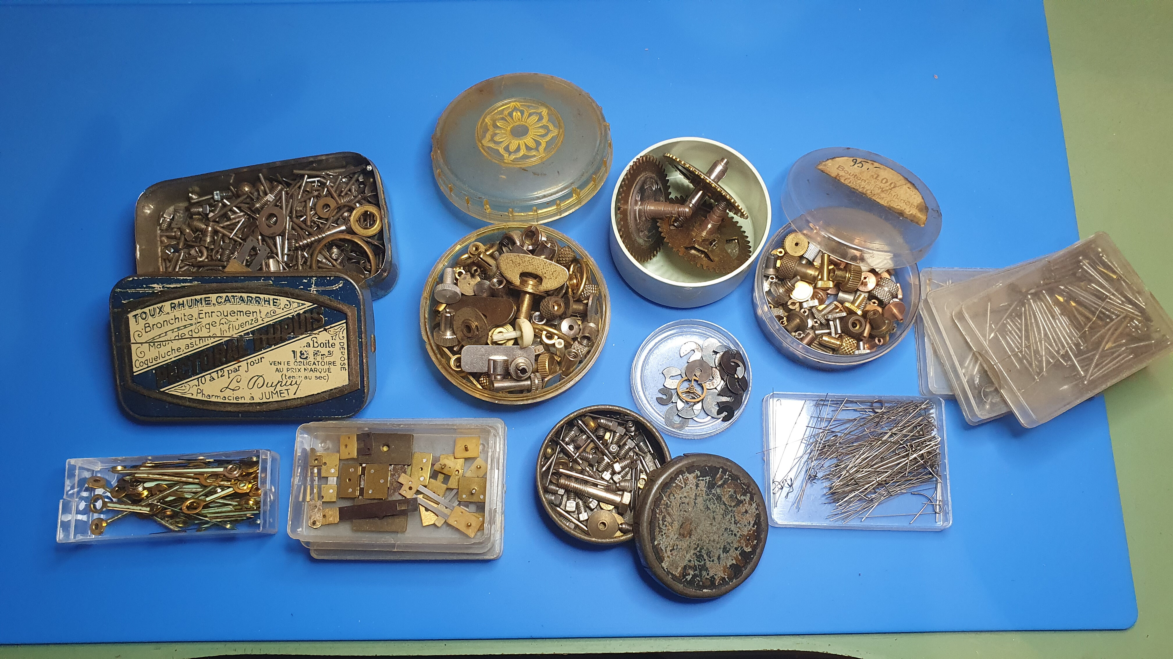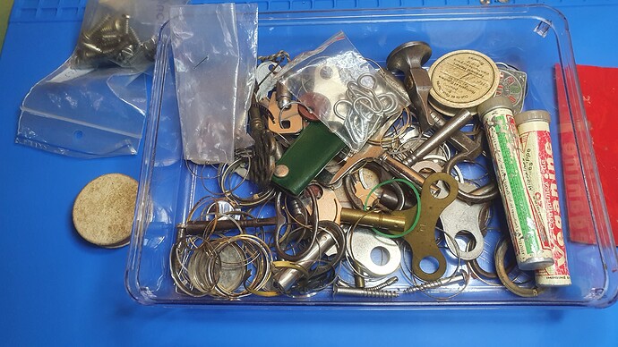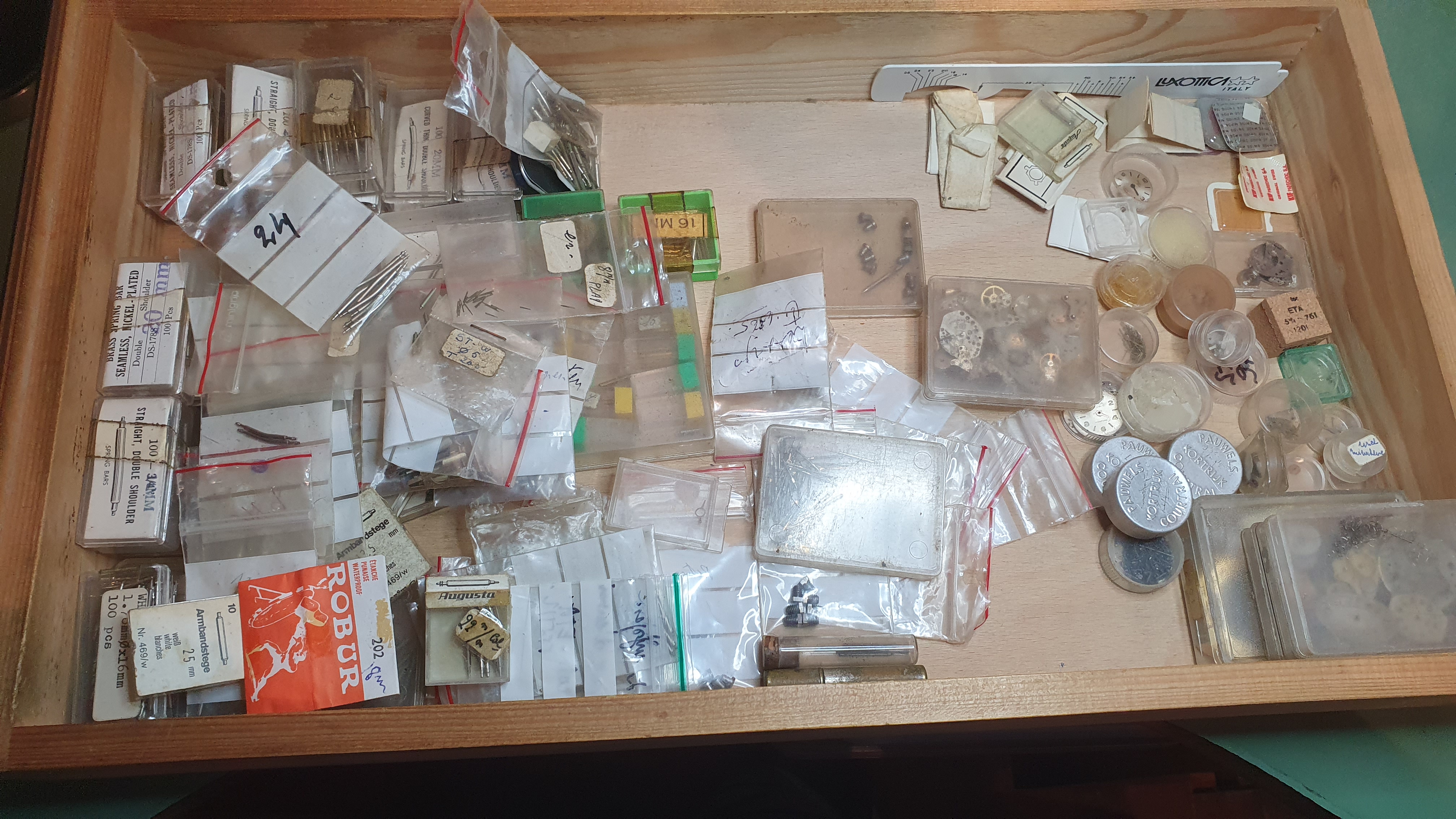 De lade bevat nog een pak andere zaken; een pak mainsprings in verschillende maten, zowel pols- als zakhorloges; een aantal stuks balansstaf, een paar balansveren, en nog wat onderdelen links en rechts.