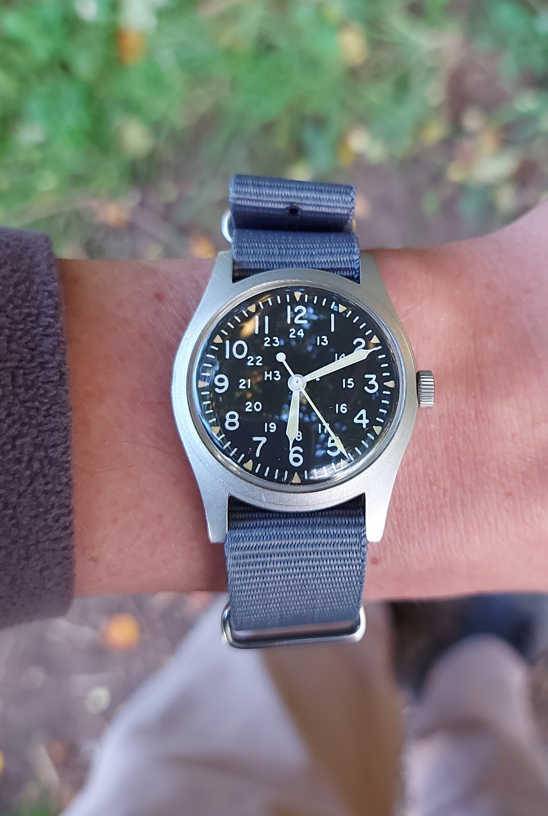 Het betreft een Hamilton H3 MIL-W-46374B non-hacking handopwinder uit 1978. Met zijn 33mm is dit de kleinste field watch die ik heb gehad maar toch vind ik het beter om de pols passen dan degene die al heb gedragen.