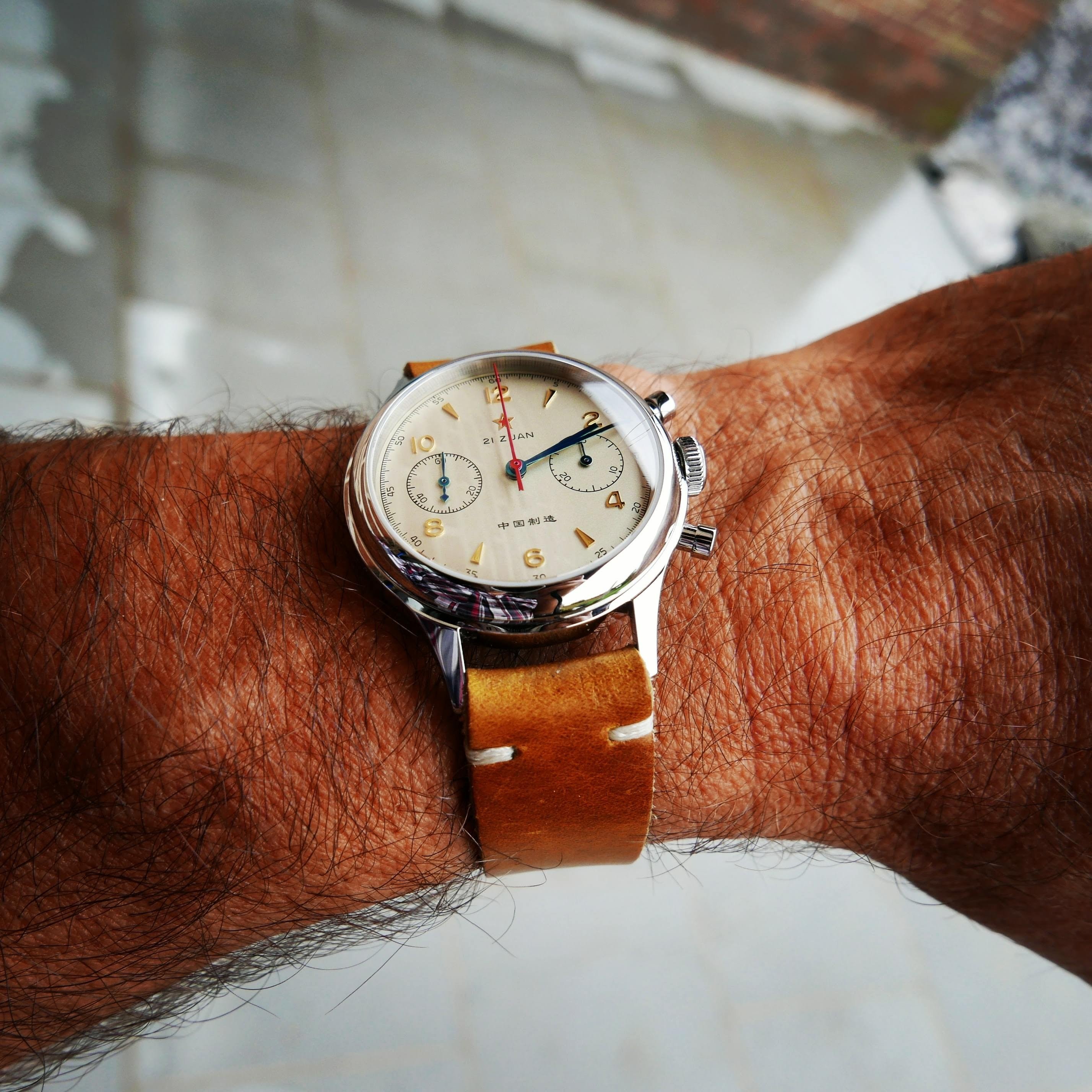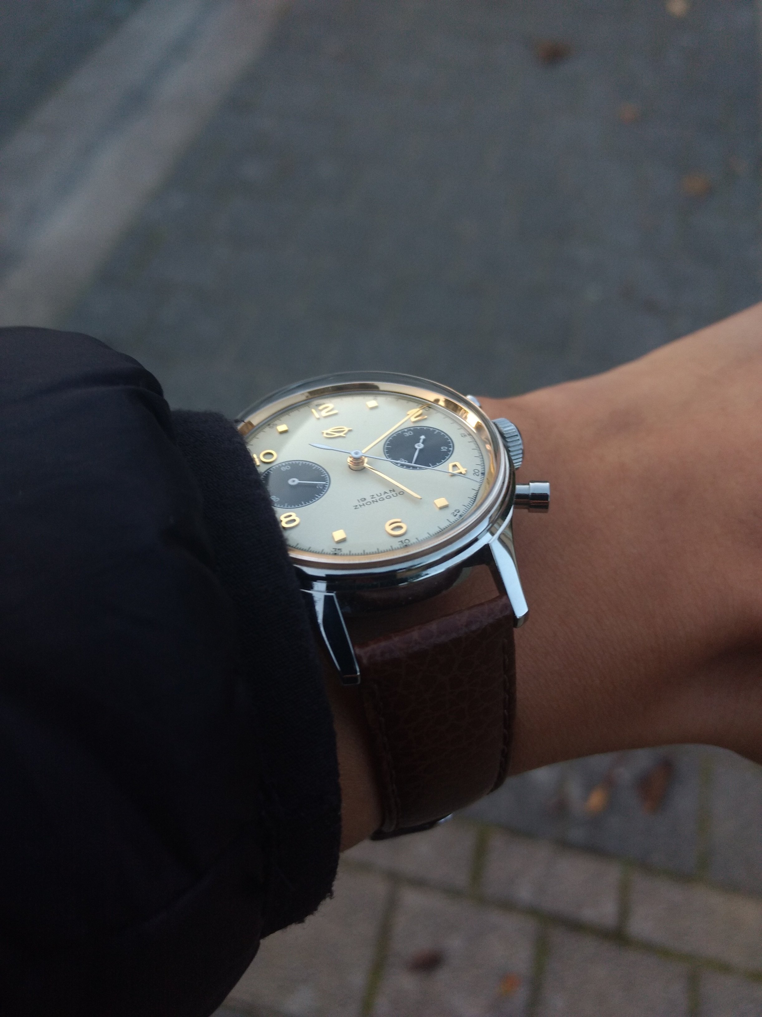 De enige leren band die ik er gemakkelijk tussenkreeg was bovenstaande band met krokomotief. @Fate_Amenable_To_Change wees me hier op: het is geen dress horloge, het is een pilotenchrono. Geen kroko of hagedis.