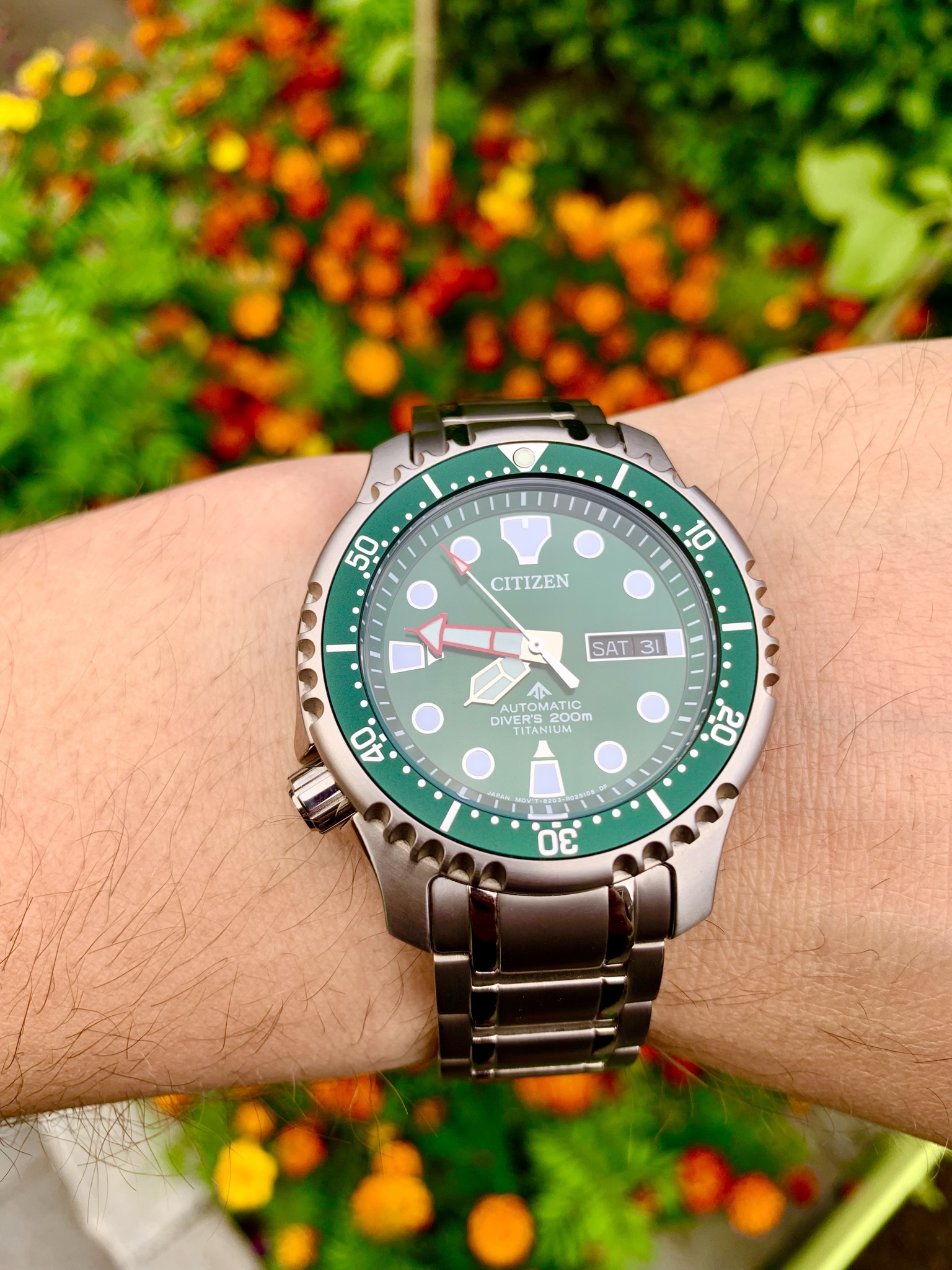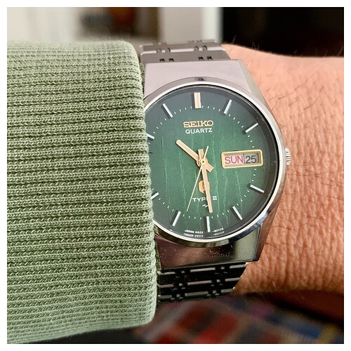 Het groen op de Seiko Sharp edge is wat donkerder, en laat zijn pracht eigenlijk alleen zien in direct licht (binnen lijkt de plaat 80% van de tijd zwart). De Tissot is iets helderder groen, waardoor het er wat meer uit springt. Deze was helaas net te groot voor mijn smaak (ga niet boven de 39mm met mijn kleine pols, zeker met het relatief grote wijzerplaat/bezel ratio van de tissot).