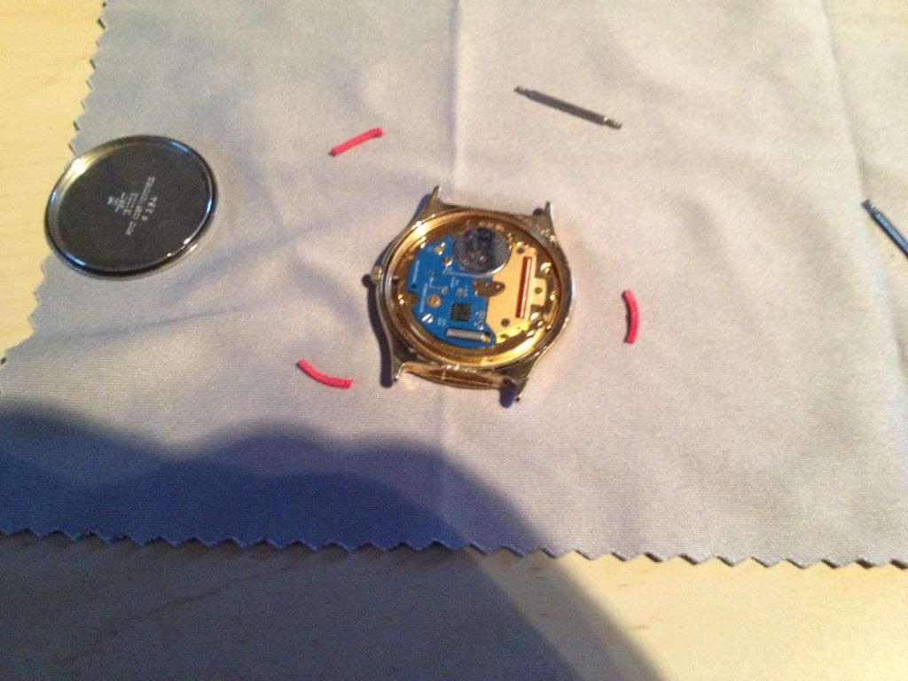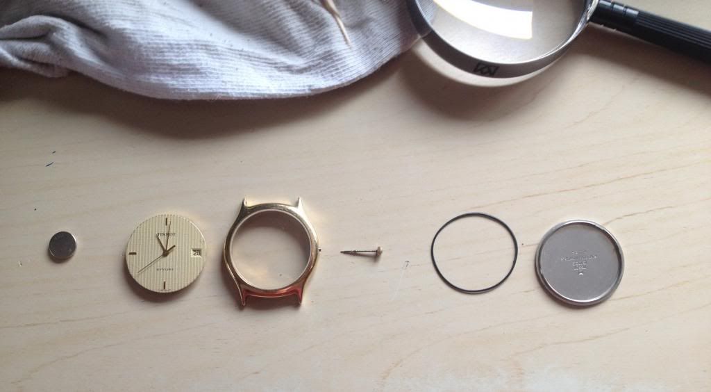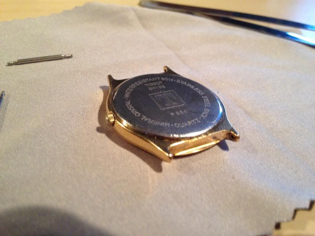 De afgelopen tijd heb ik een aantal horloges gekocht, zo ook een Tissot Stylist van Marcel (Marz) via dit forum. Het betreft een vergulde kast met als binnenwerk een ETA 955-122 quartz uurwerk. Het uurwerk zat los in het horloge omdat er een bevestigingsring/klemmetjes/houder miste.