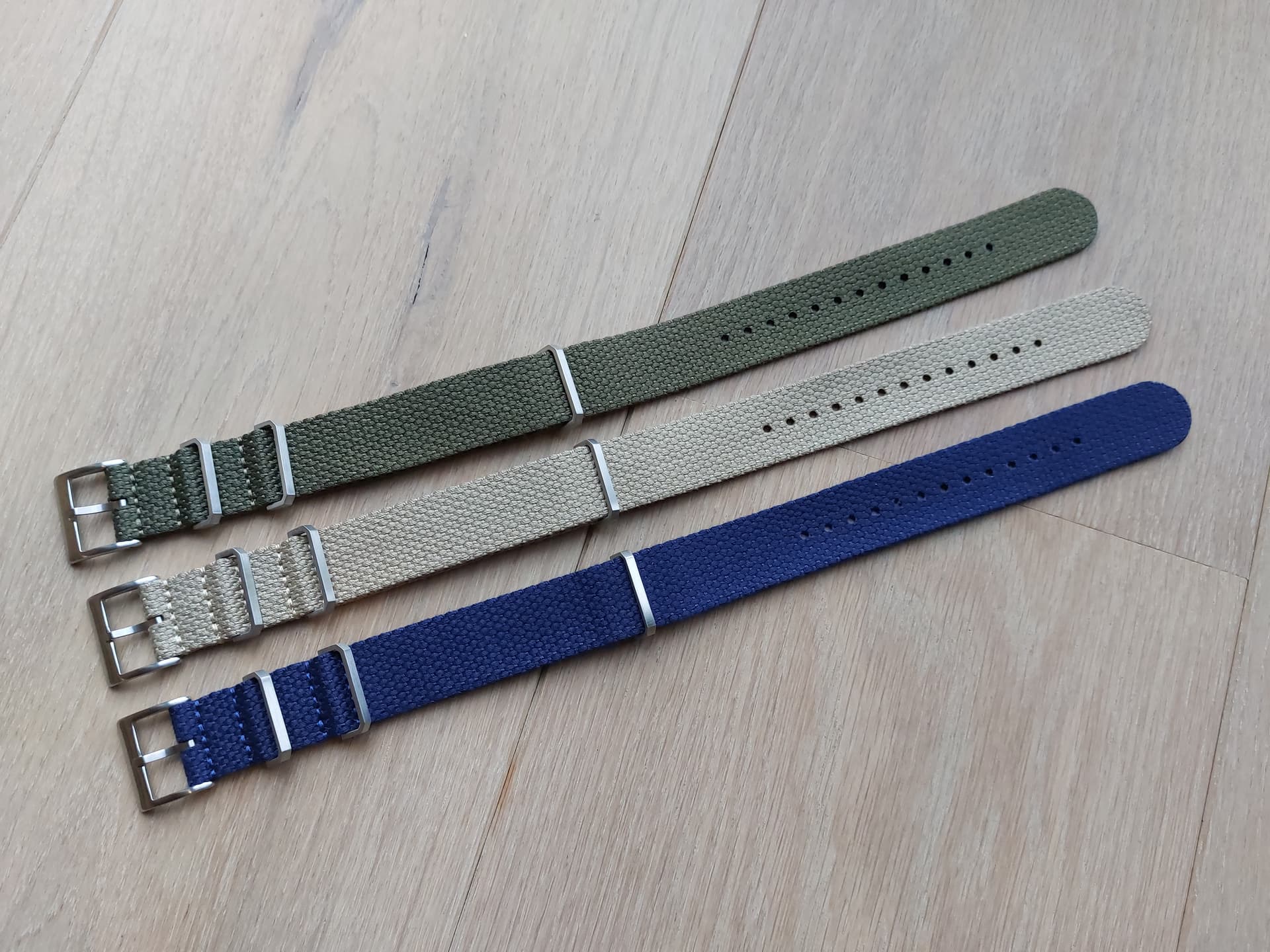 Woven Canvas Military Watch Strap, super soepel in de kleuren Army Green, Desert Sand en Marine Blue: 18 EUR per stuk, samen verstuurd met T&T voor 50/55 EUR (BE/NL).