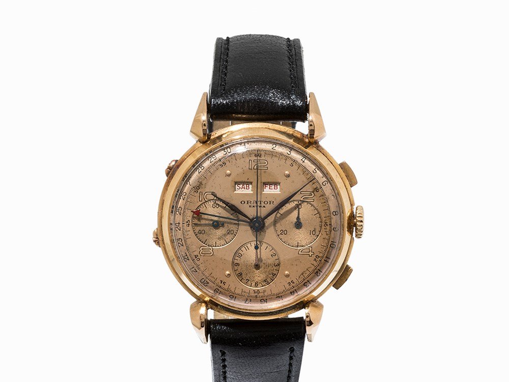 ORATOR EXTRA REF. 2300 CHRONO TRIPLE DATE 38MM PINK GOLD Orator, “Triple Date Calendar Chronograph,” No. 21037, Ref. 2300. Made in the late 1950’s. Fine and very rare, large, 18K pink gold wristwatch with chronograph, registers and triple date calendar.