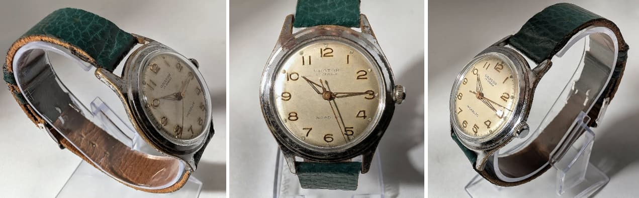 Zoals je aan de foto’s van mijn Orator hieronder zult zien is het bepaald geen ‘new old stock’ exemplaar. Het is stevig gebruikt en gedragen, met name de achterkant van de kast (pols zijde!) heeft flinke slijtage; er zit bijna geen spatje chroom meer op en ook het messing is bepaald niet meer glad. De tandjes des tijds hebben hun best gedaan. Toch is het een interessant en karaktervol horloge om aan te houden in de collectie.