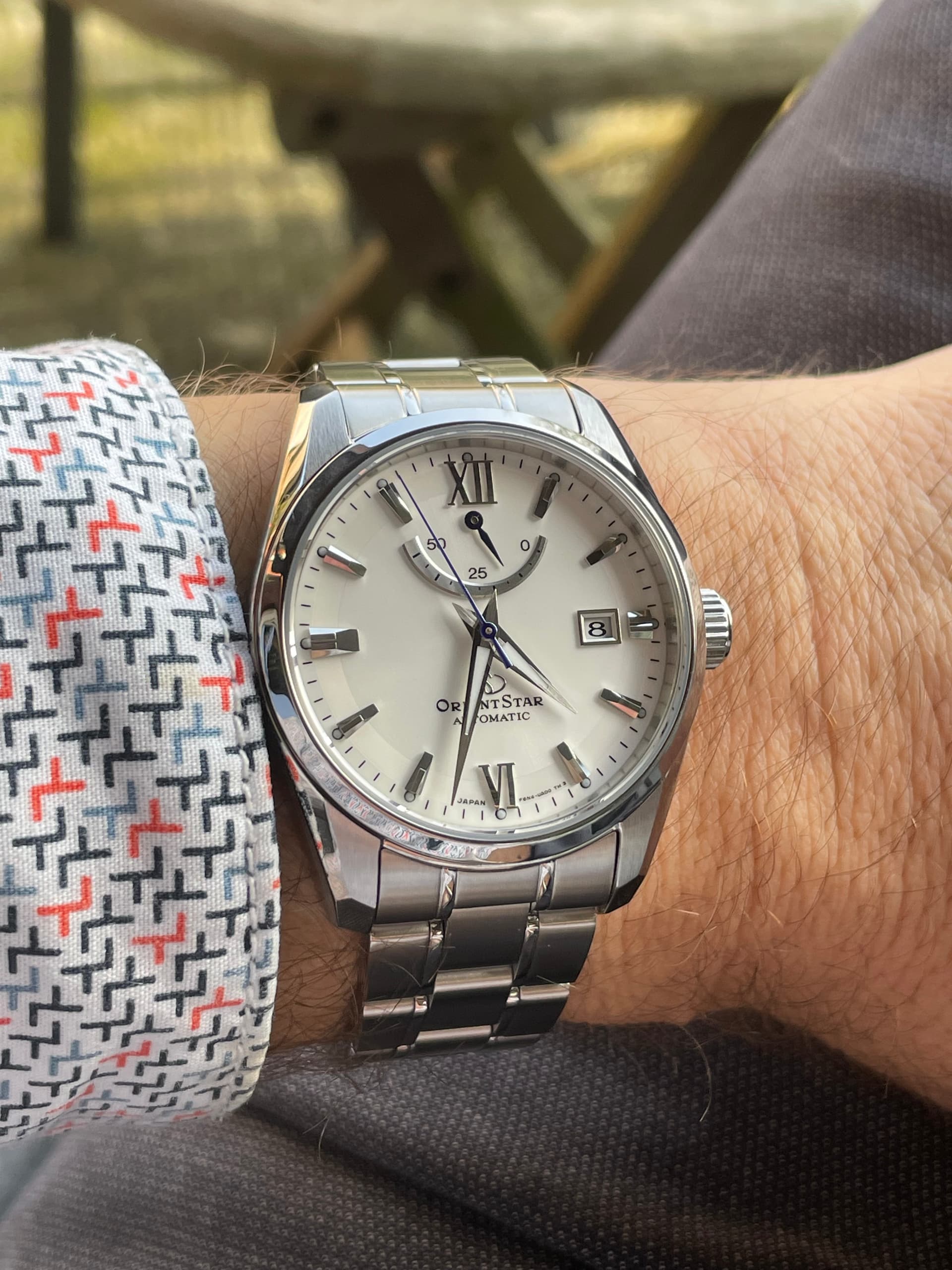 Ok, terug naar dit horloge, nou had ik ook zeer het geluk dat ik afgelopen februari(pff net vóór de oorlog nog) vanwege een vakantie trip samen met mijn zoon naar Japan, deze witte Orient Star zelf mee mocht nemen vanuit Japan terug naar Nederland. Dus ook nog een mooi verhaal erbij. Dat maakt dat dit horloge zomaar niet de deur uit gaat!