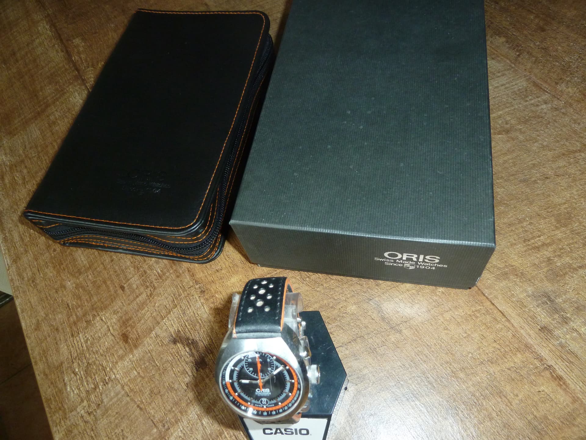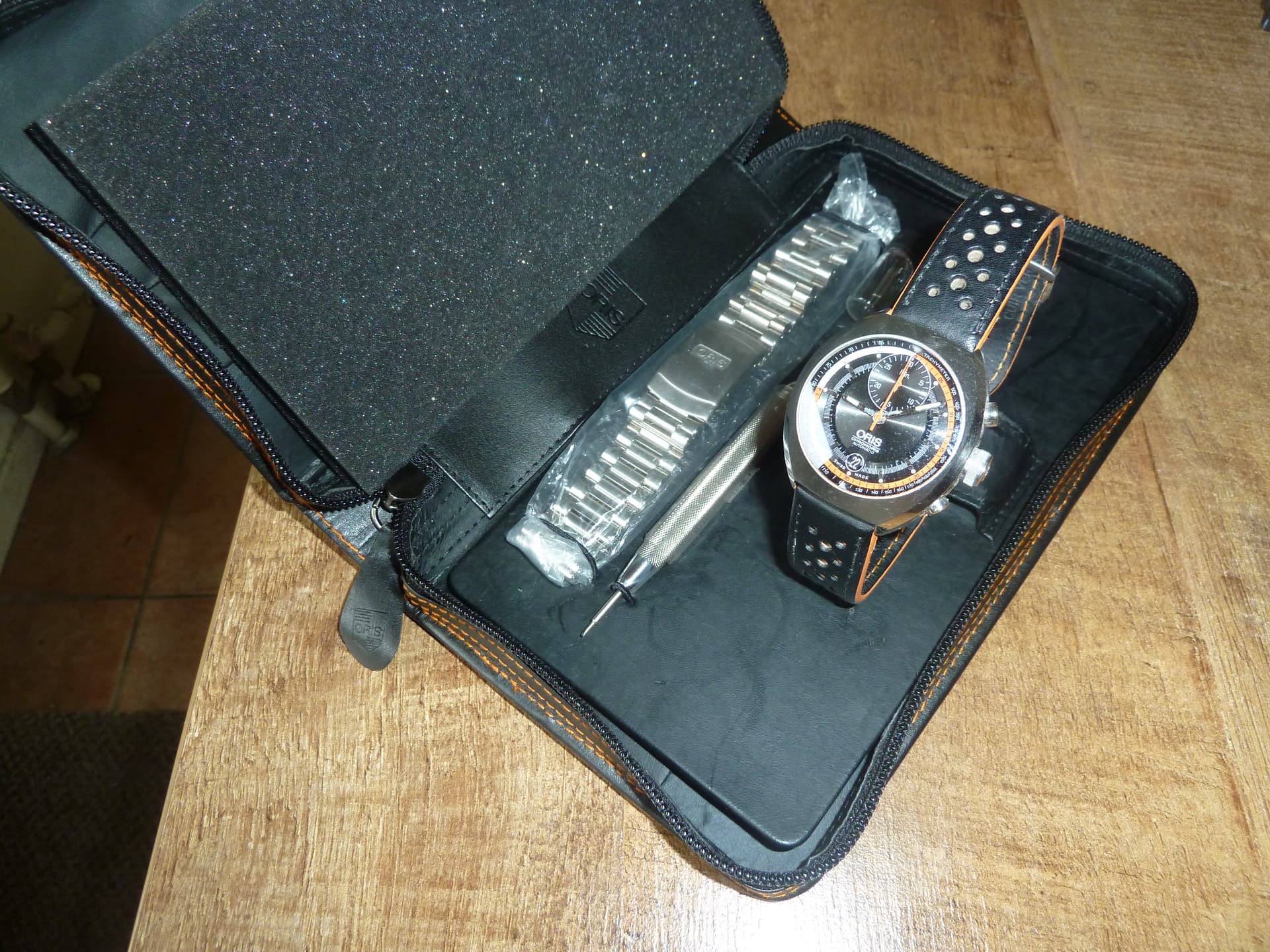 Originele doos en/of eventuele accessoires: Doos + etui + Oris metalen horlogeband + bandwisselaar.