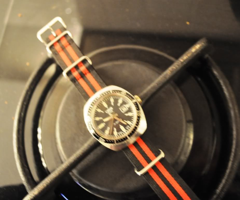 Even snel een foto gemaakt, mooiere volgen nog wel. Een zeer leuke Oris diver uit denk ik eind jaren 60 of begin 70 op de kop getikt. er zat verweerd leder op dat ik verruild heb voor een stoere Nato (Ja ik vindt dat wel mooi) Tevens nog een Oris dresswatch er bij gekocht ook hier plaats ik nog wel een mooie foto van: