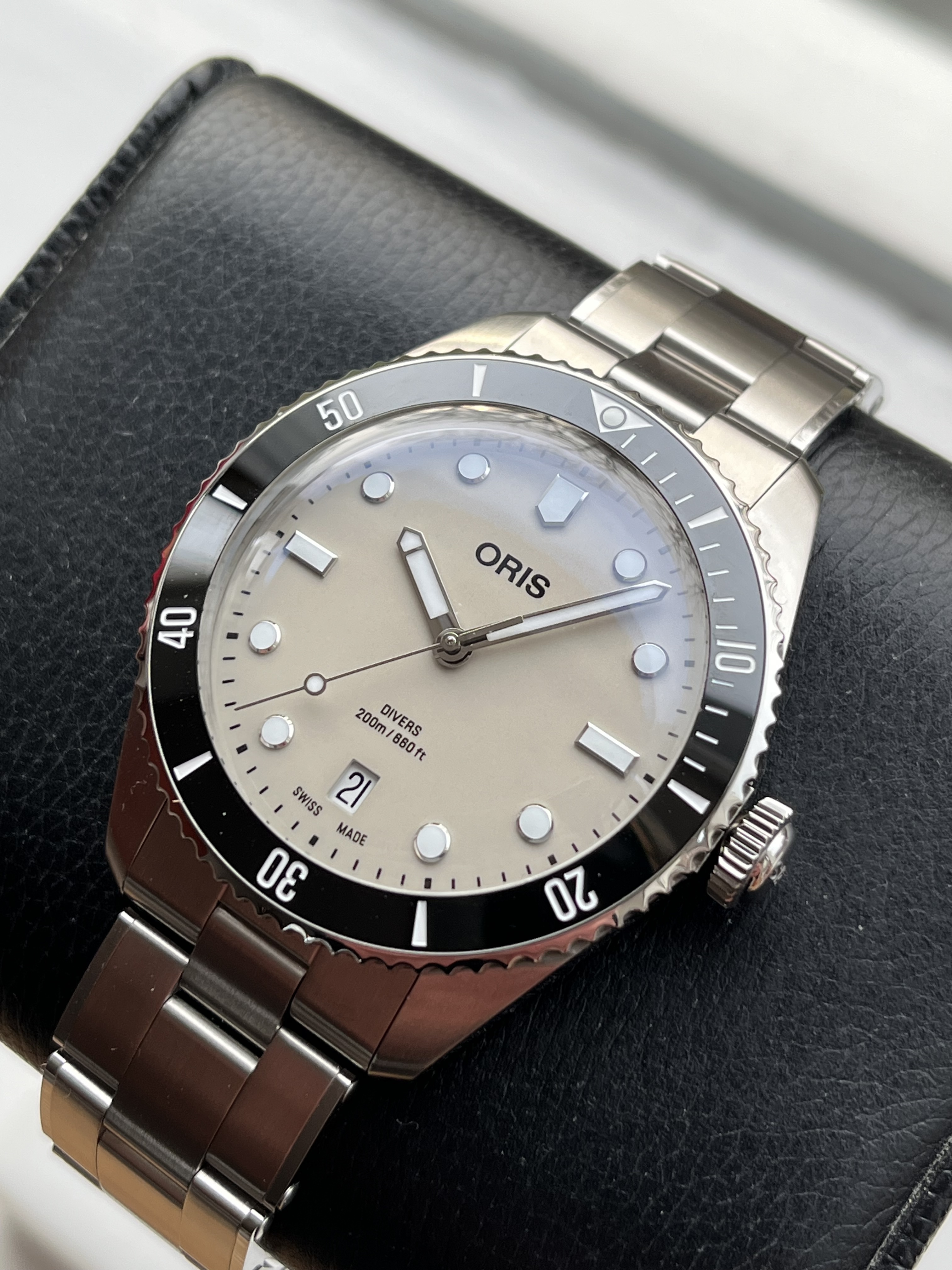 Hierbij aangeboden, de Oris Divers Date met beige wijzerplaat. Aangeschaft in de Oris Boutique Amsterdam.