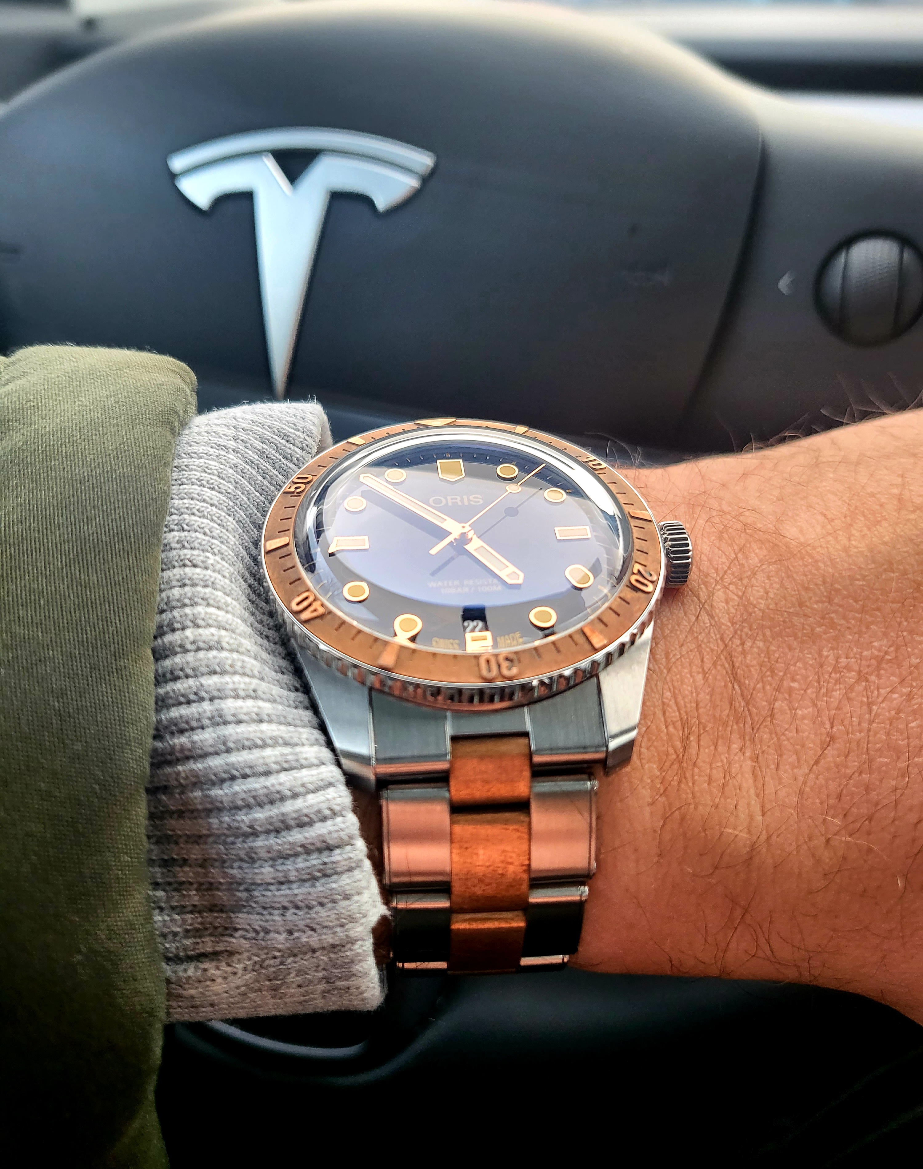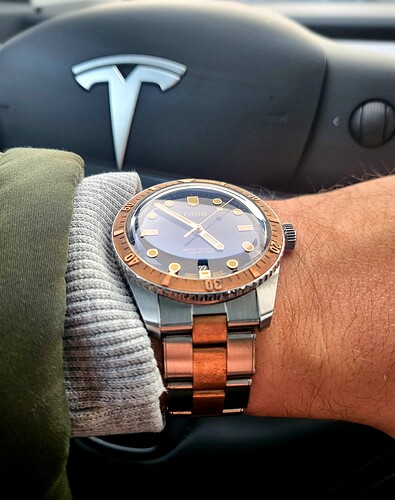 Tot ik hem om de pols legde en het horloge optisch veel kleiner leek dan de 40 mm die hij toch echt is. Lag het aan de bezel, de strap? De BGPD is toch ook 40mm…