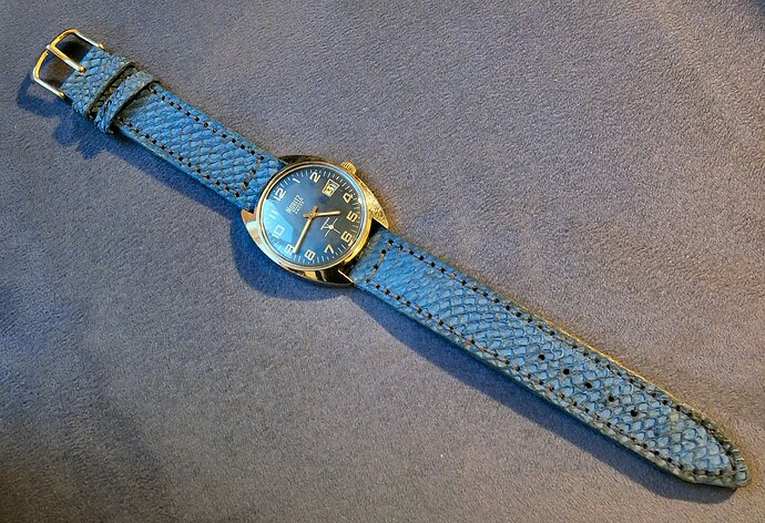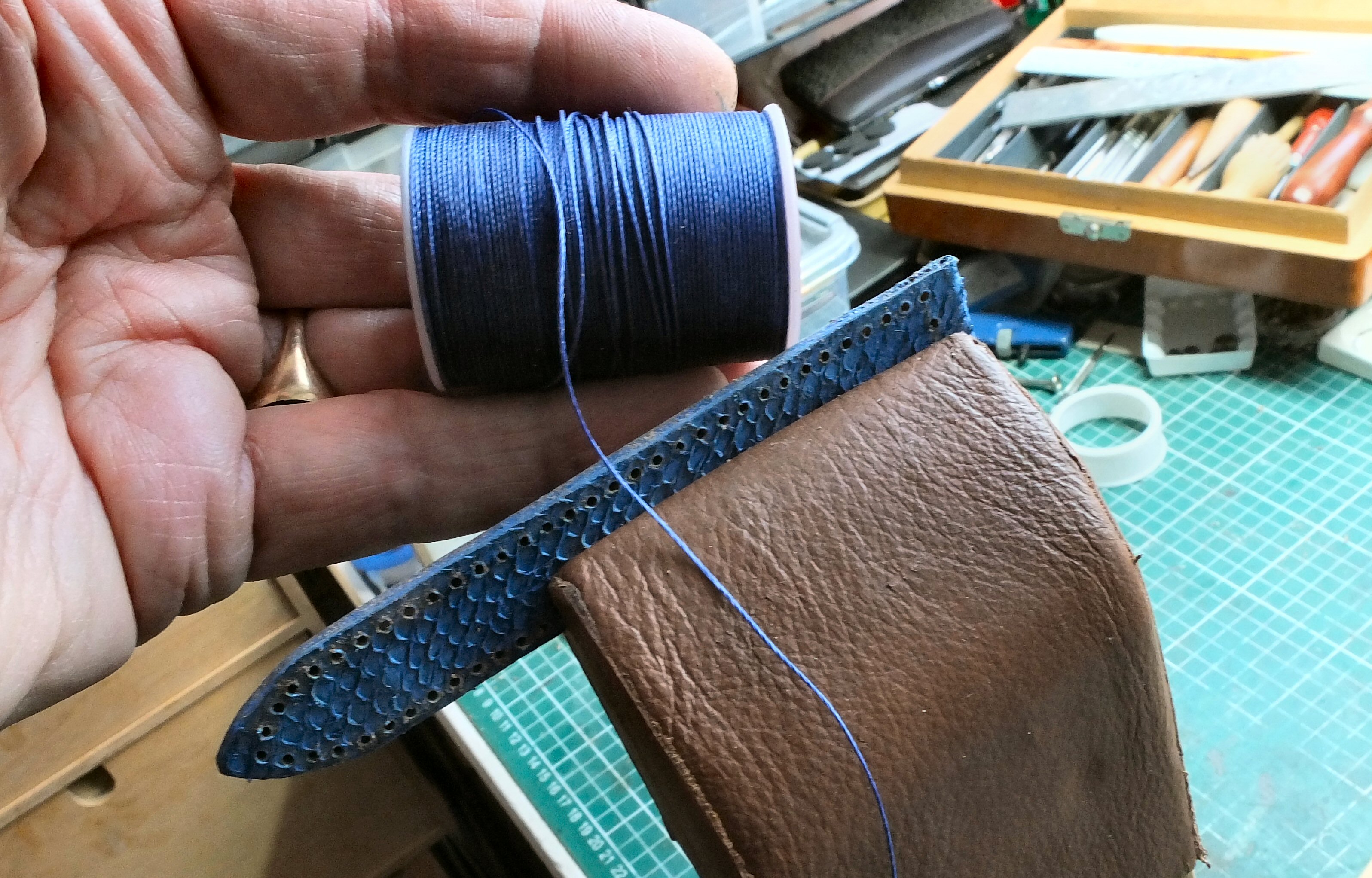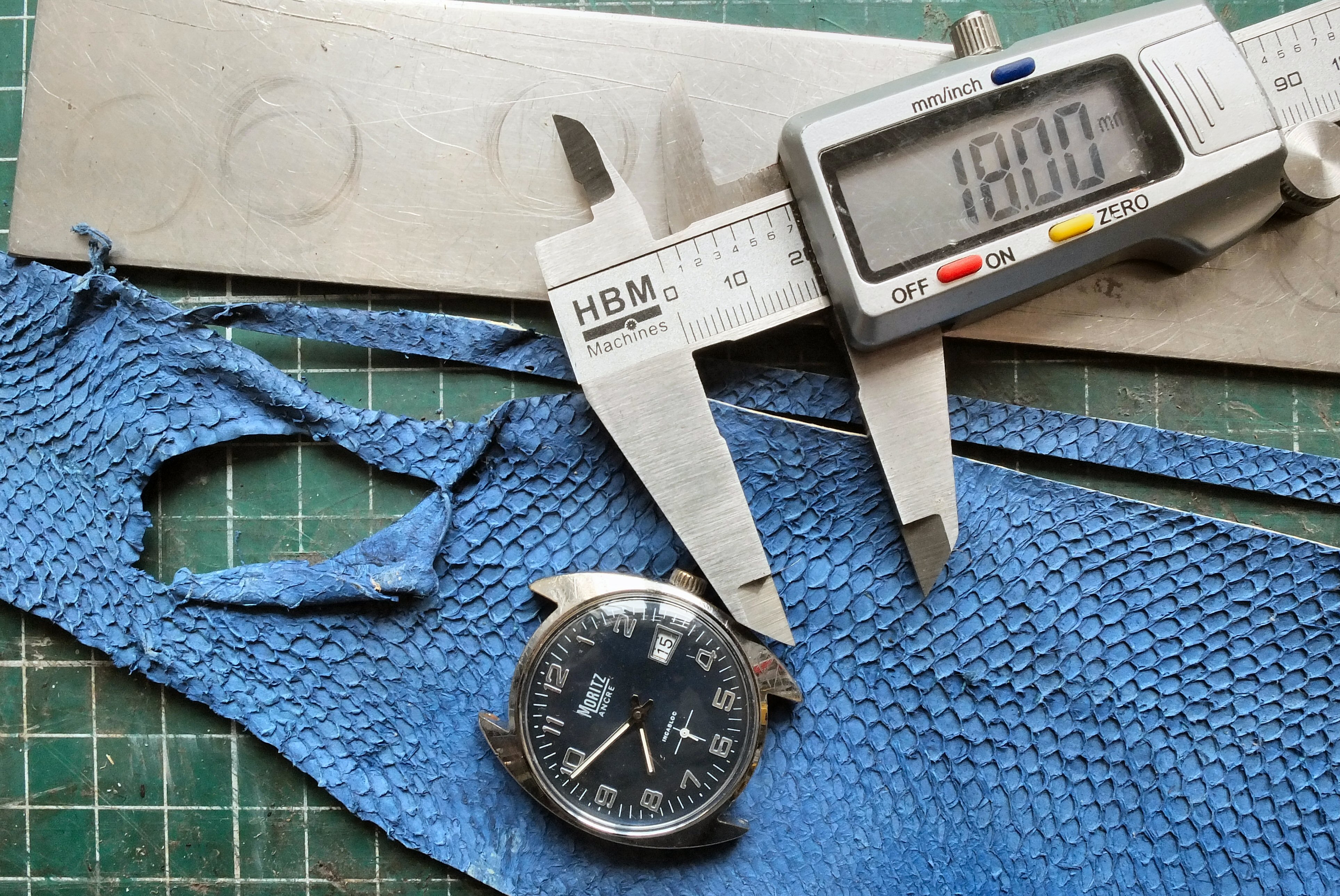 Men snijde een reepje vissenleer van 18mm, een reepje rundleer van de zelfde breedte voor het horlogebandje en nog een stukje vissenleer van 6mm voor de keepertjes.