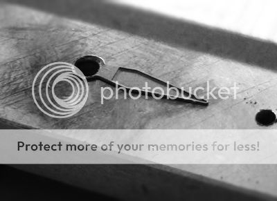 Nippel in de geleiding en in de wijzernaaf. Principe: het gat in de wijzer is te klein, door de nippel erdoor te drukken, wordt een randje materiaal rondom het gat omgevouwen zodat je een rond kraagje krijgt…
