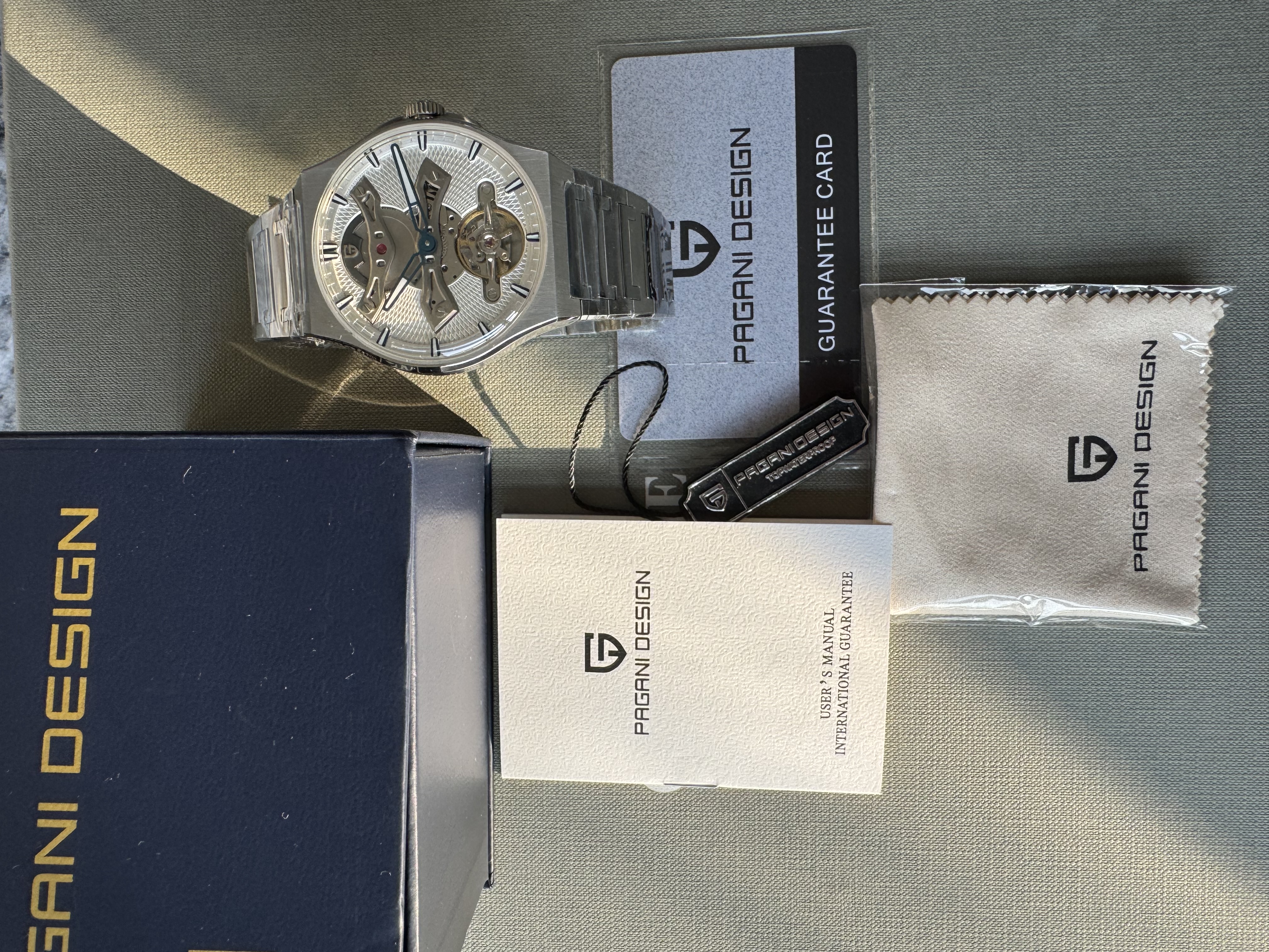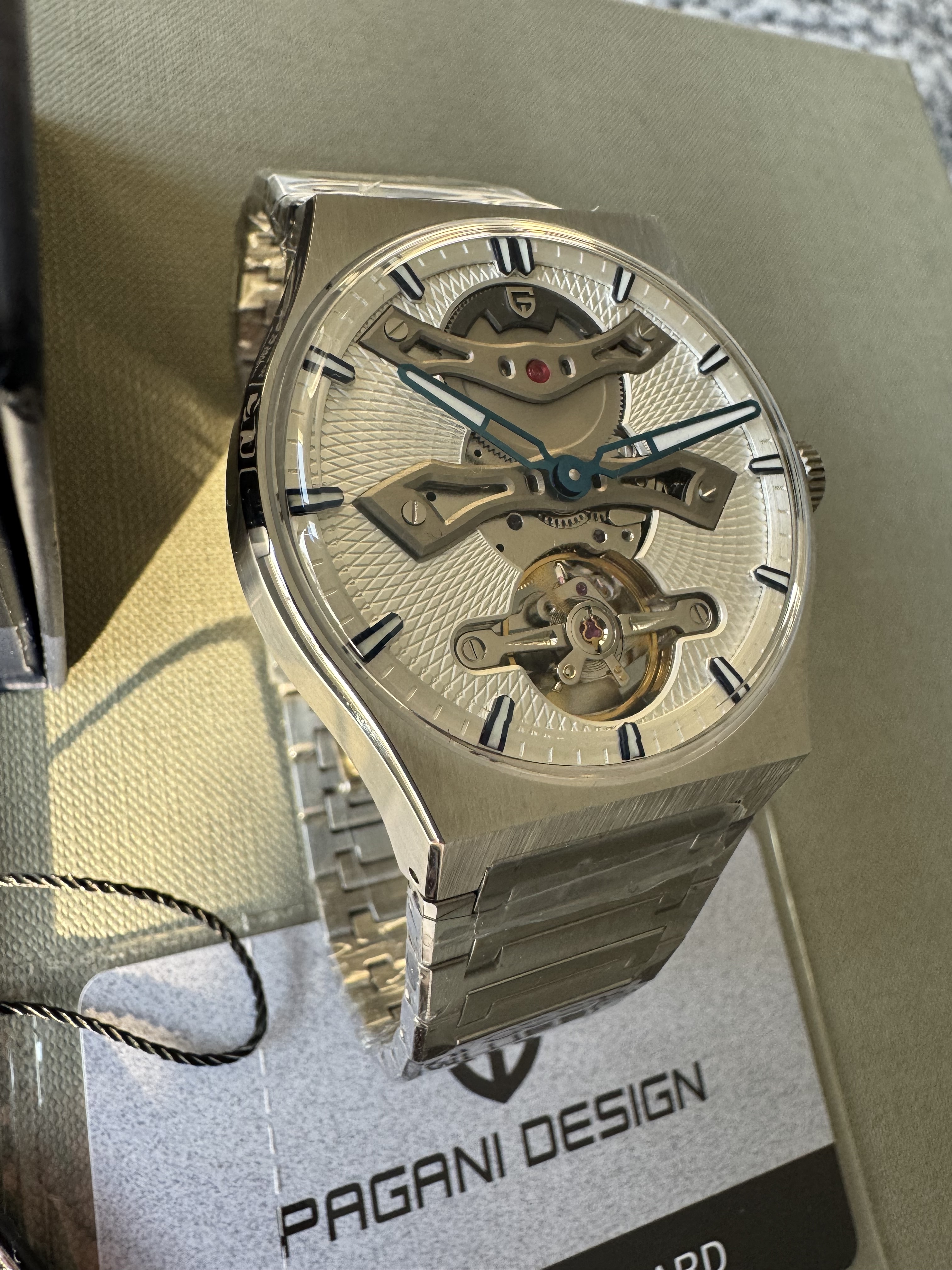 Snuffelend op de bekende Chinese webwinkel kwam ik dit model van Pagani Design tegen. Ben een liefhebber van Zwitserse indies, en was nieuwsgierig naar de value for money van deze Chinese variant van dat ene Zwitserse merk. Daarom deze aangeschaft. Helemaal leuk, maar ik ga hem niet dragen. De afwerking van de wijzerplaat is ongelofelijk voor dit geld. Nieuwprijs is momenteel €178. Ik wijs op een onvolkomenheid op de wijzerplaat. Eén van de bruggen zit niet strak gemonteerd op de plaat (middelste brug, links). Het hindert het functioneren van het horloge niet (getest bij horlogemaker) en je ziet het bijna niet. Ik heb er rekening mee gehouden met de vraagprijs.