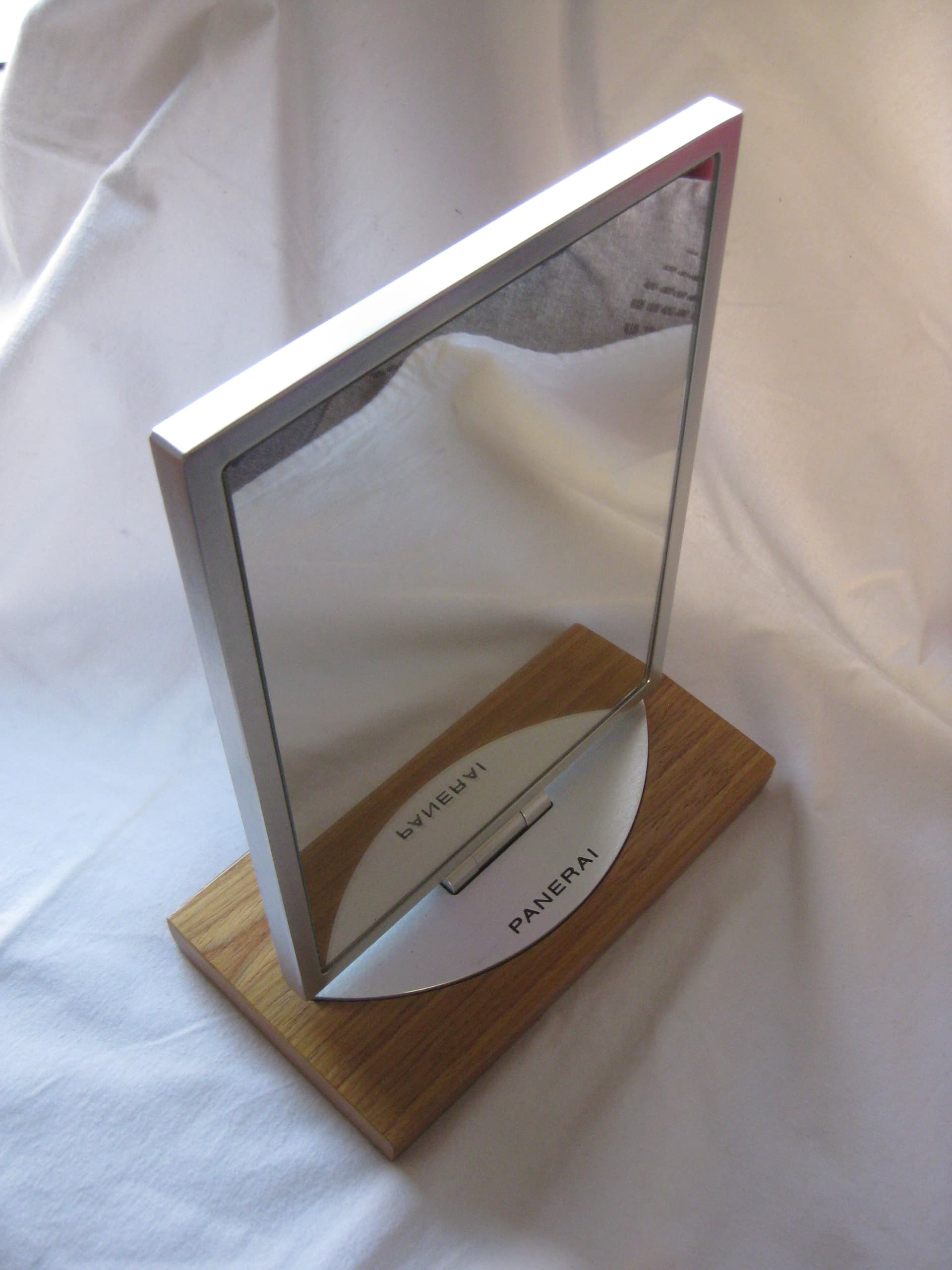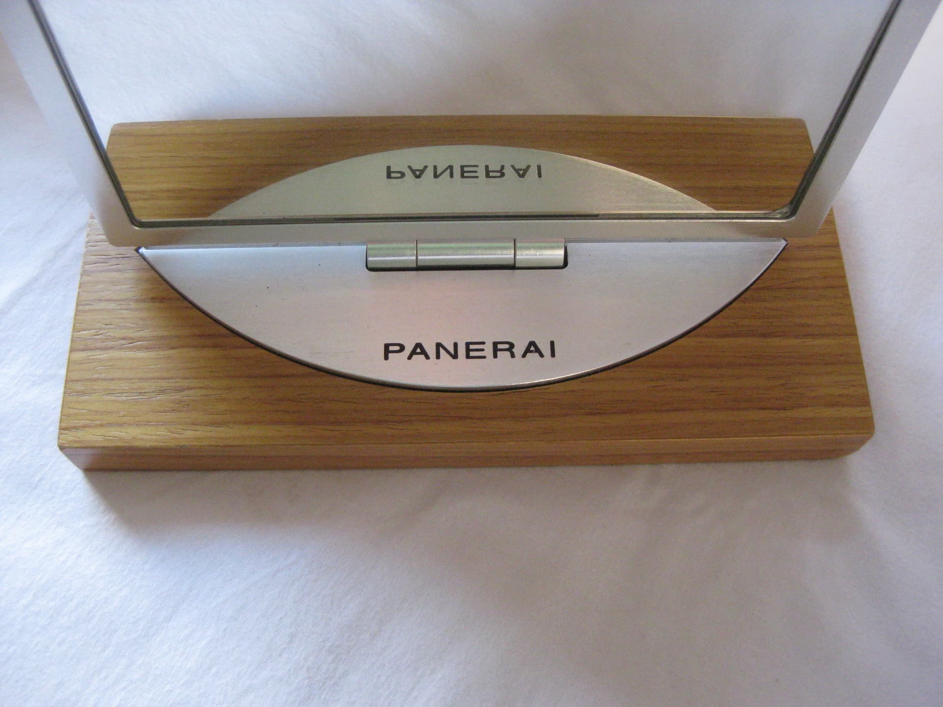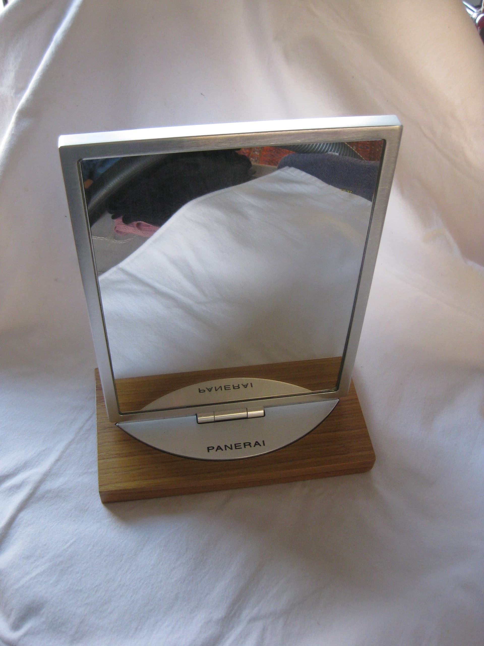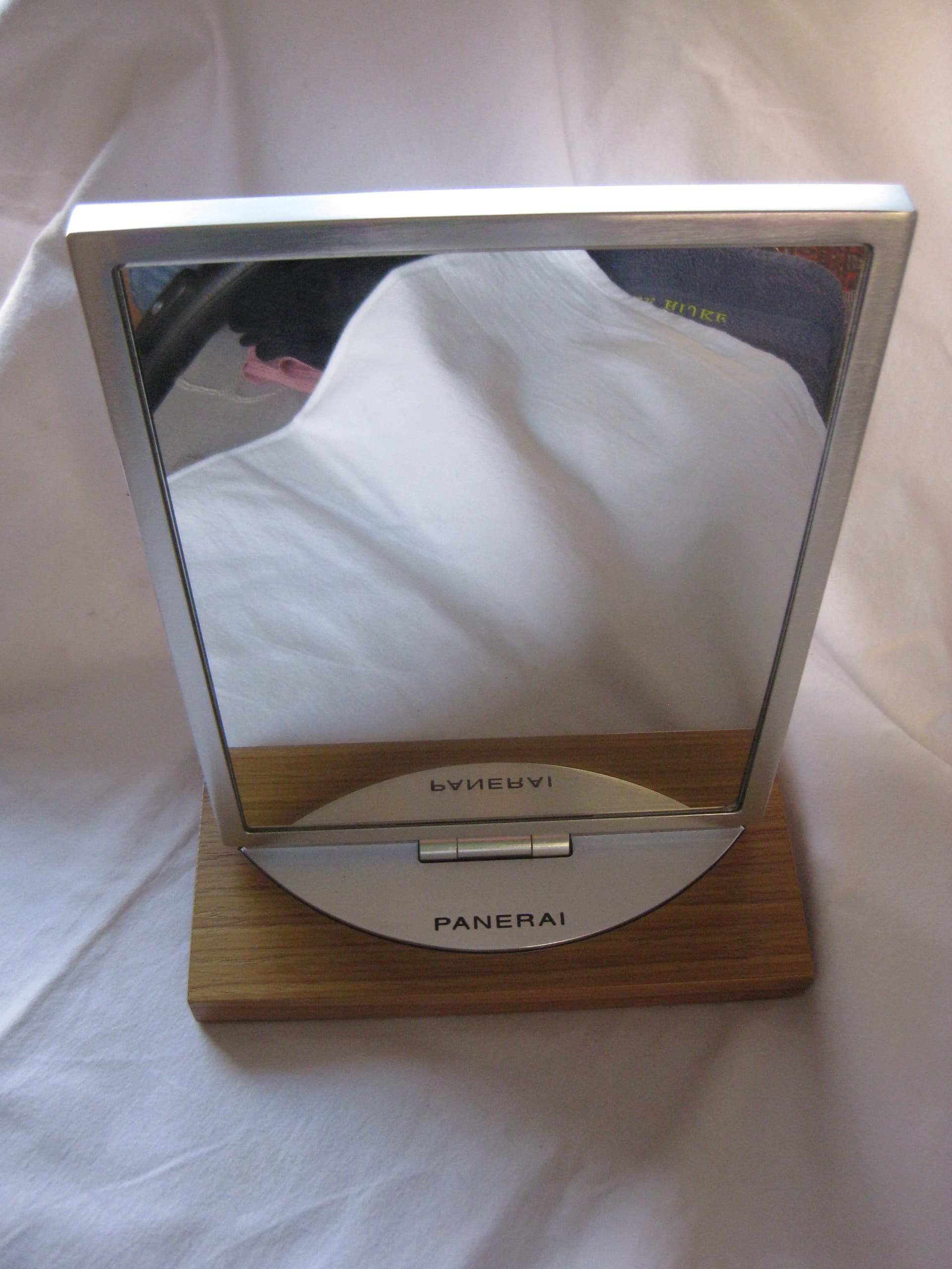 Te koop : Uit mijn collectie, mag deze weg. Een originele Panerai dealer display spiegel. Deze stond op de tafel tijdens het passen en overleggen, kon de klant kijken hoe hij op de pols stond tijdens passen. Spiegel is nog in goede staat, dit is het vintage model, later zijn er andere modellen uitgebracht voor bij de dealer.