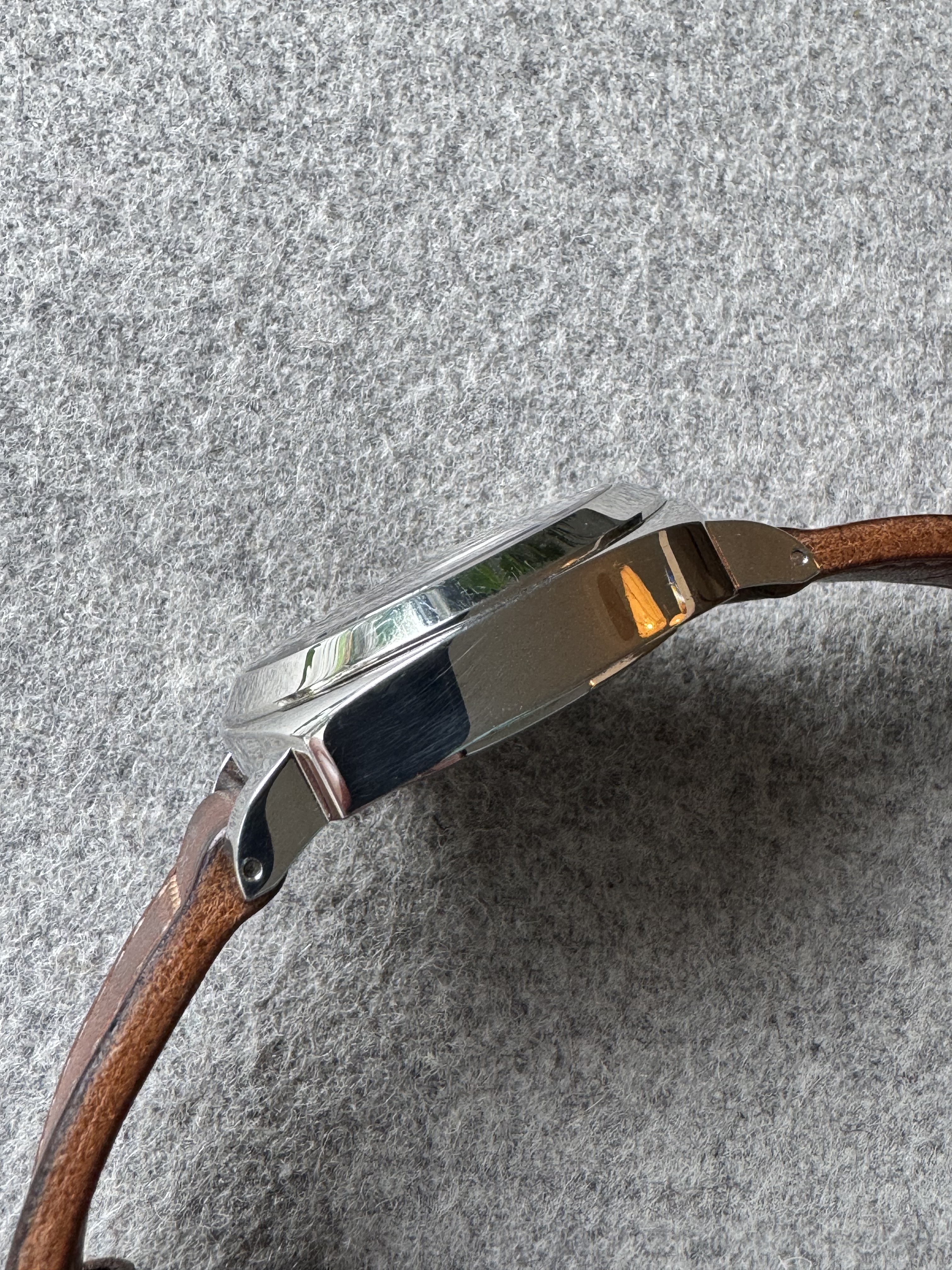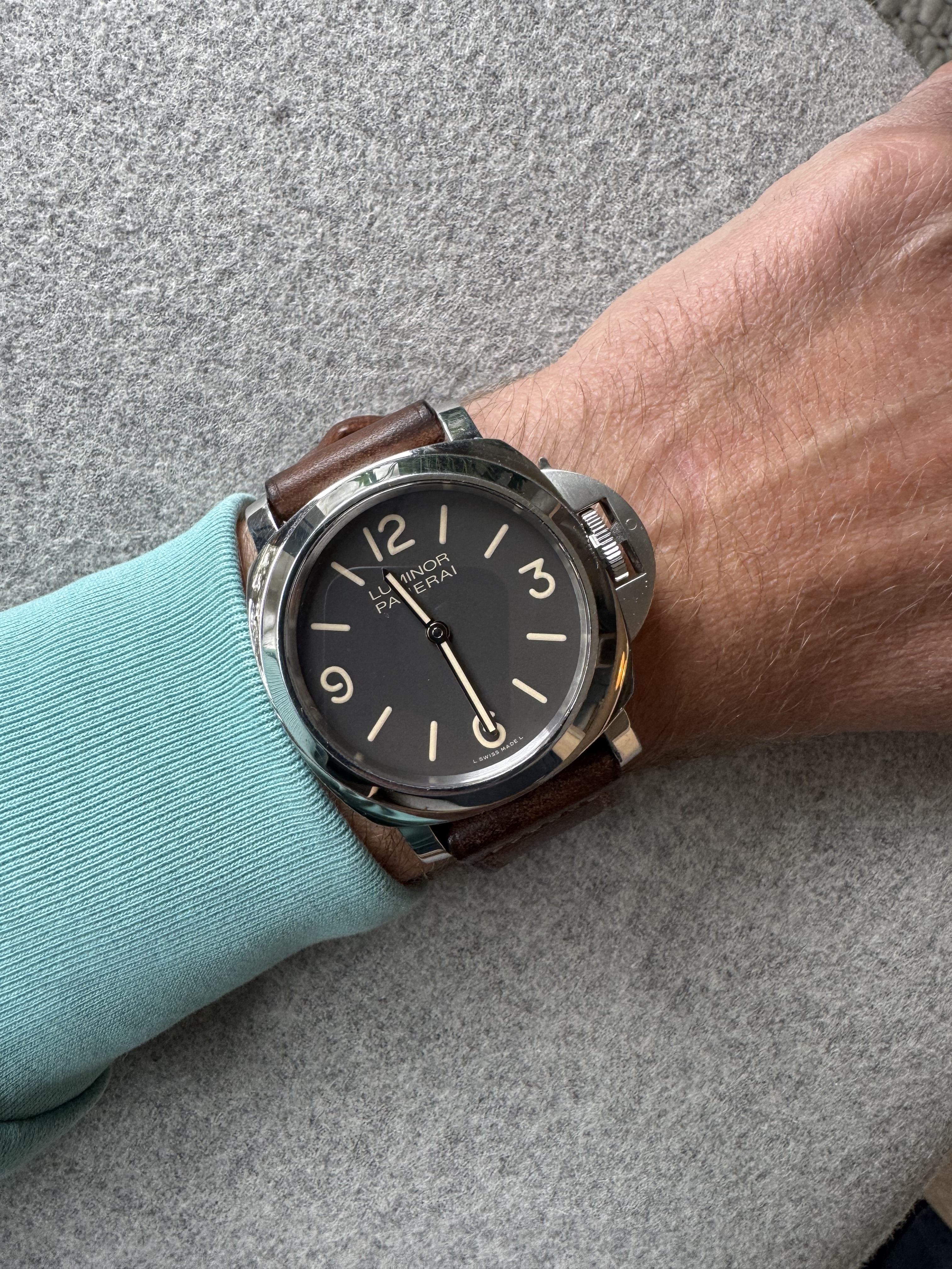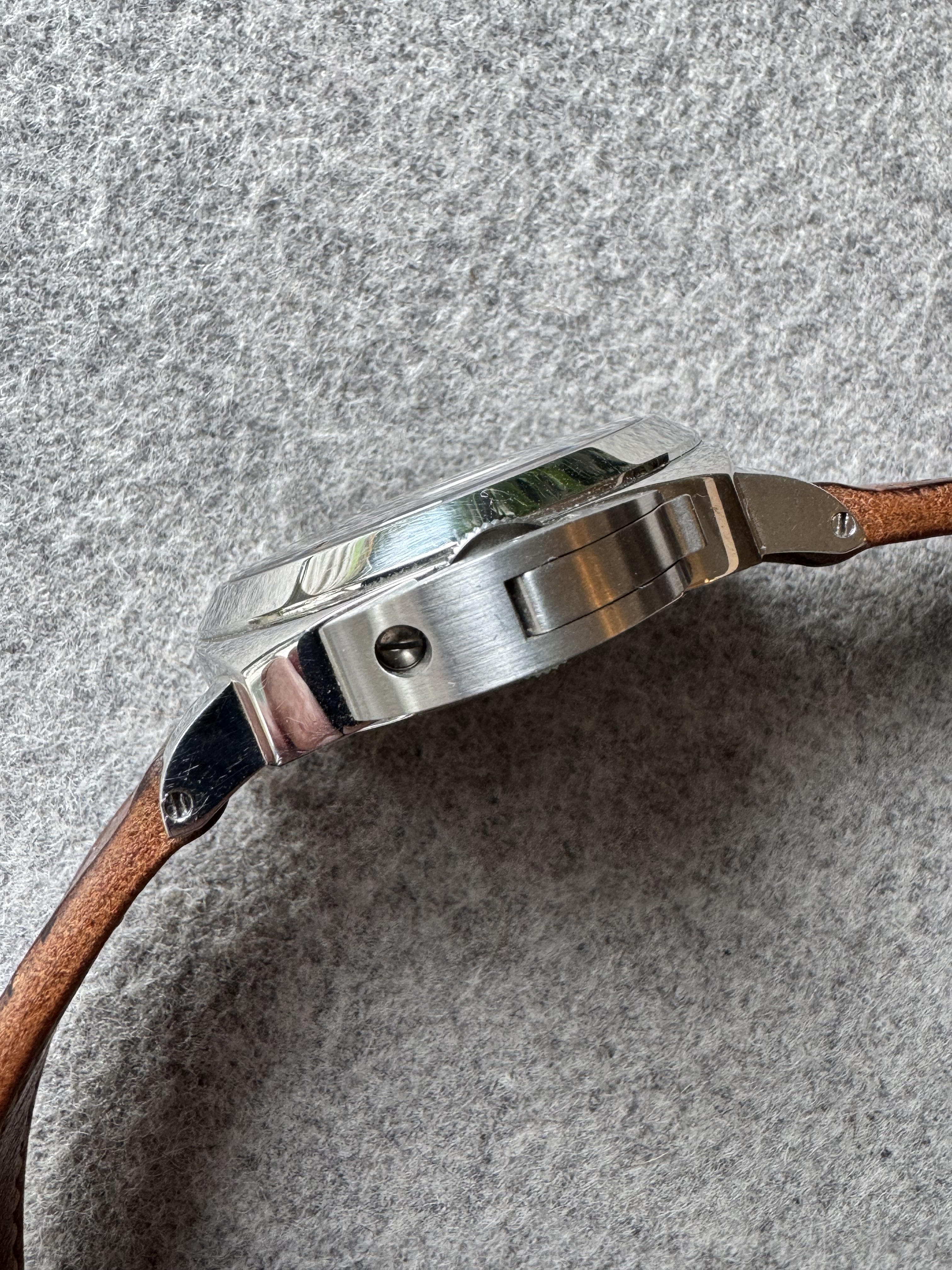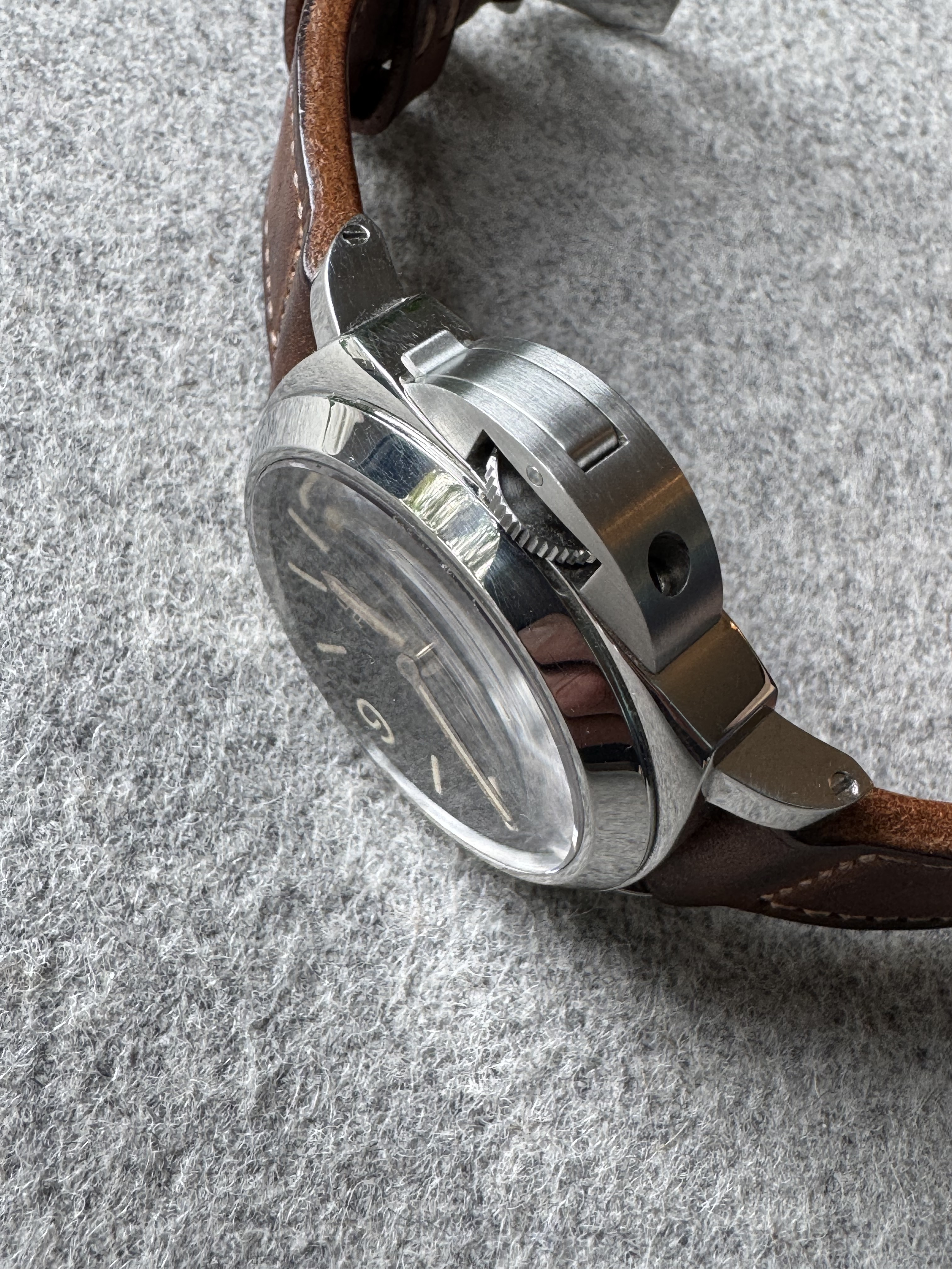Uit mijn verzameling bied ik deze Panerai Luminor Marina ‘Boutique Edition’ uit 2012 aan. Dit is een limited edition van 2000 stuks; deze heeft nummer 0054. Het referentienummer is PAM00390. Het aantrekkelijke aan dit model is dat het de eenvoud van een basis Luminor combineert met de vintage vibes van de Tobacco bruine wijzerplaat en goudkleurige wijzers. En gewoon wel 300m waterdicht. Dit horloge heeft normale gebruikssporen voor zijn leeftijd. Ik heb het horloge van een Franse Panerai-liefhebber gekocht, die ik via Chrono24 vond. Het horloge komt zonder doos en papieren, maar wel met handelaarsrekening van CC Watches uit Monaco (2023). Originele Panerai bandje zit erbij (gedragen staat); inmiddels heb ik er een mooie aftermarket band op gezet. Originele buckle.