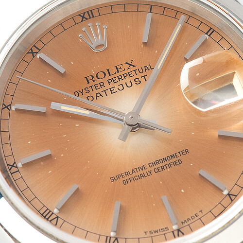 Voor de volgende Datejust had ik lang geleden al een zwak. De meeste zilveren wijzerplaten in de Rolex Datejusts verkleuren steeds warmer over tijd. De onderlaag van de wijzerplaat schijnt als het ware steeds meer door. Een wijzerplaat bij de 5-digit saffier referenties heeft dit verreweg het ergst, hoogstwaarschijnlijk komt dit door het productieproces. In dit geval veranderd de zilveren plaat naar een prachtige warme zalmkleurige wijzerplaat die in dit geval kleine vlekjes bevat die me doet denken aan een sterrenhemel.