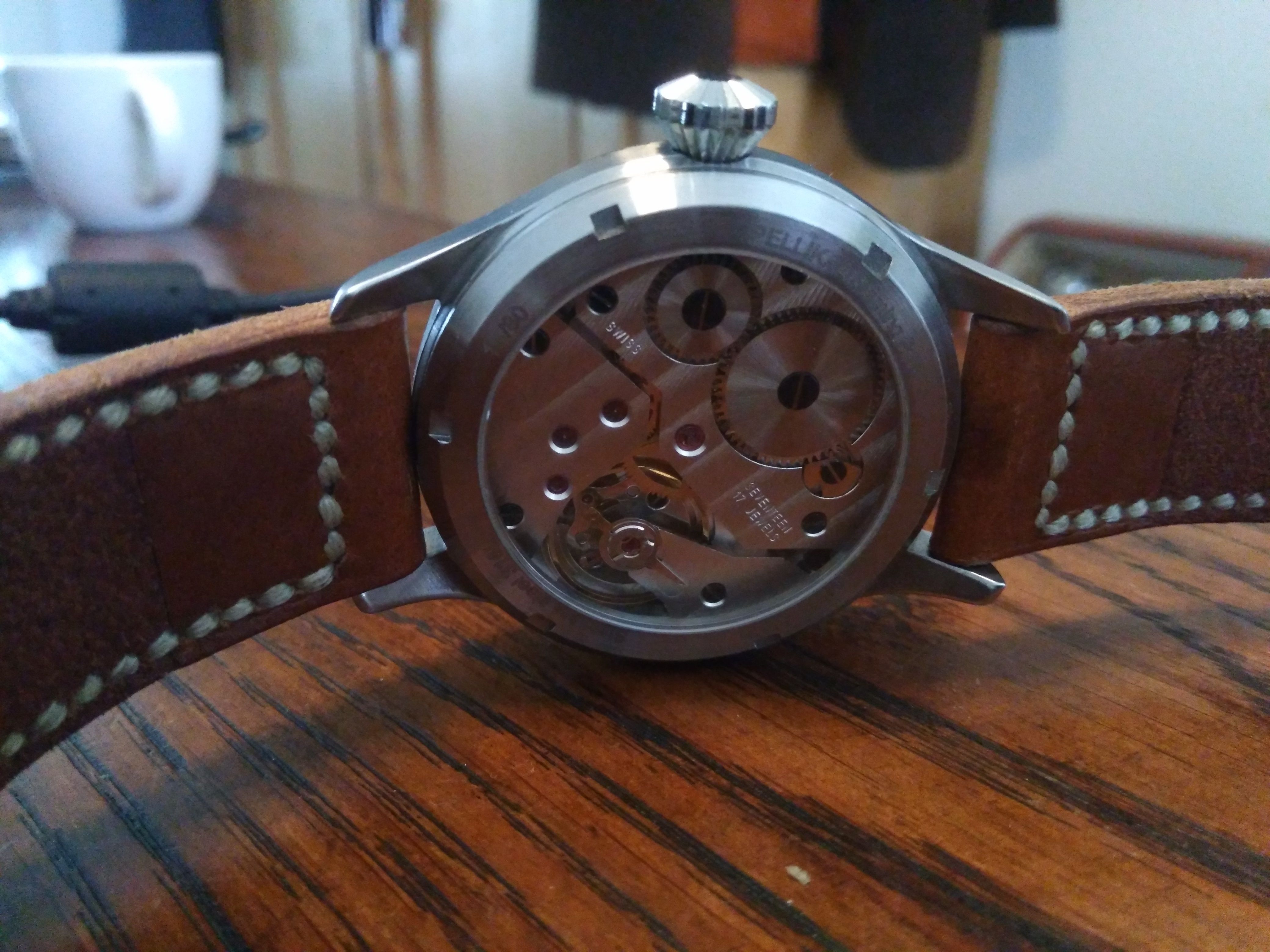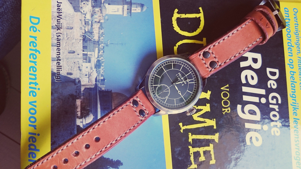 Toen ik deze recente aanwinst hier liet zien droeg ik deze nog op een NATO. Dat draagt best prettig in deze periode van het jaar. Enkele reageerders riepen al dat deze op leer mooier zou zijn. Ik had nog een mooie Ko strap liggen en deze er gisteren maar eens op gezet. Ik moet zeggen dat ik er best tevreden mee ben. Ziet er toch wel wat mooier uit dan textiel en de caseback is zichtbaar. Dat laatste is gezien het mooie uurwerk best fijn.