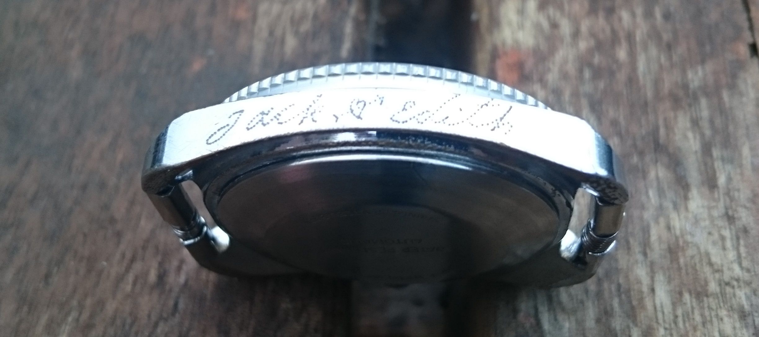 Vorig jaar kocht ik van een beroepsmilitair zijn trouwhorloge. Na drie jaar alweer gescheiden wijf pleite dus klokkie Longines hydroquest automatic met lieftallige inscriptie kon ook maar meteen vertrekken. Ik haalde er mijn voordeel uit en gelukkig stond de inscriptie in de vouwsluiting.