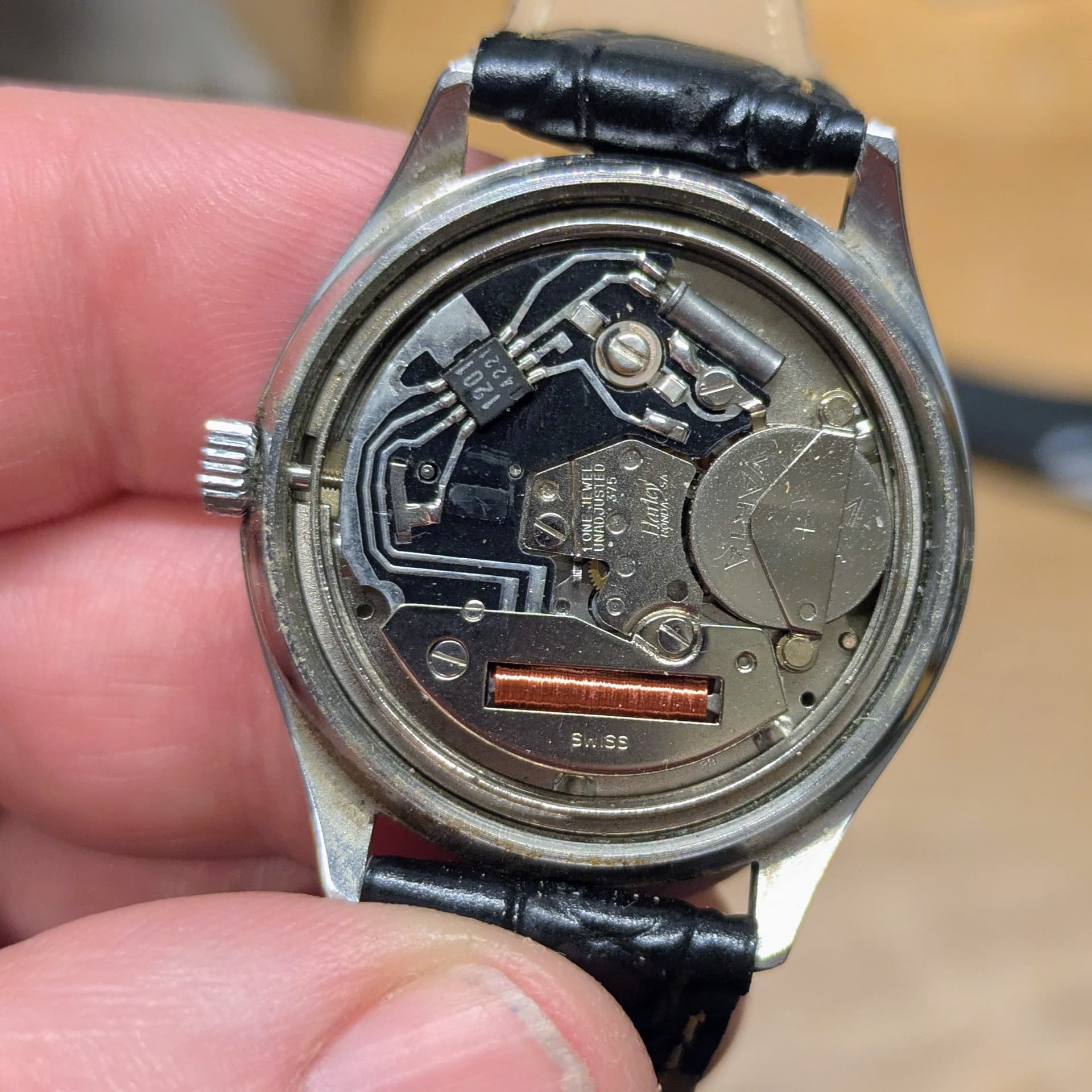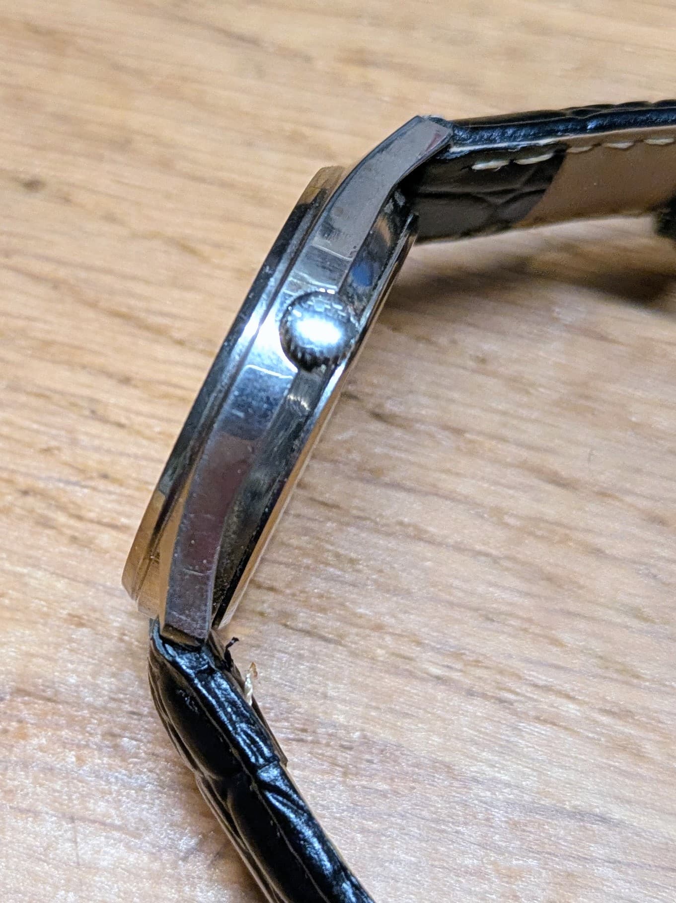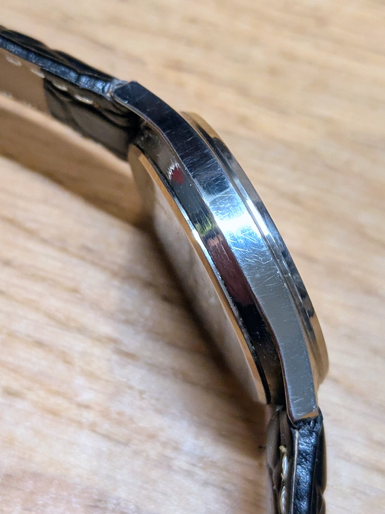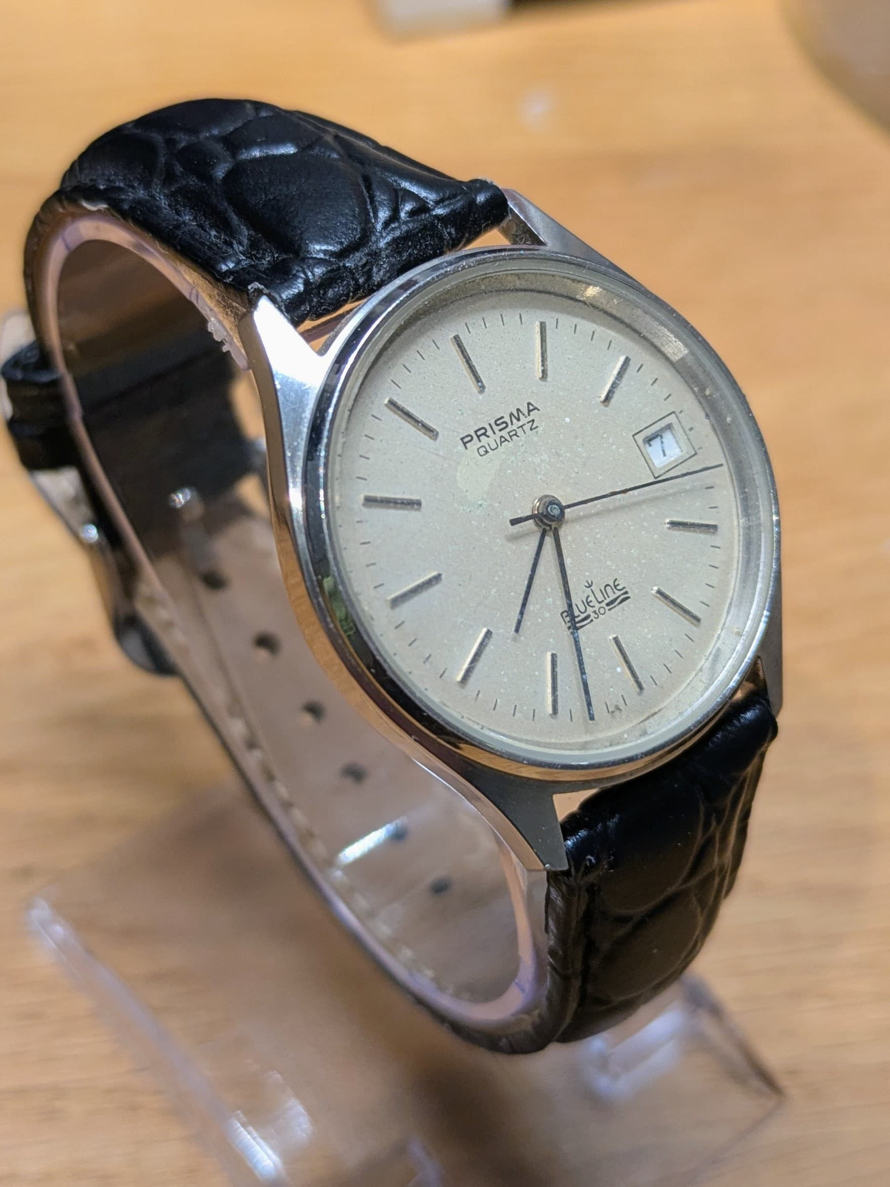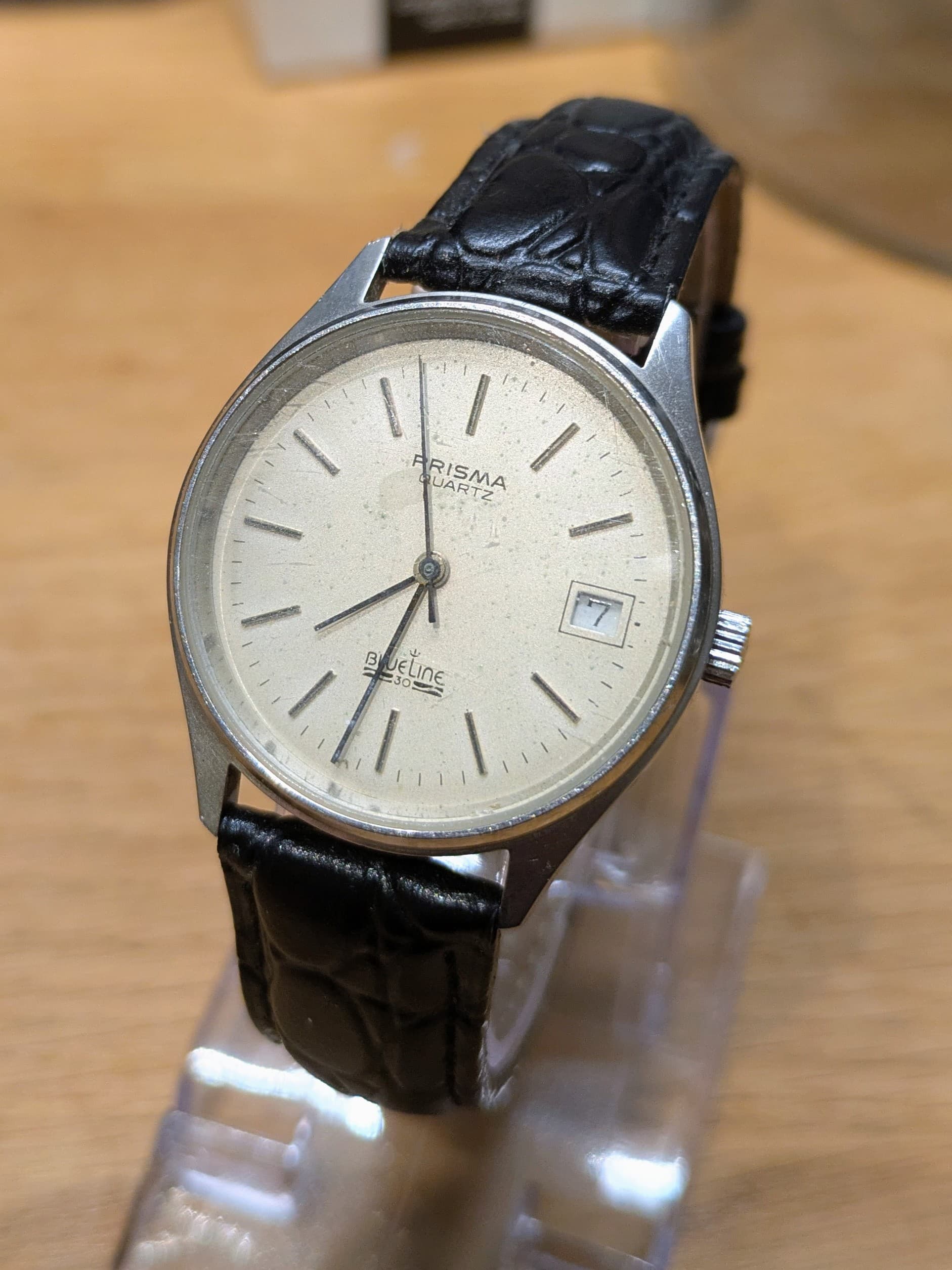 Erg leuk quartz horloge met een, naar mijn mening, lichte patina op de wijzerplaat. De kast is nog best netjes voor zijn leeftijd en het glas heeft enkel wat lichte haarlijntjes die onvermijdelijk zijn bij mineraalglas. Wat mooi is aan dit horloge is dat de secondenwijzer strak op de indices tikt. Bandje is inbegrepen.