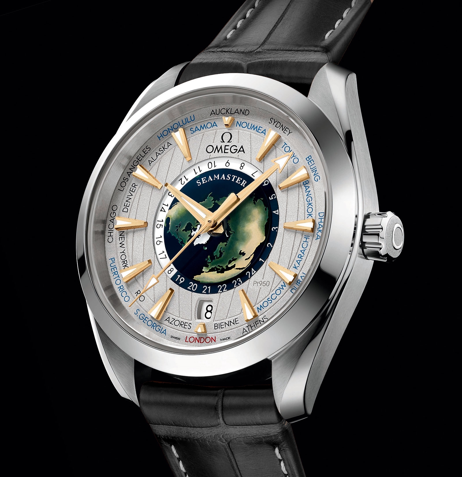 An ultra-luxe Omega with a platinum dial bearing a “grand feu” enamel world map