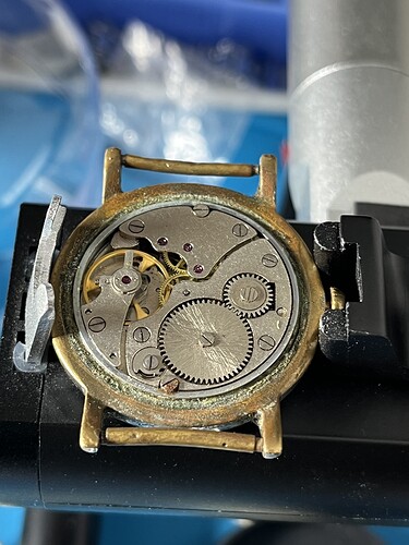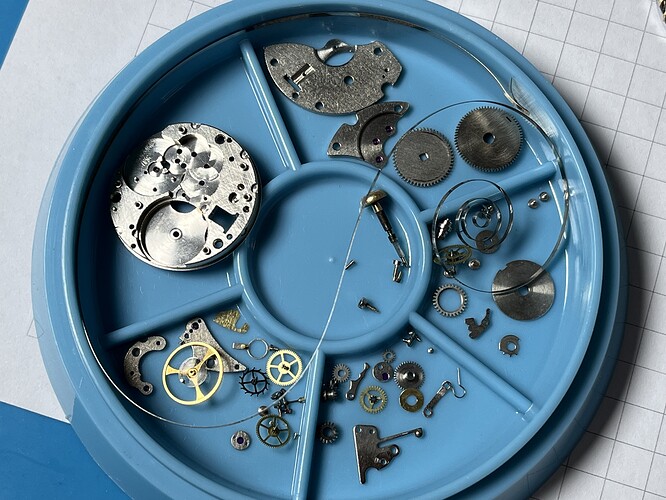 Nou vandaag alles onder de wijzerplaat monteren. De opwindas en gelijk de kroon omgewisseld. Was net iets te versleten waardoor hij van uurverzet terug naar opwinden bleef hangen. Voor de schoonmaak viel de as er gewoon uit.