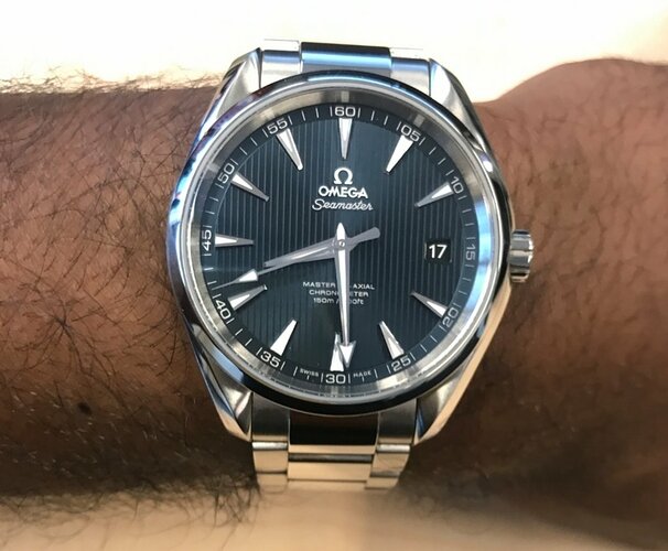 De horizontale strepen, in combinatie met het datumvenster op 6 uur geven het horloge een prachtige symmetrische look. Een blauwe wijzerplaat heeft me altijd al getrokken, en de wijzerplaat op de Aqua Terra is (na wat ik op fotoās heb gezien) vanuit ieder licht geweldig!