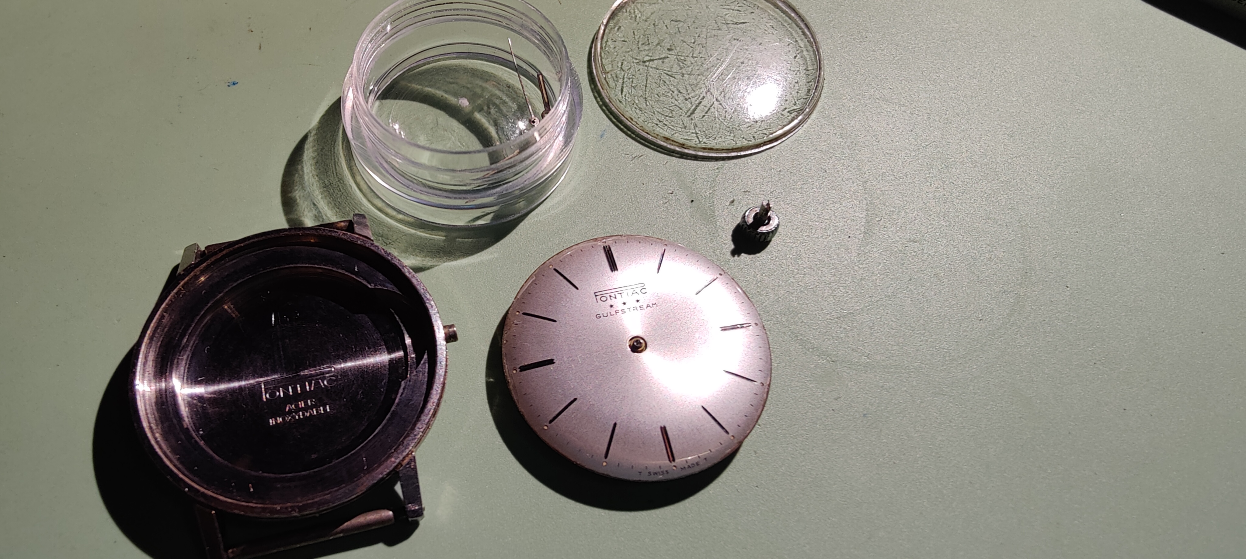 Het uurwerk moet er via het glas uit. De opwindstift bestaat uit 2 delen en is een zogenaamde deelbare stift (met een mannetje en vrouwtje kant).