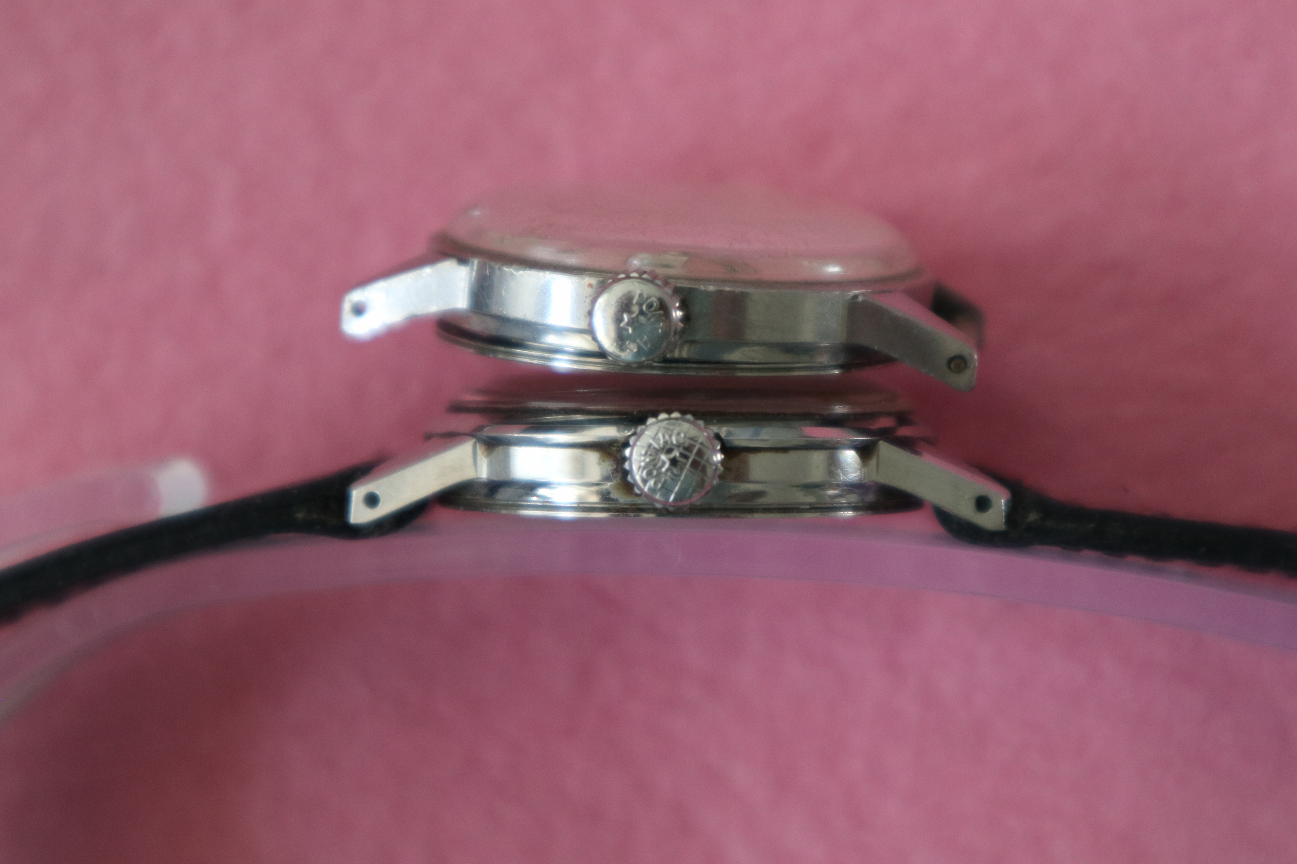 Mijn exemplaar met verchroomde kast (links) met de secondenwijzer bij 11 uur