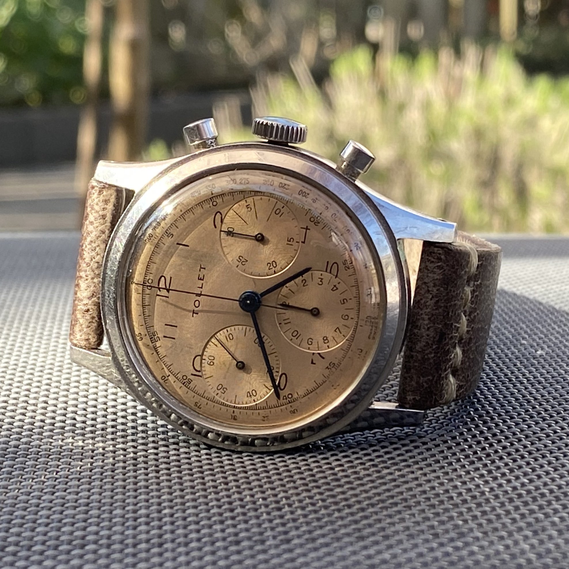 Prachtig horloge inderdaad . Is het zoals gezegd absoluut waard om goed voor te zorgen. Ik verbaas me nog altijd over de kwaliteit, ook ten opzichte van chrono’s van 20 jaar jonger. Ter vergelijking hieronder mijn Tollet. Ik vraag me wel af of jouw horloge uit de 30s komt. Werd de Venus 178 niet pas vanaf de 40s gemaakt?