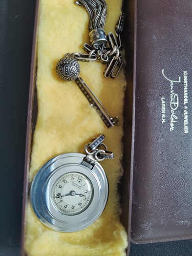 Geen zakhorloge, maar een dames broche horloges van Pontiac, waarvan ik nog een keer moet uitvogelen hoe alle onderdelen aan elkaar gemaakt moeten worden. Loopt trouwens nog heel netjes.