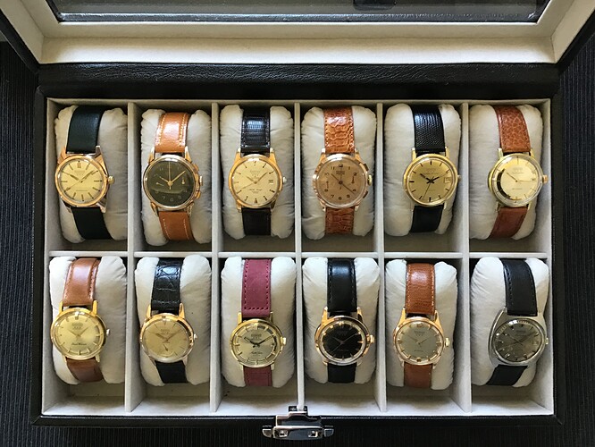 In totaal zijn er 120 met die in de individuele dozen. Het begint ruimte in te nemen met zo’n zestig anderen: Laureat, Union Laureat, Verdal, Ducal, Pronto Verdal, Helva, Cup, Iaxa, Rodania, Rocar, Tissot, Aquastar, Omega, Competition, Solo, LUChopard en Citizen, allemaal mechanisch. 90% van de horloges werken en zijn in goede staat.