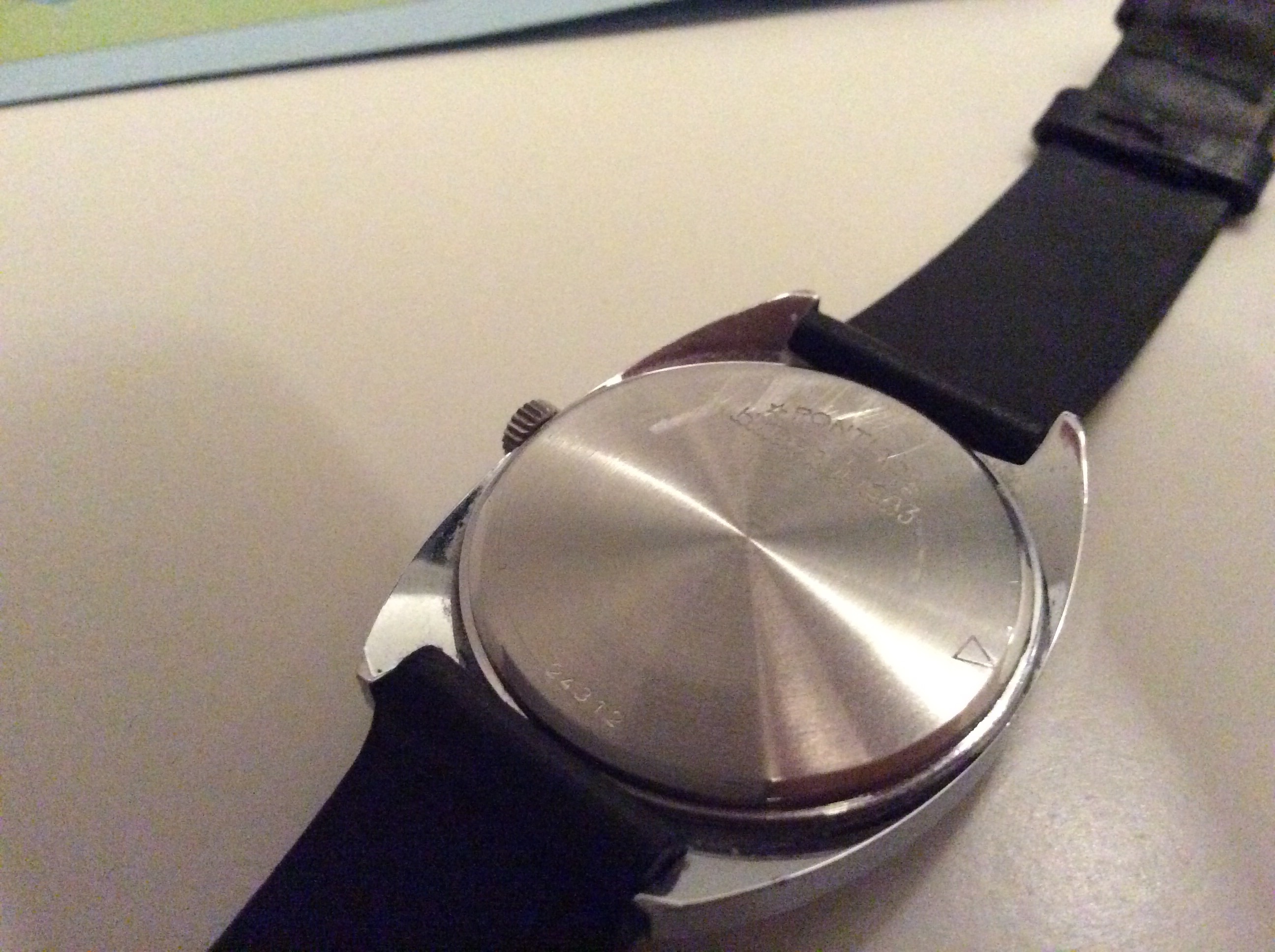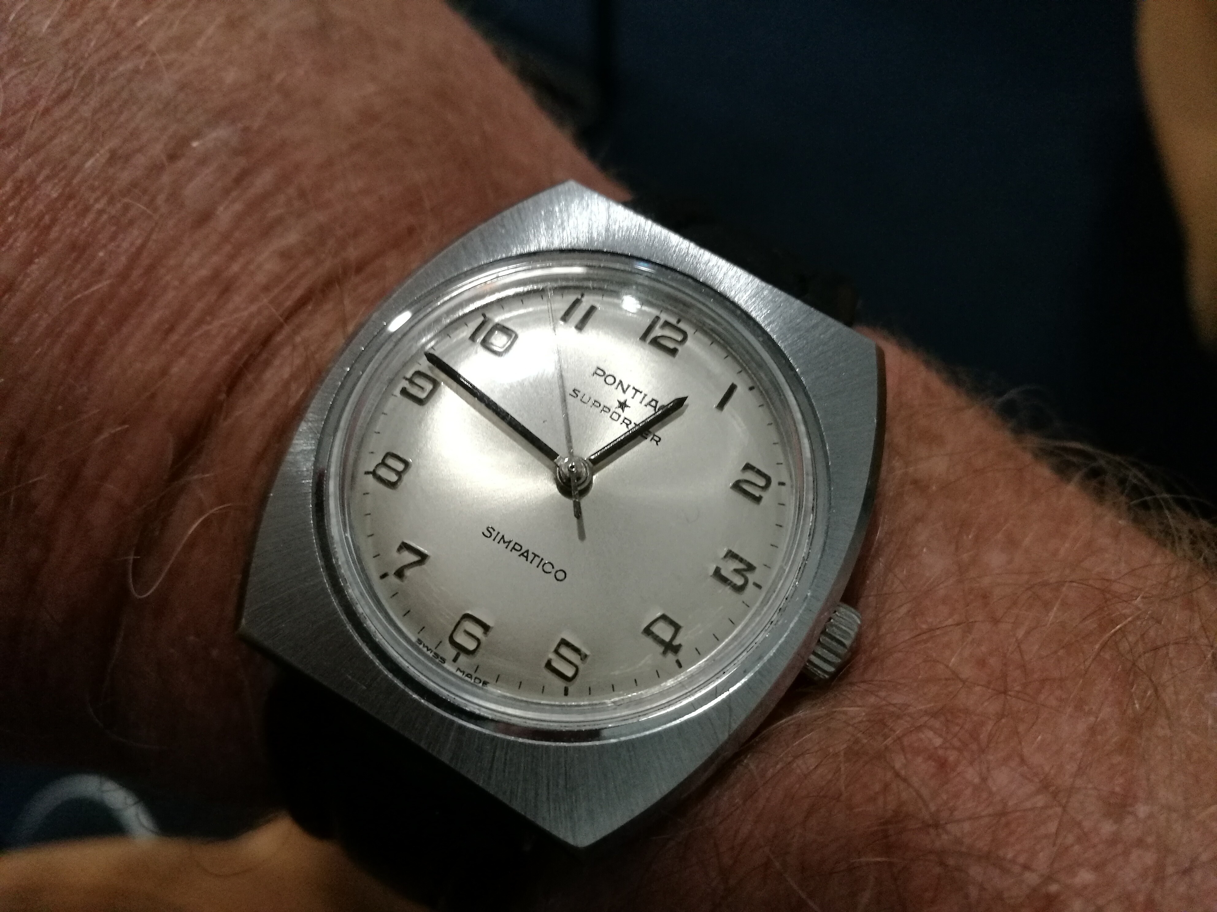 Vandaag lag er weer een bubbeltjesenvelop op de deurmat. Ik had het weer niet kunnen laten en een Pontiac aangeschaft via Marktplaats. Verkoper had in de tekst vermeld, dat het horloge te sterk was opgewonden en daardoor niet liep. Vage foto’s beloven meestal niet veel goeds, maar soms ook best weer eens wat leuks. Zit er ook nog een origineel bandje met Pontiac sluiting aan vast en een originele kroon. Helaas geen origineel glas, maar je kunt niet alles hebben…