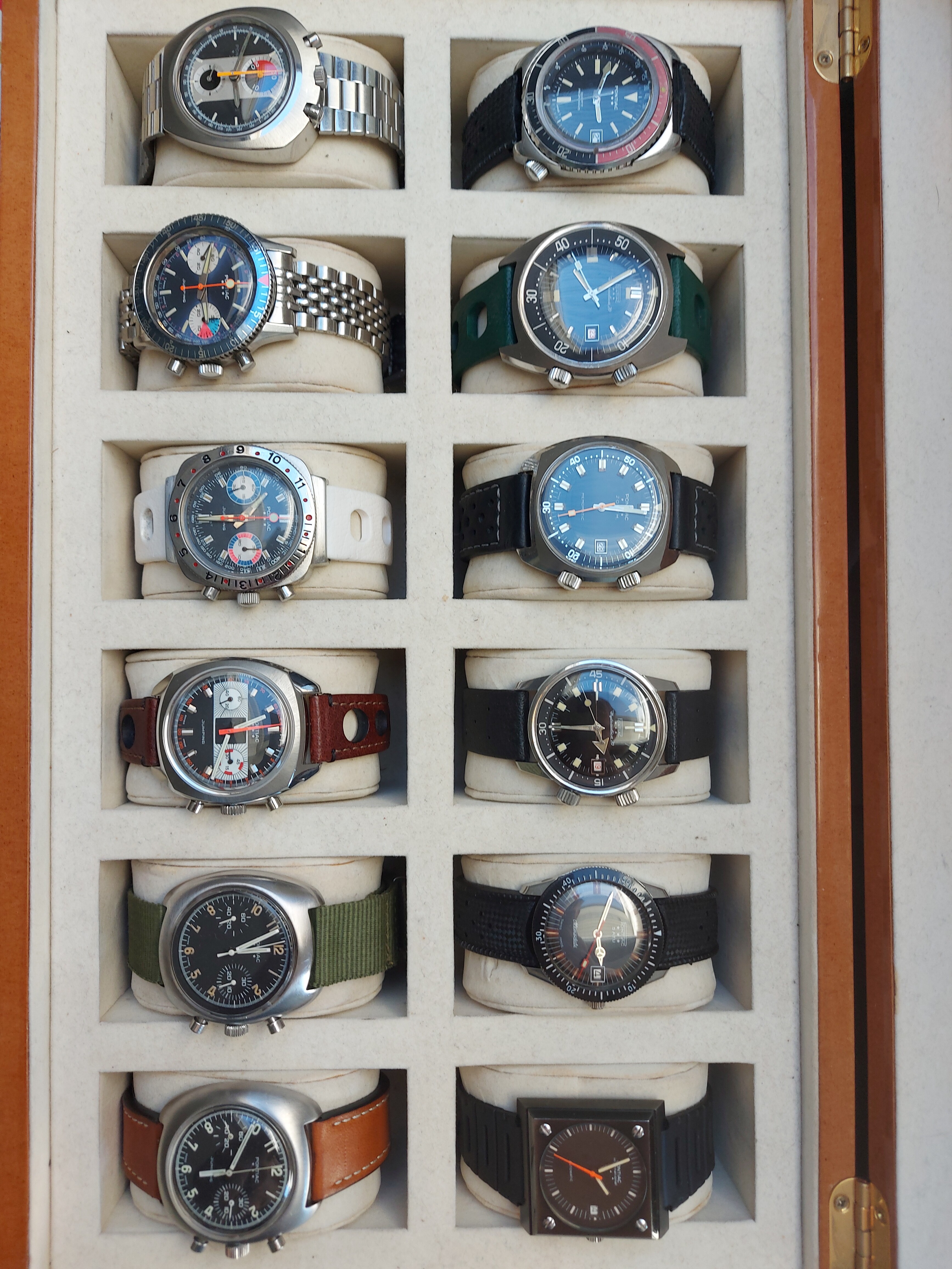Hereby a couple of photos of my watch ‘collection’. The Nageur I bought from Yves and I quite like to wear another old fashioned watch. It runs at +/- 2 seconds a day so pretty good. The 17mm width is an issue as I could not find a 17mm strap but the 18mm one will do.
