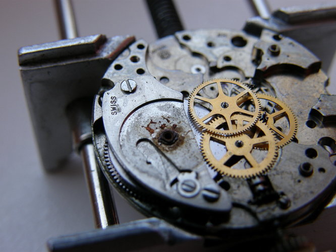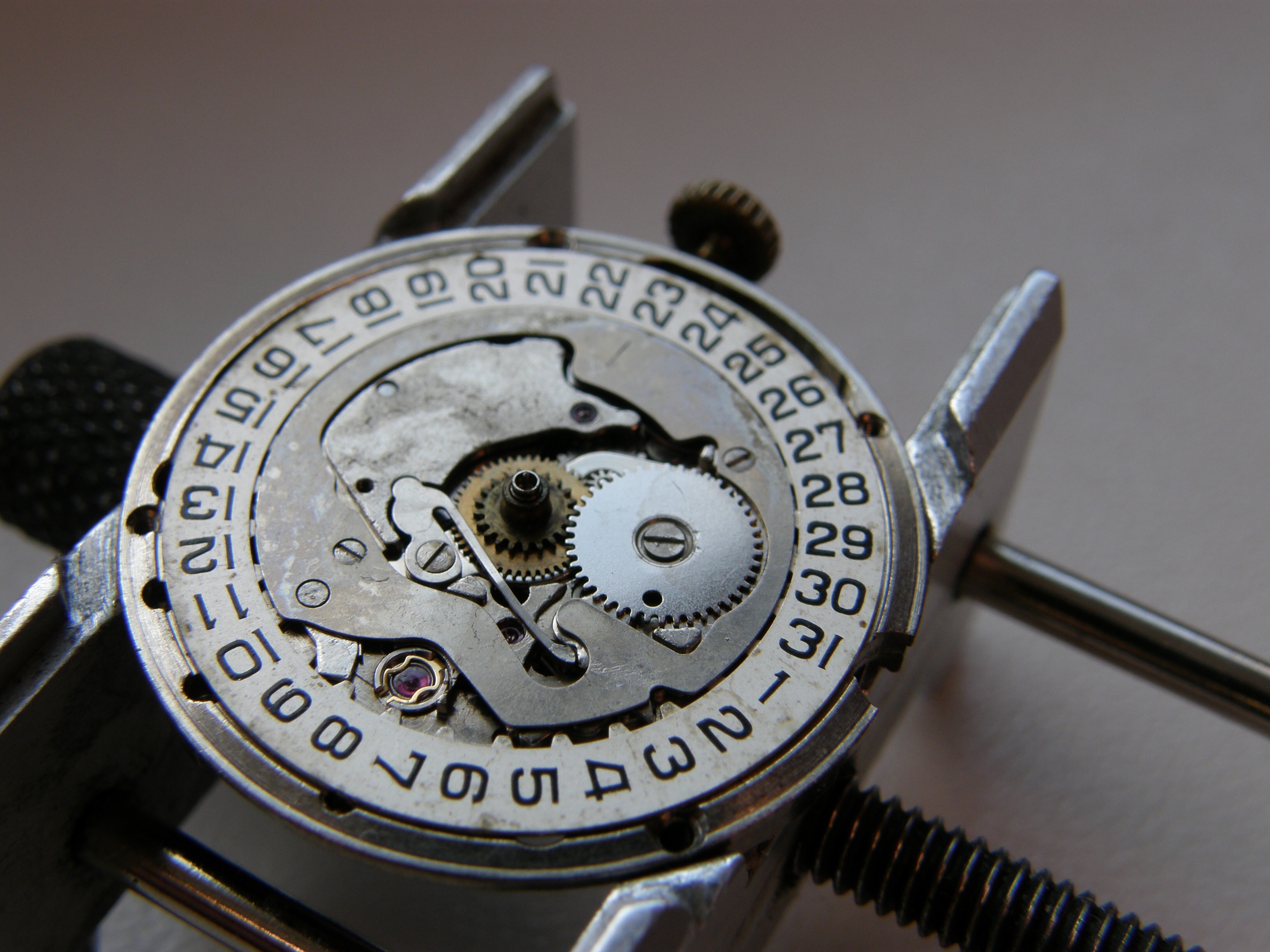 Foto 7: Het datummechanisme compleet gemonteerd, met linksonder een palletje met kleine veer die de datum netjes uitlijnt. Het tandwiel met het gaatje er in heeft aan de onderkant een vingertje. Deze duwt tegen het vreemd gevormde onderdeel onder in beeld dat met de veer links van het urenrad onder spanning komt te staan. Op het moment dat het vingertje loslaat schiet de datum opeens een dag verder. Dit geeft een mooie strakke datumwissel.