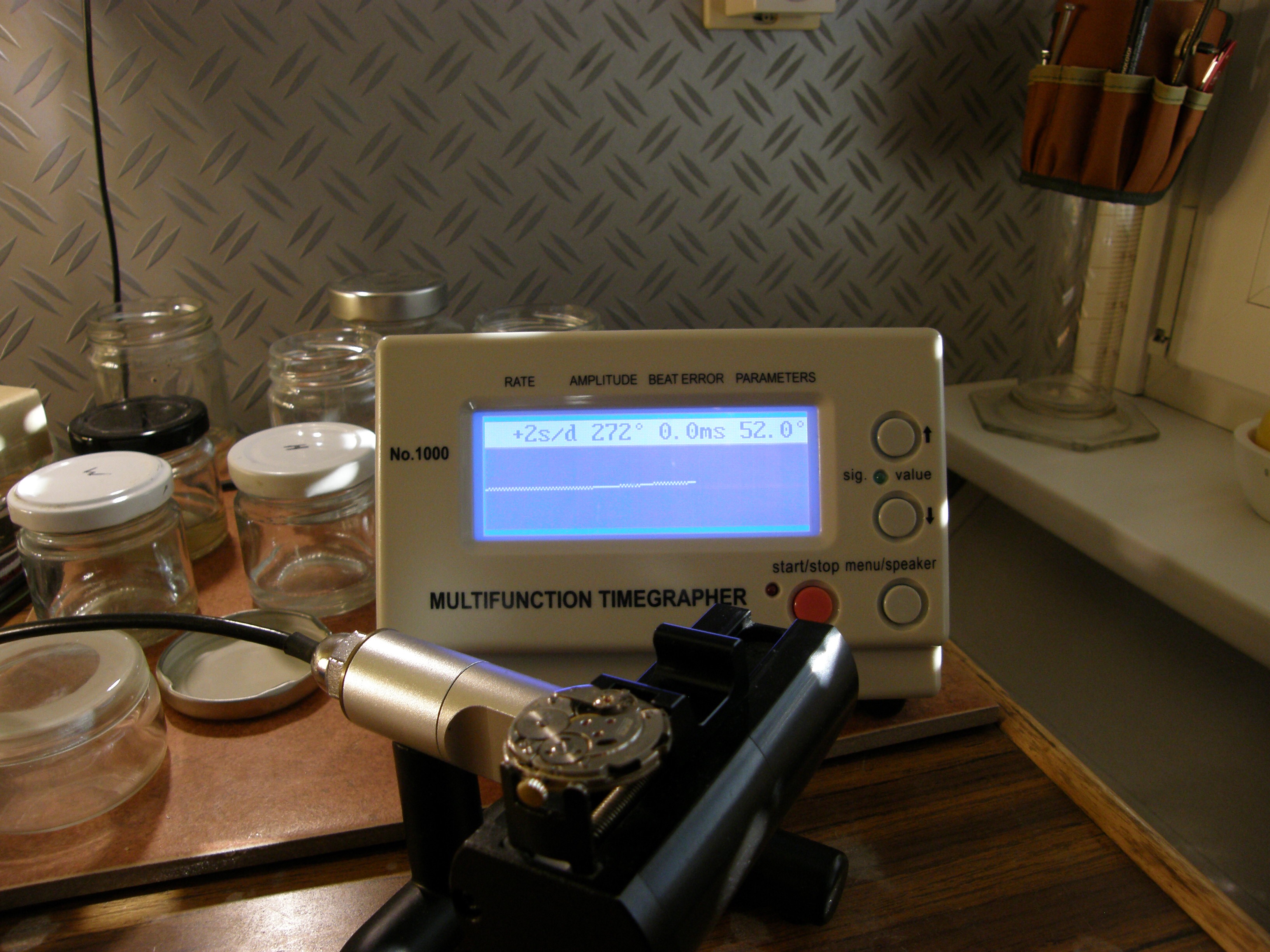 Foto 9: Het uurwerk loopt +2 seconden per 24 uur en de beat-error (verschil tussen links en rechts tikken) heb ik op 0 gekregen. Een amplitude van 272 is heel respectabel voor een oud en doorleefd horloge.