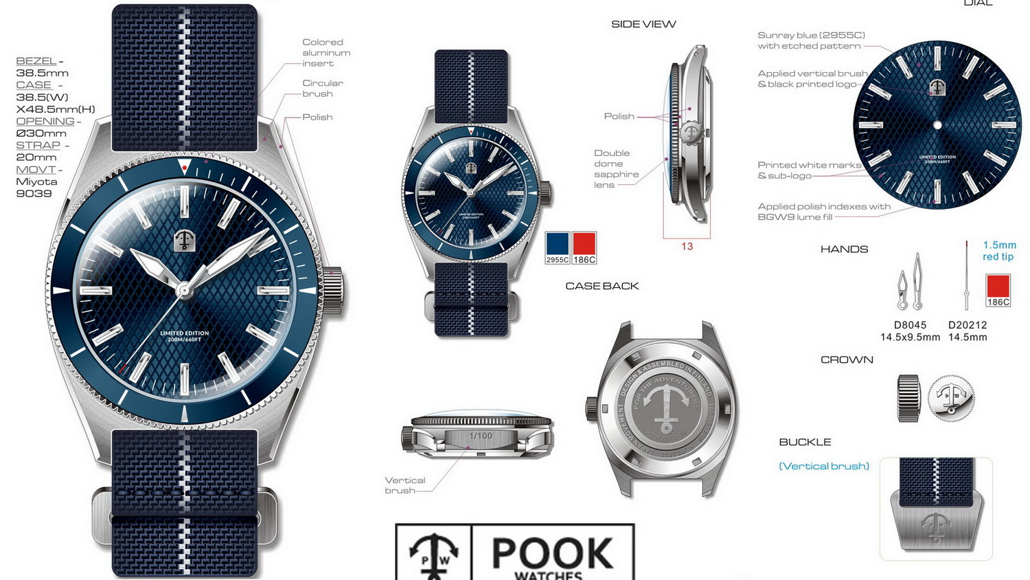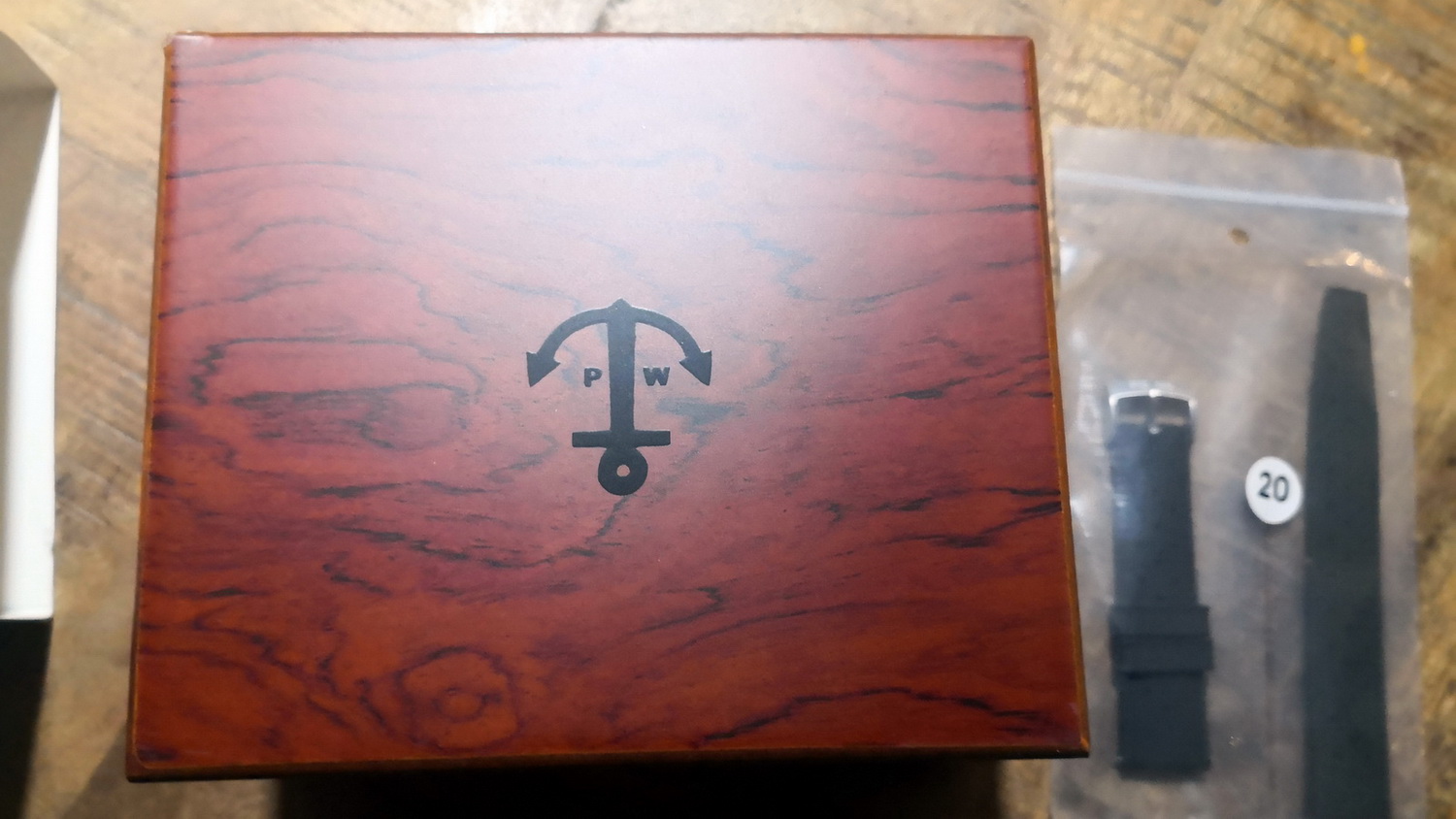 Originele doos en/of eventuele accessoires: full set bestaande uit de mooie houten Pook doos. Horloge komt met de originele blauwe Pook MN-strap en de zwarte Pook tropic.
