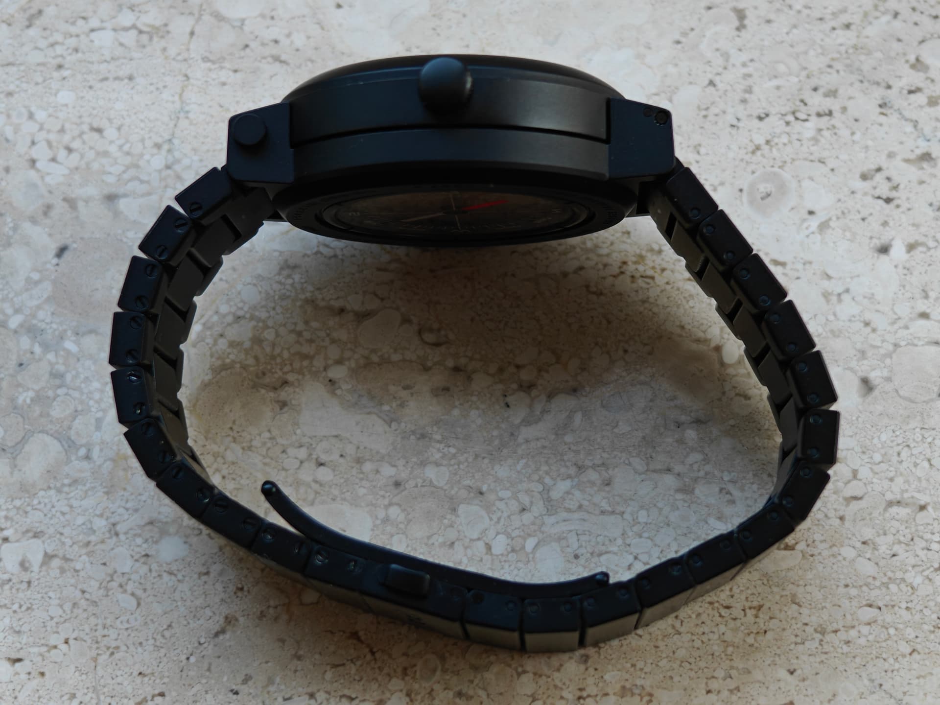 Draagt heel licht en relatief klein voor de maat. Materiaal is titanium met een PVD laag. Geen enkel zichtbaar krasje of andere sporen van gebruik. Alleen stofjes op de foto.