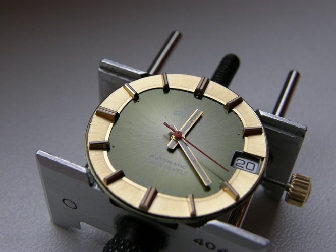 Met interessante snelverzet van datum door de kroon uit te trekken en dan in te drukken dan schiet de datum “springloaded” door naar de volgende dag