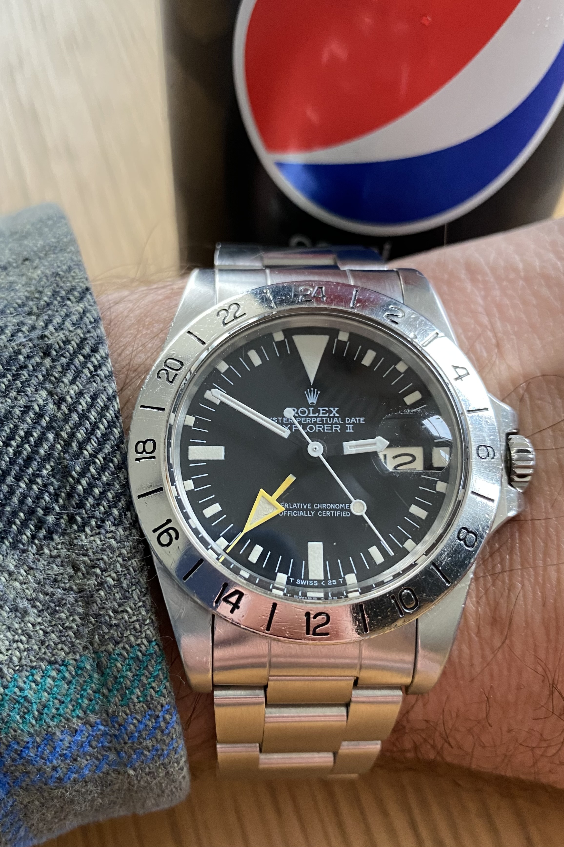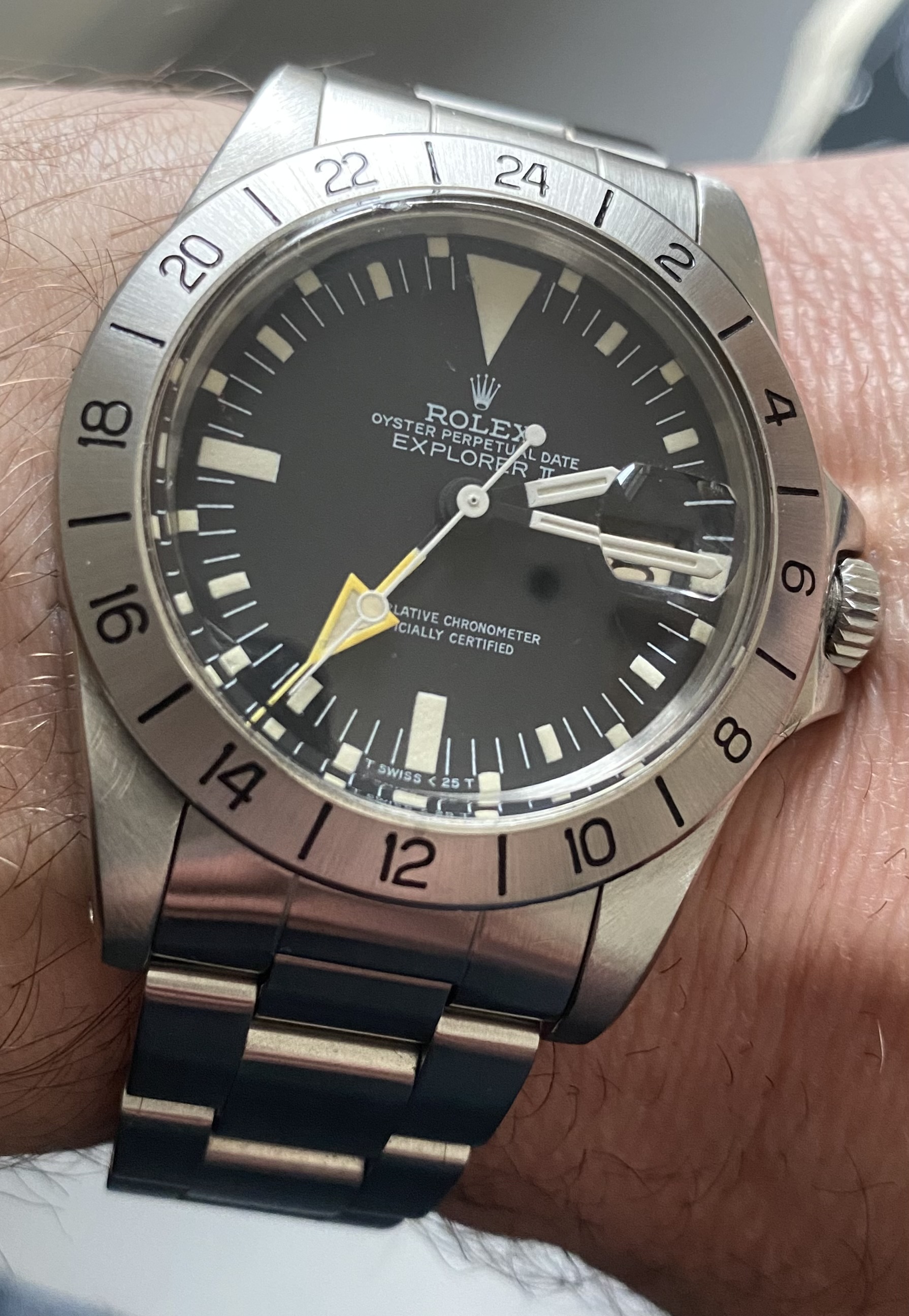 Professionele restauratie van een zeldzame Rolex Explorer II “McQueen” Albino uit de jaren 70, referentie 1655 met gevouwen Rolex Oyster-band en Rolex-kaliber 1570.