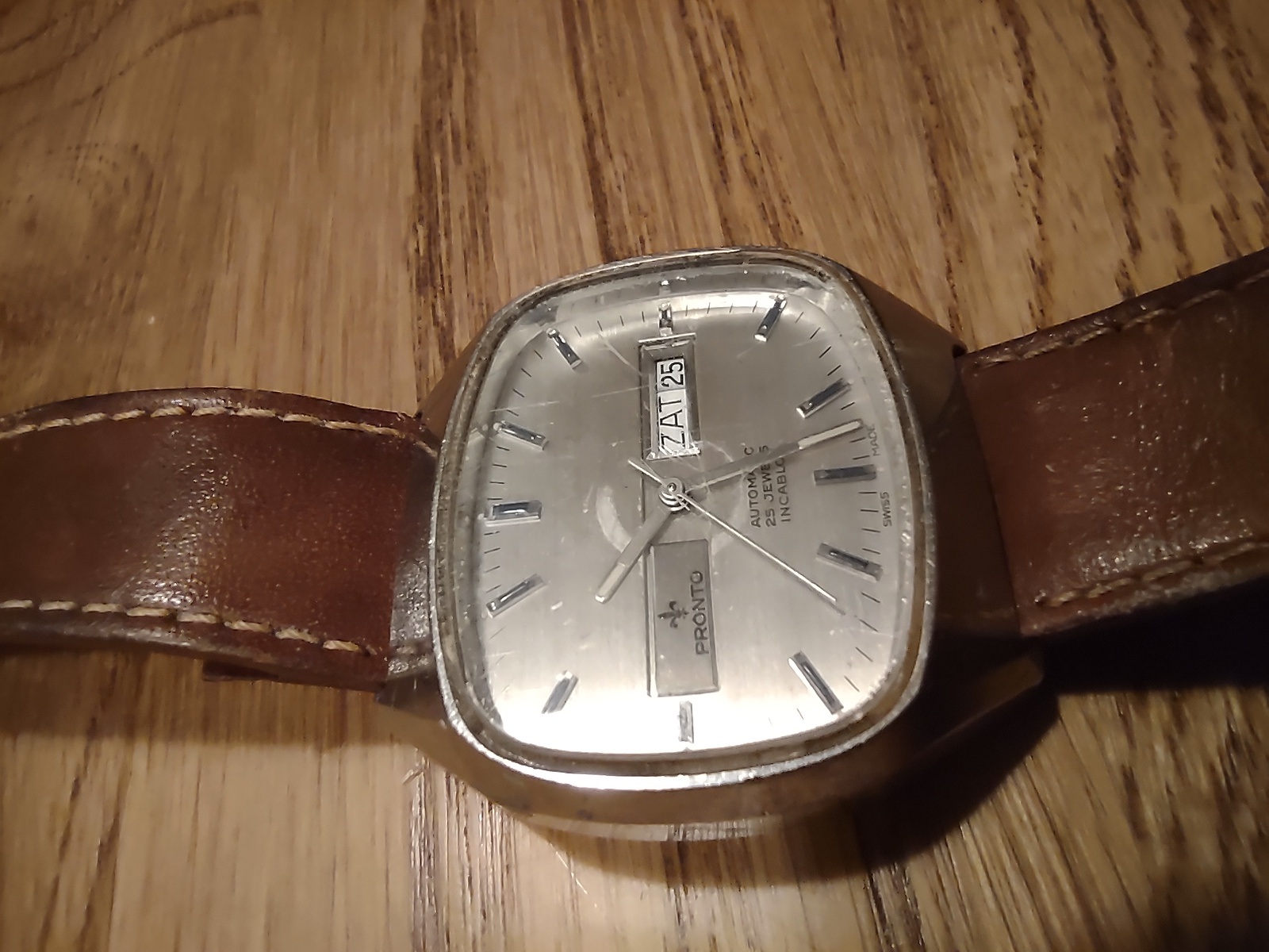 Heel leuke Pronto, zoals eerder geschreven waarschijnlijk met een zeer goed Zwitsers uurwerk vermoedelijk ETA. Ik wil je best helpen om het horloge open te maken. (Omgeving Amsterdam)