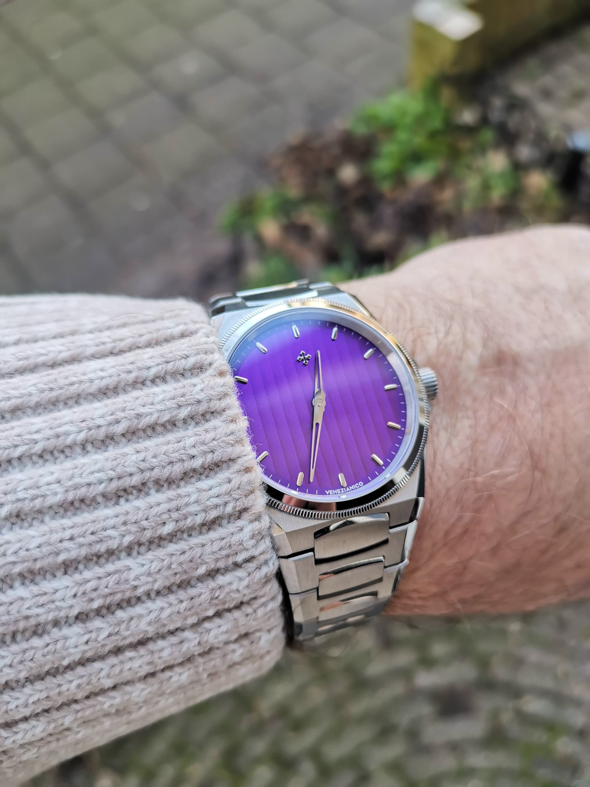 Het mooiste paars hier voor mij,hoewel ikzelf het geen kleur vindt voor een horloge,lijkt mij een vluchtige bevlieging.